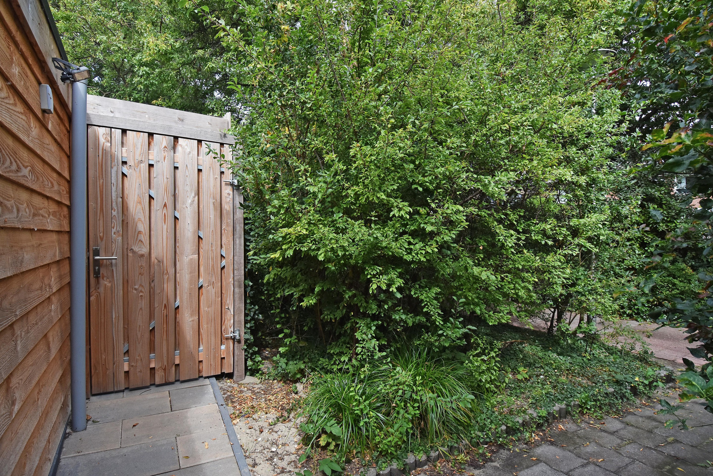 Via de woonkamer is er toegang tot de zonnige, verzorgd aangelegde achtertuin( 2024) met sfeervolle overkapping, ruime berging, achterom en uitzicht op het groen.