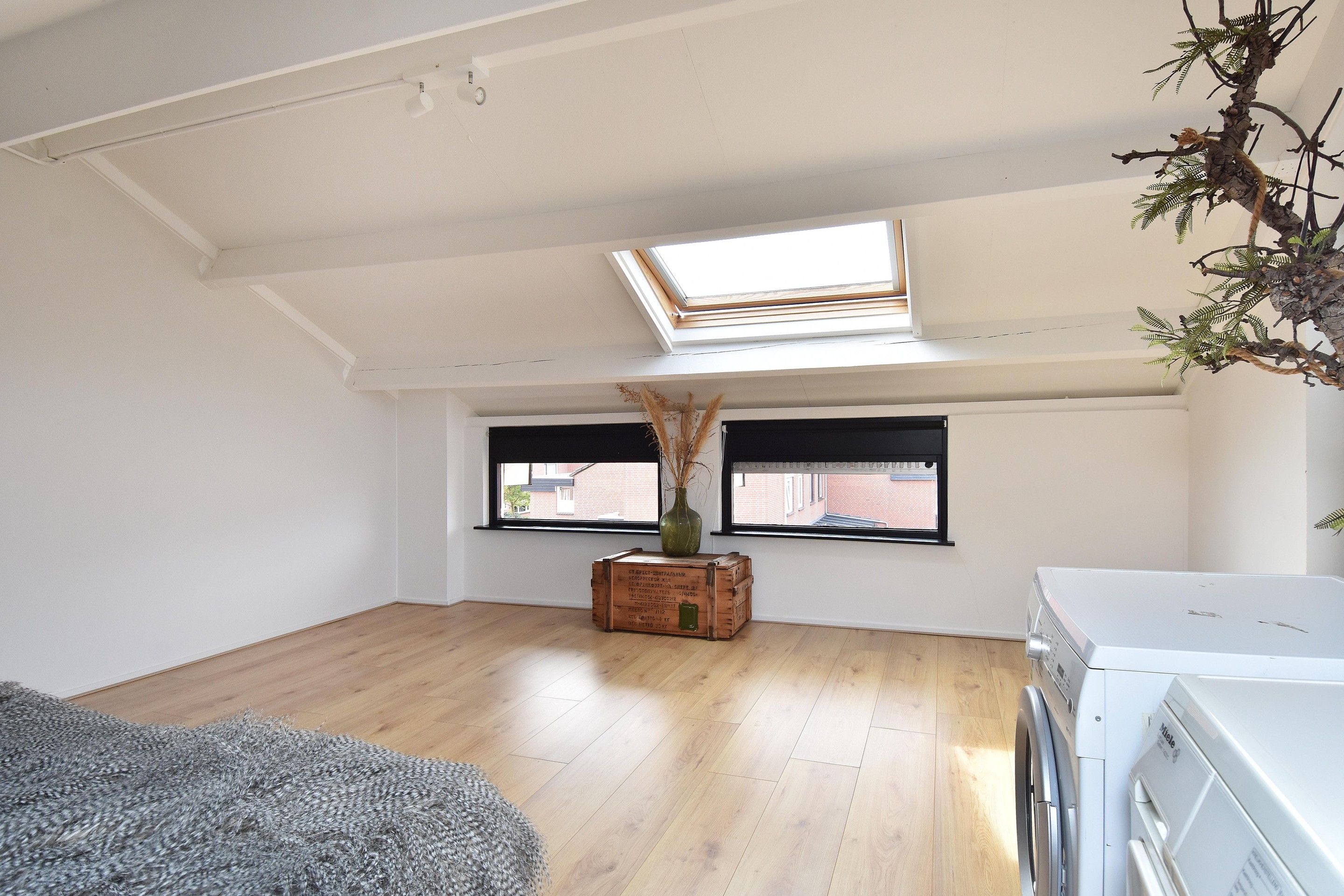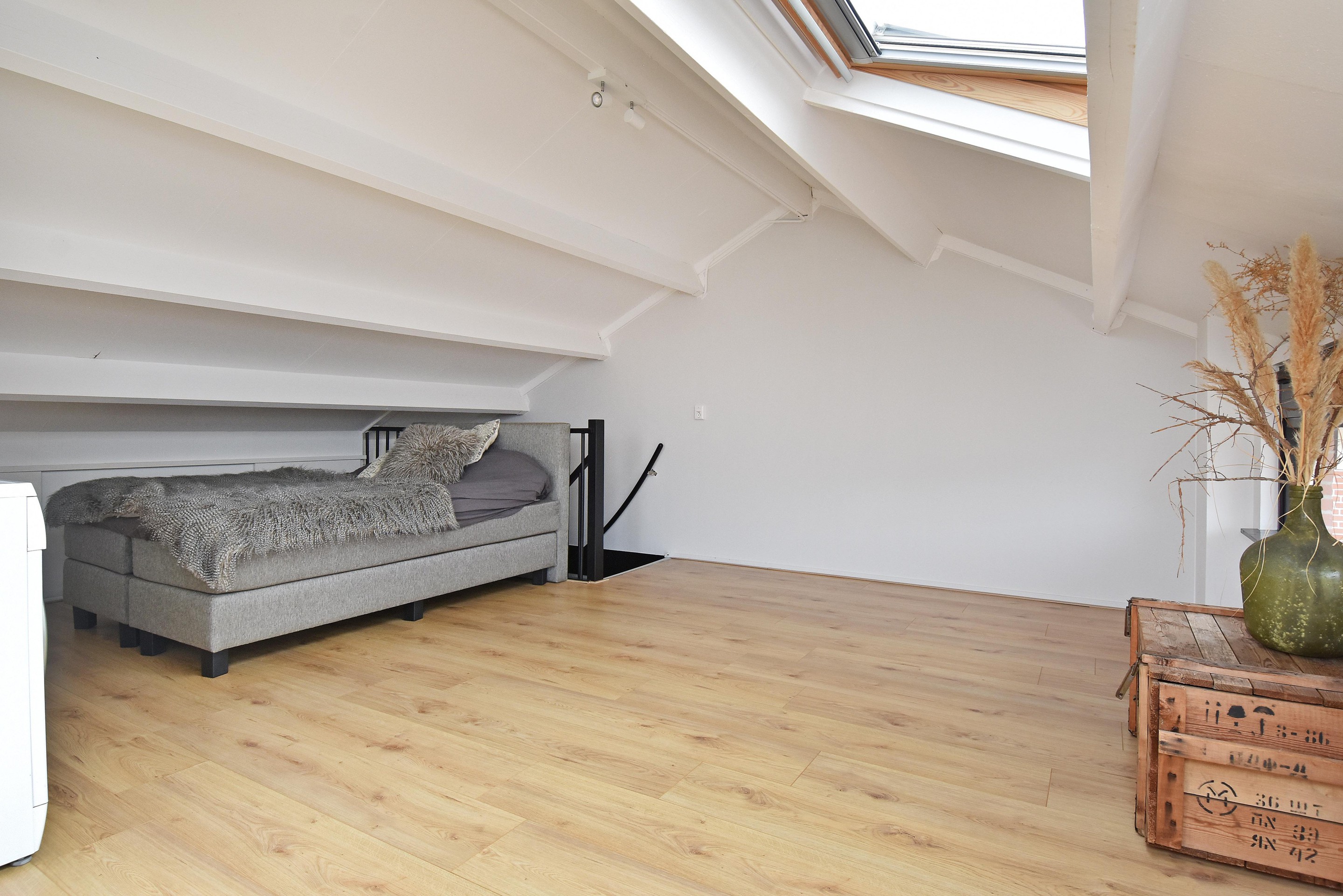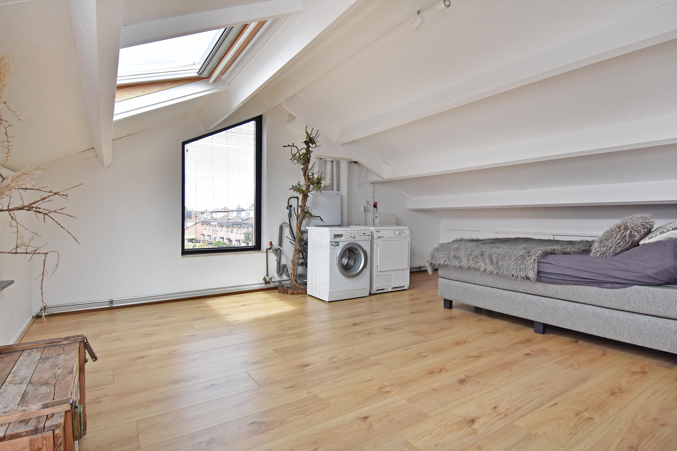 Via de vaste trap toegang tot de zolderverdieping met wasruimte en opstelplaats voor de cv-ketel. Hier bevindt zich tevens de vierde slaapkamer. Indien gewenst kan de ruimte verder vergroot worden door het plaatsen van een dakkapel.