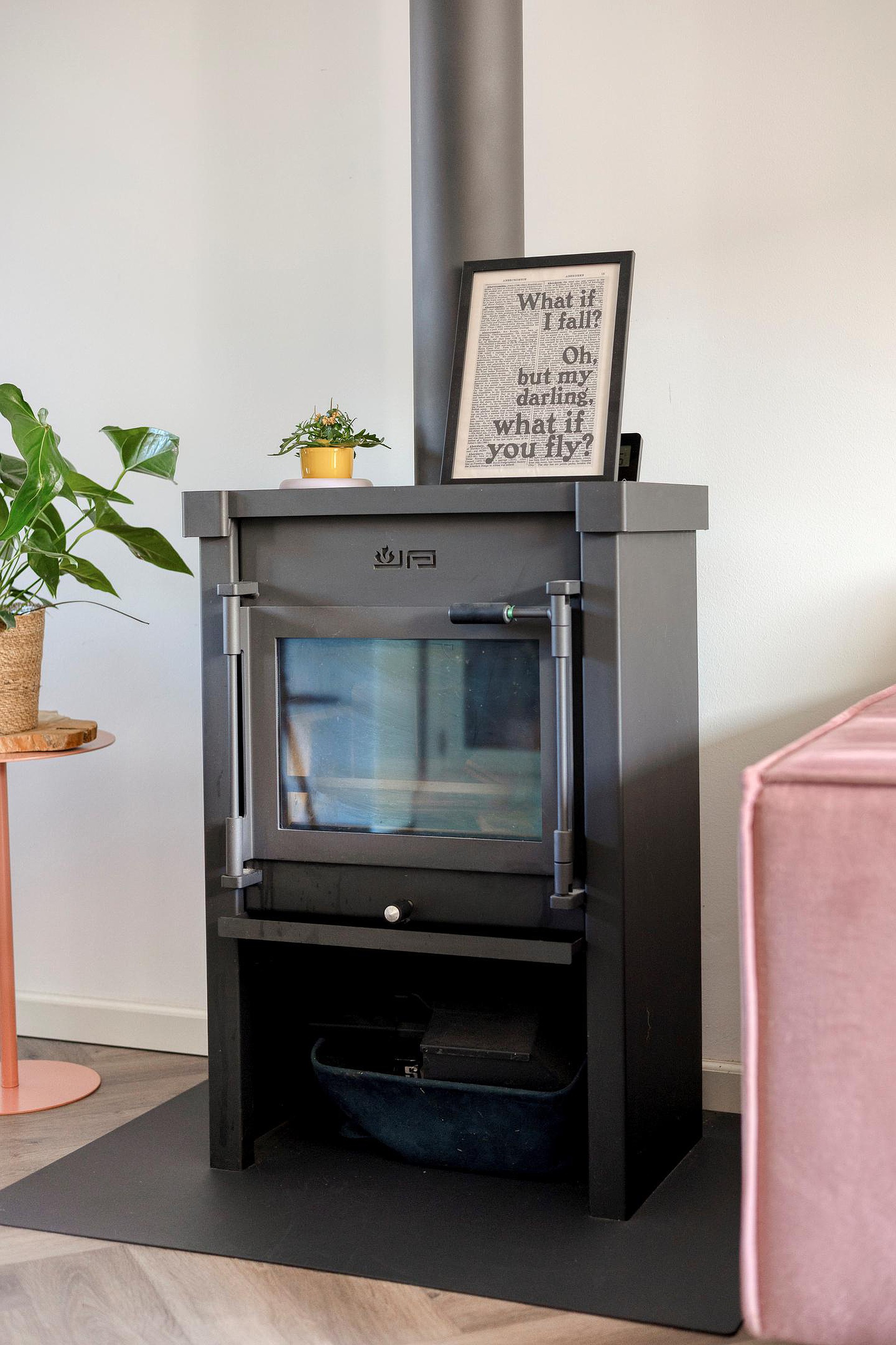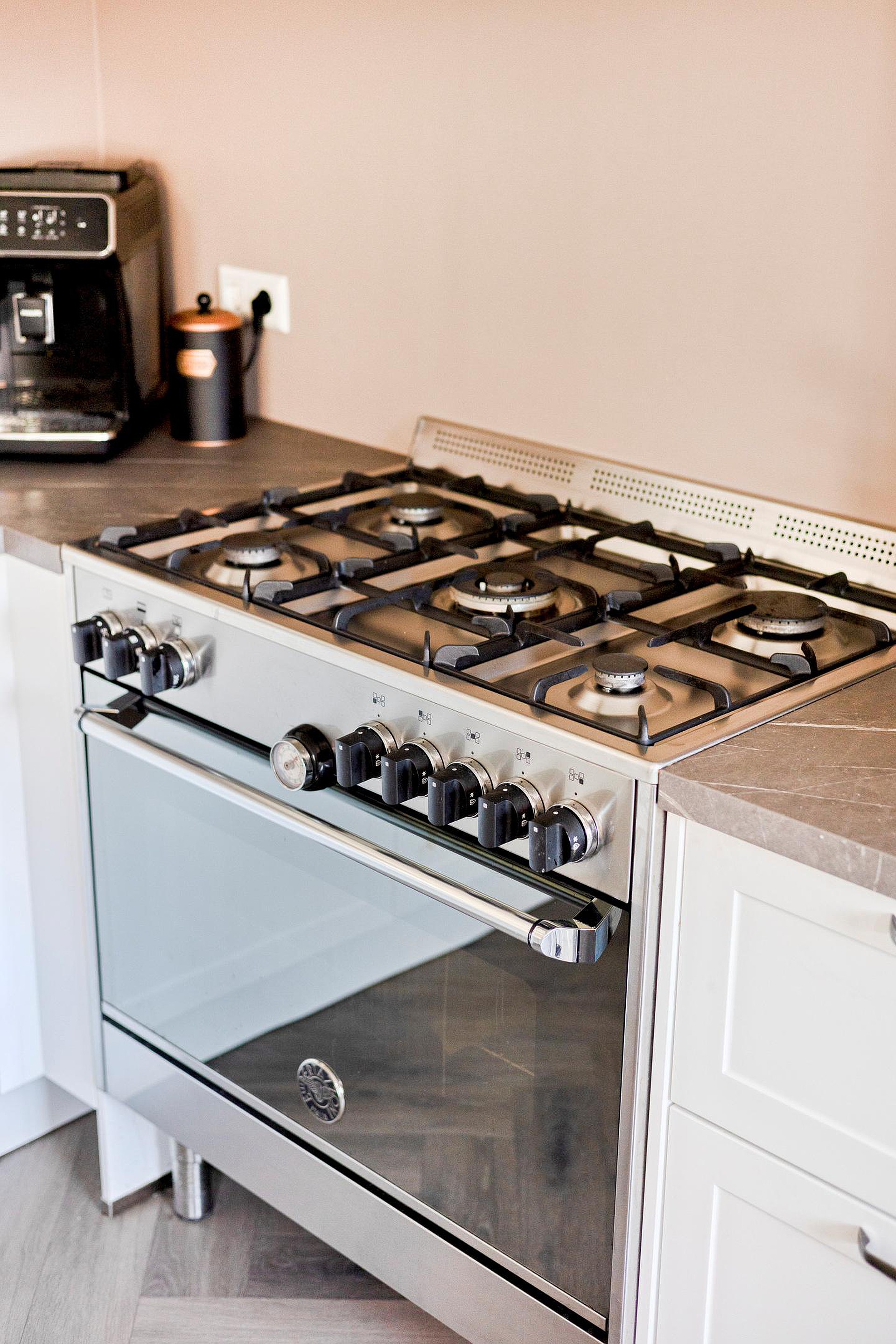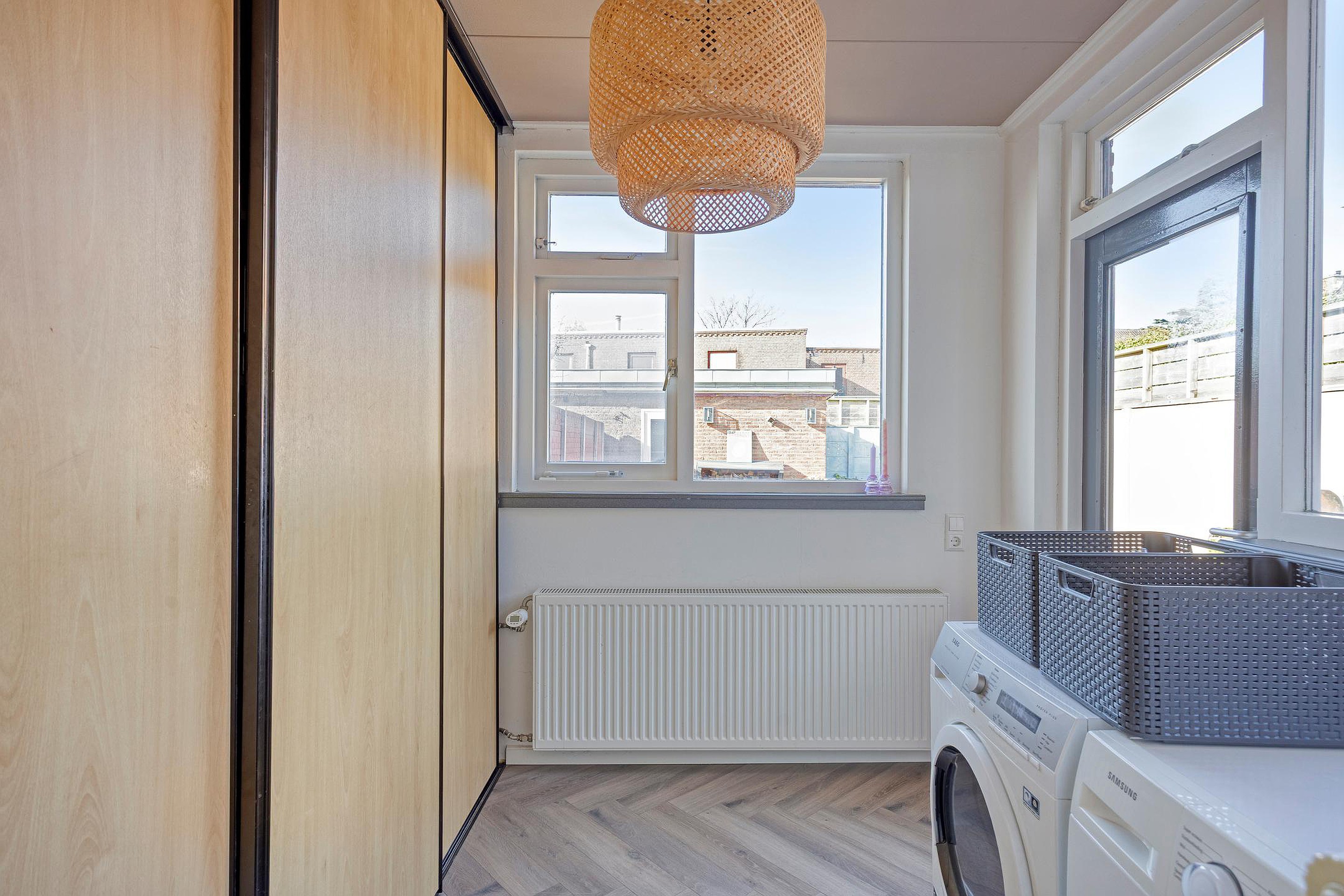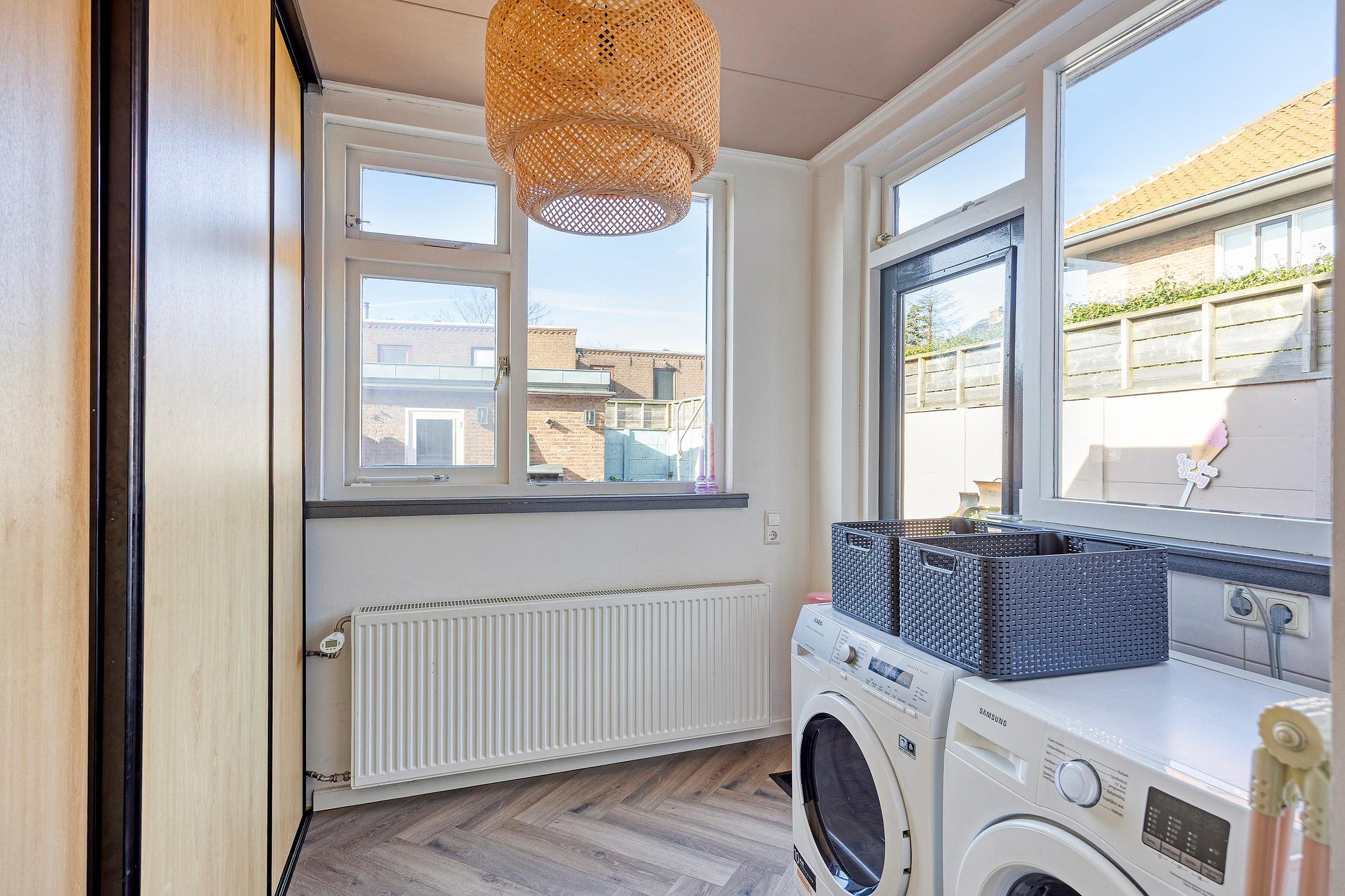 Begane grond: entree, hal met meterkast, toilet met een fonteintje, ruime en lichte doorzonwoonkamer met een houtkachel, openslaande deuren, moderne halfopen keuken met een schiereiland en diverse inbouwapparaten, wasruimte met opstelplaats wasmachine-droger, vaste kast en een loopdeur naar de zonnige tuin met een vrijstaande stenen berging en achterom.