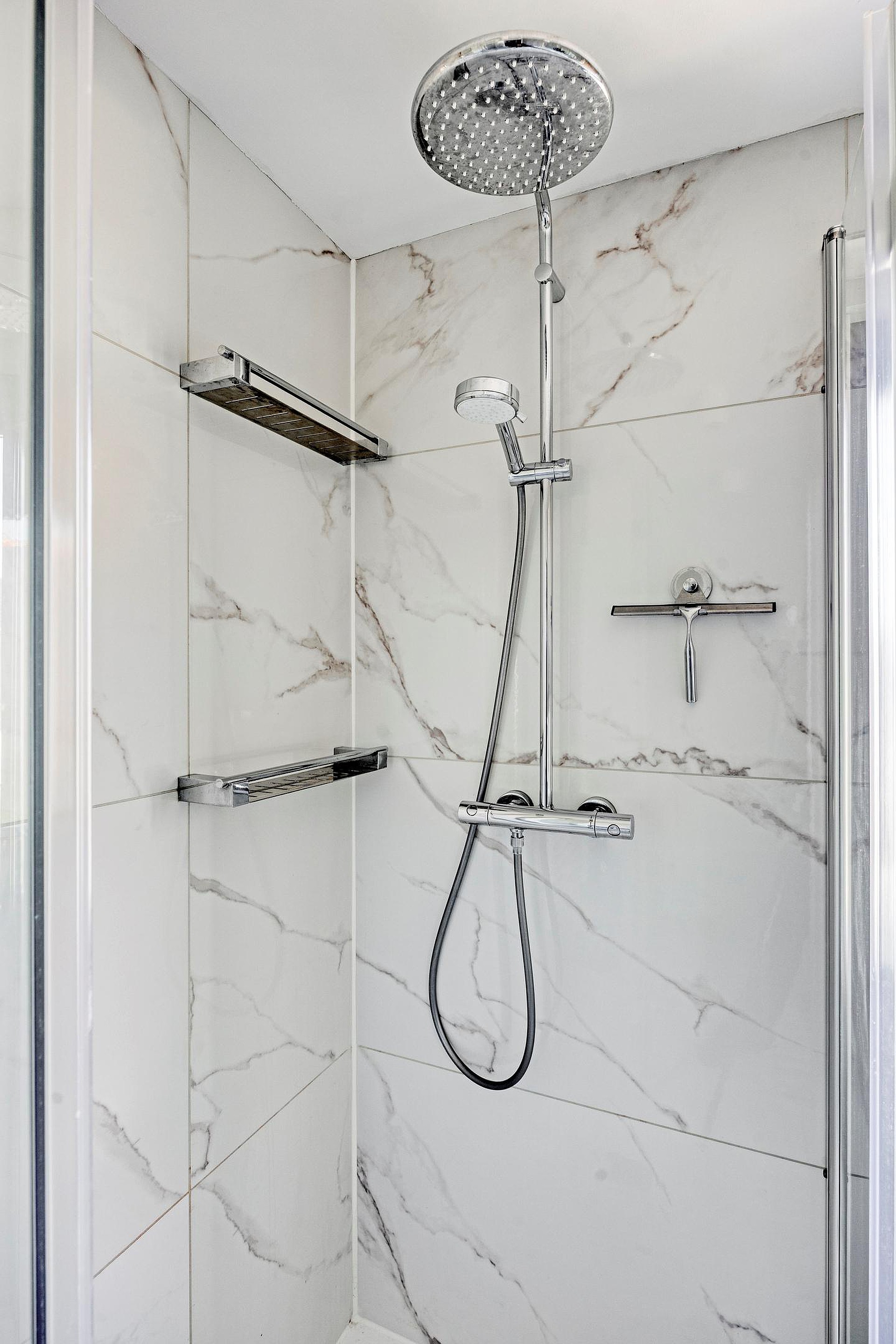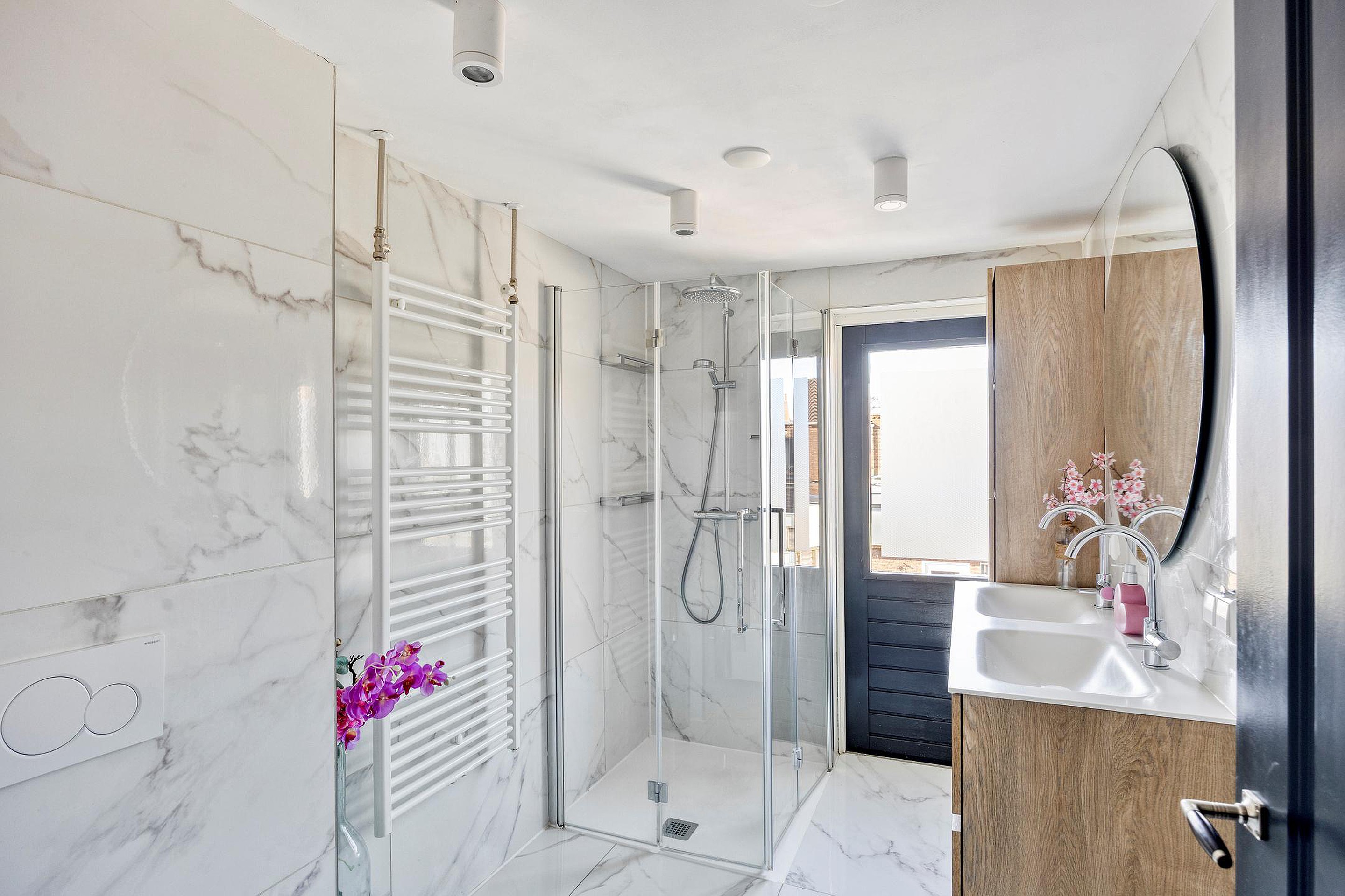 1e verdieping: overloop, 2 ruime slaapkamers waarvan één met een vaste kast en 2 slaapkamers met airconditioning, luxe badkamer met een inloopdouche, wastafelmeubel, 2e toilet en een loopdeur.