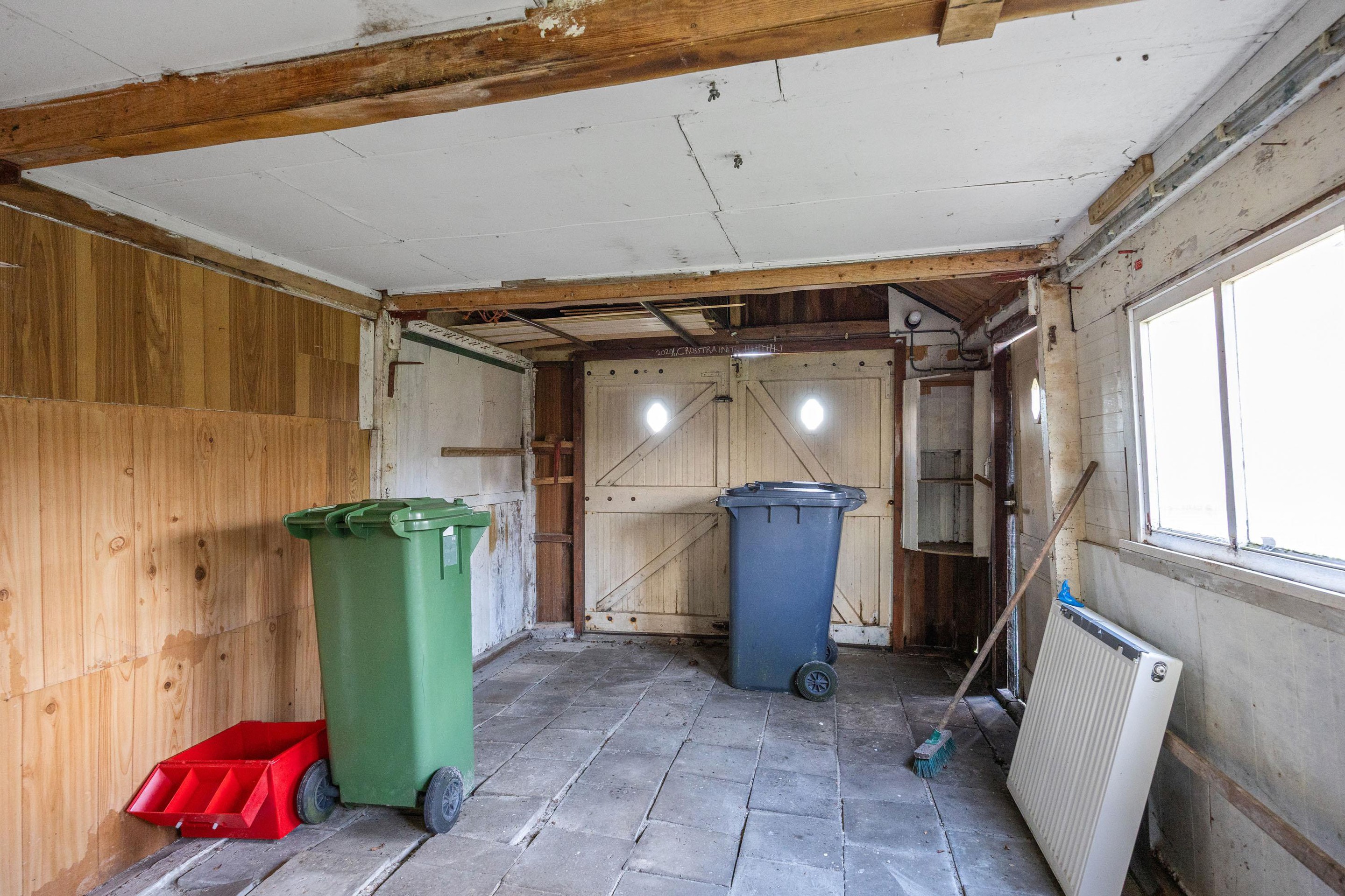 Buiten treft u een diepe, groene achtertuin met veel privacy. Op het perceel bevinden zich tevens een houten garage met berging, ideaal voor opslag of hobbygebruik.