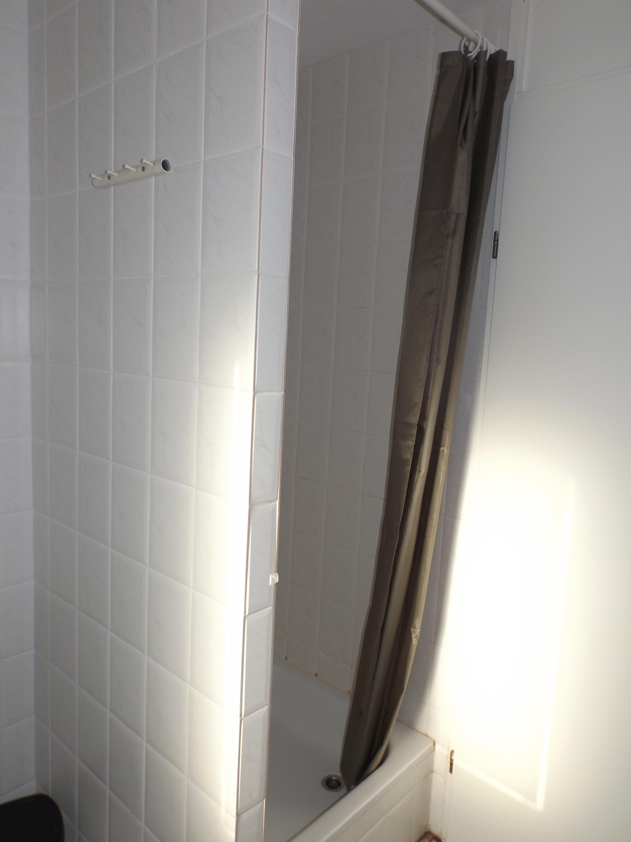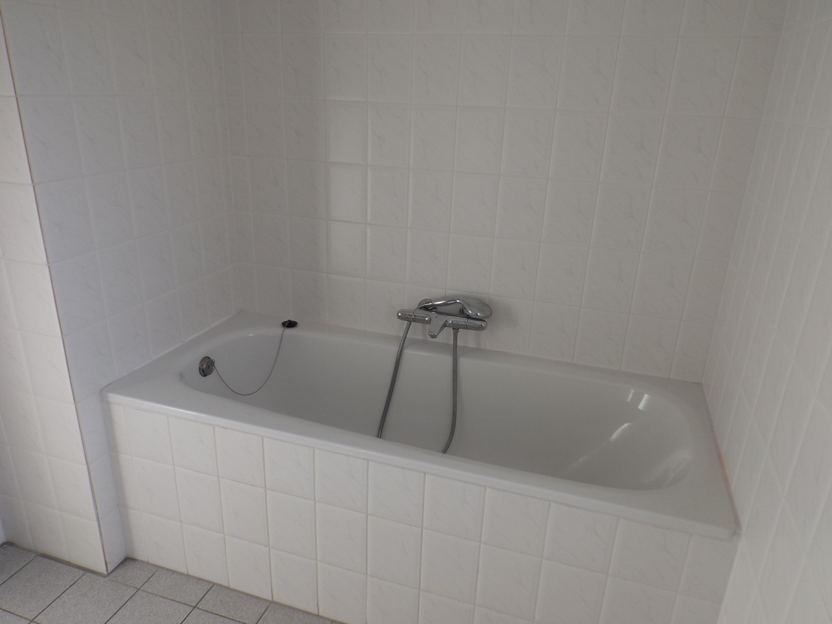 De badkamer, uitgevoerd in een lichte kleurstelling, is voorzien van een ligbad, een douche en een wastafel.