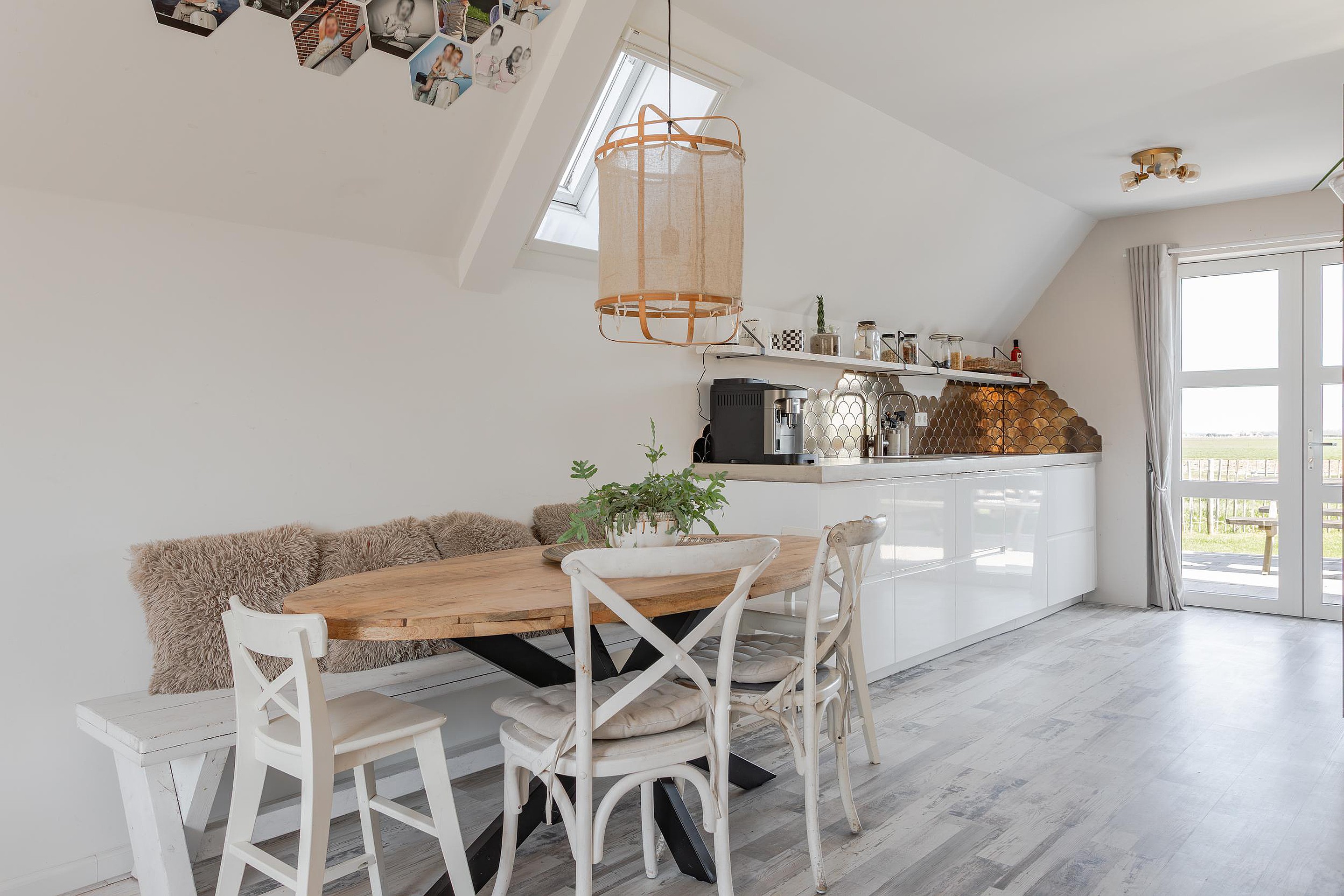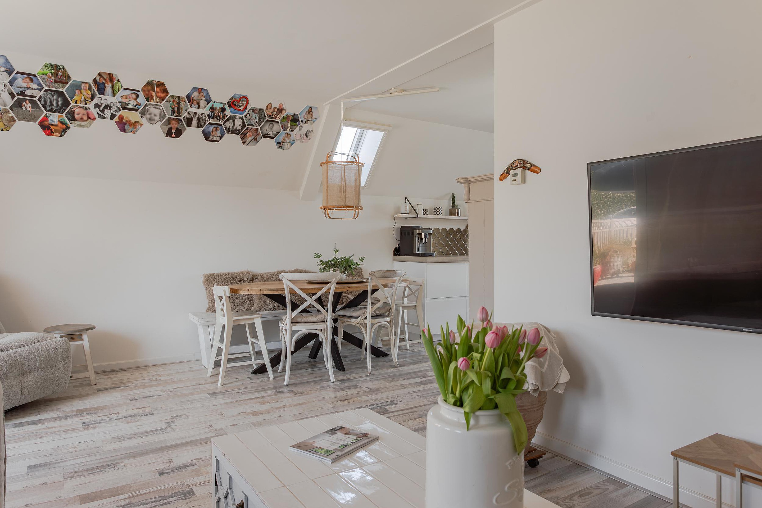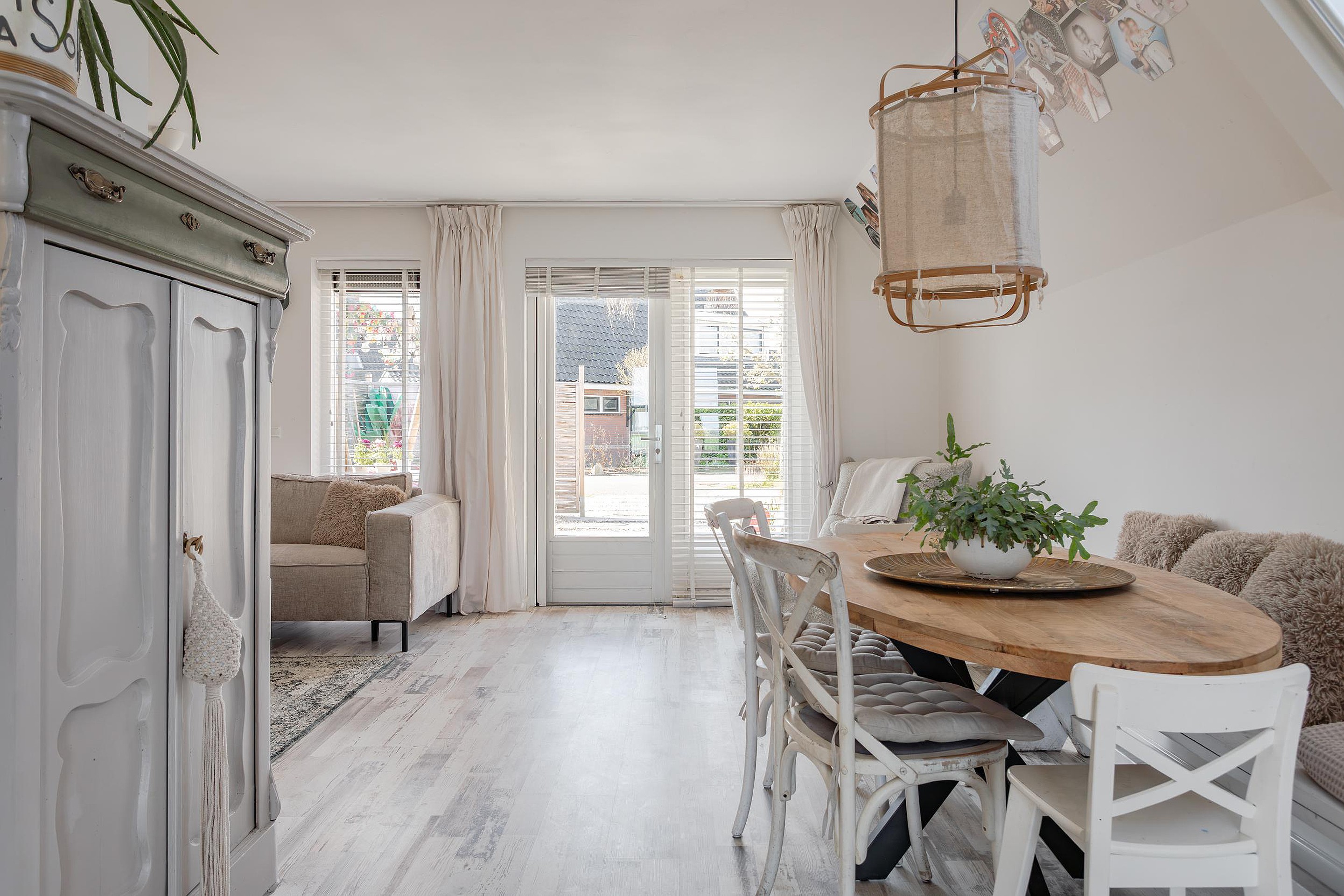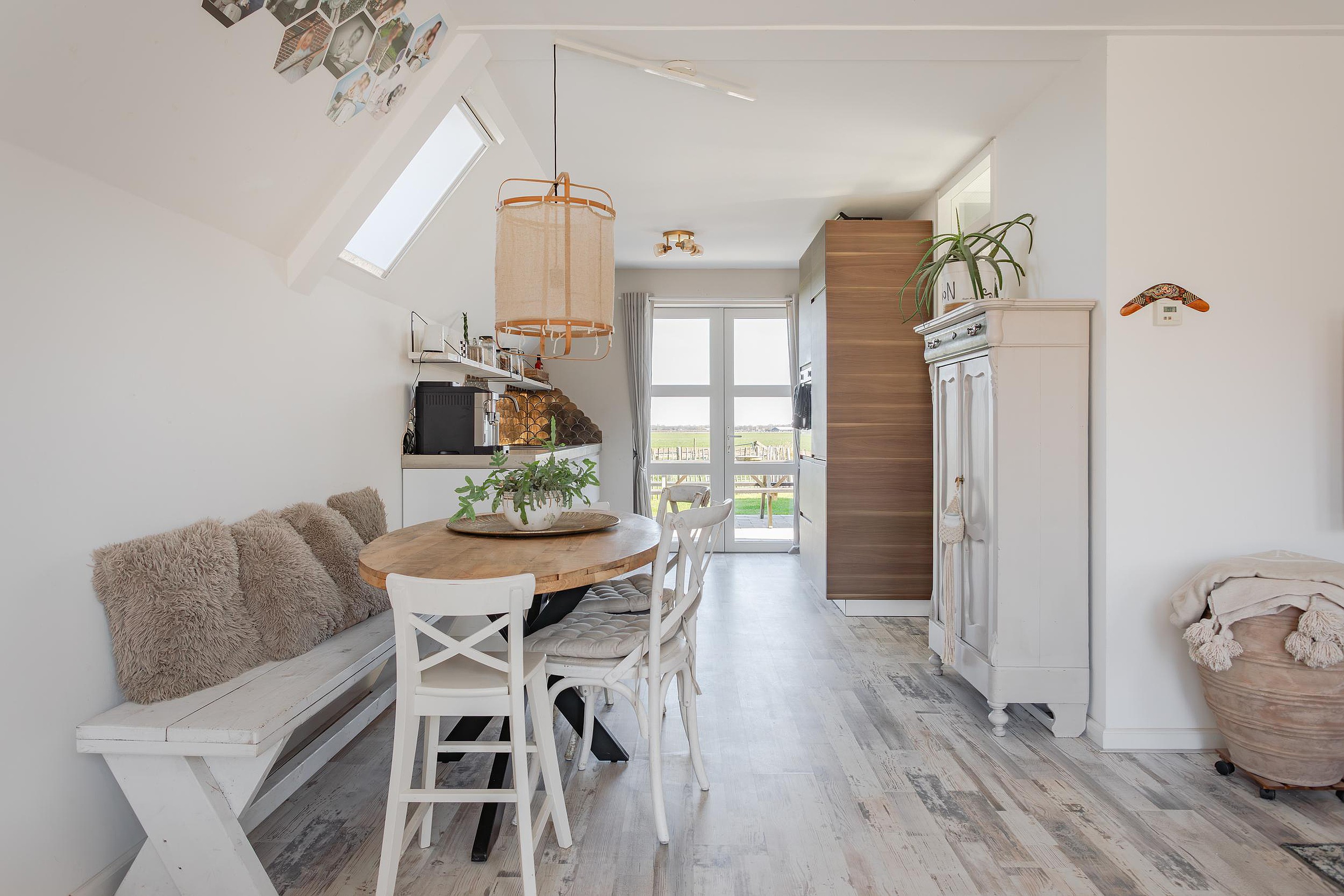 Gezellige living met openslaande deuren en hor naar het grote terras aan de voorzijde van de woning. Bij de aankoop in 2023 zijn de muren verhoogd en geïsoleerd. De wanden en het plafond zijn strak gestuukt en op de vloer ligt laminaat met vloerverwarming. Er is veel lichtinval vanwege de 2 ramen met ventilatieroosters tot aan de vloer en het Velux raam met hor bij de eethoek.