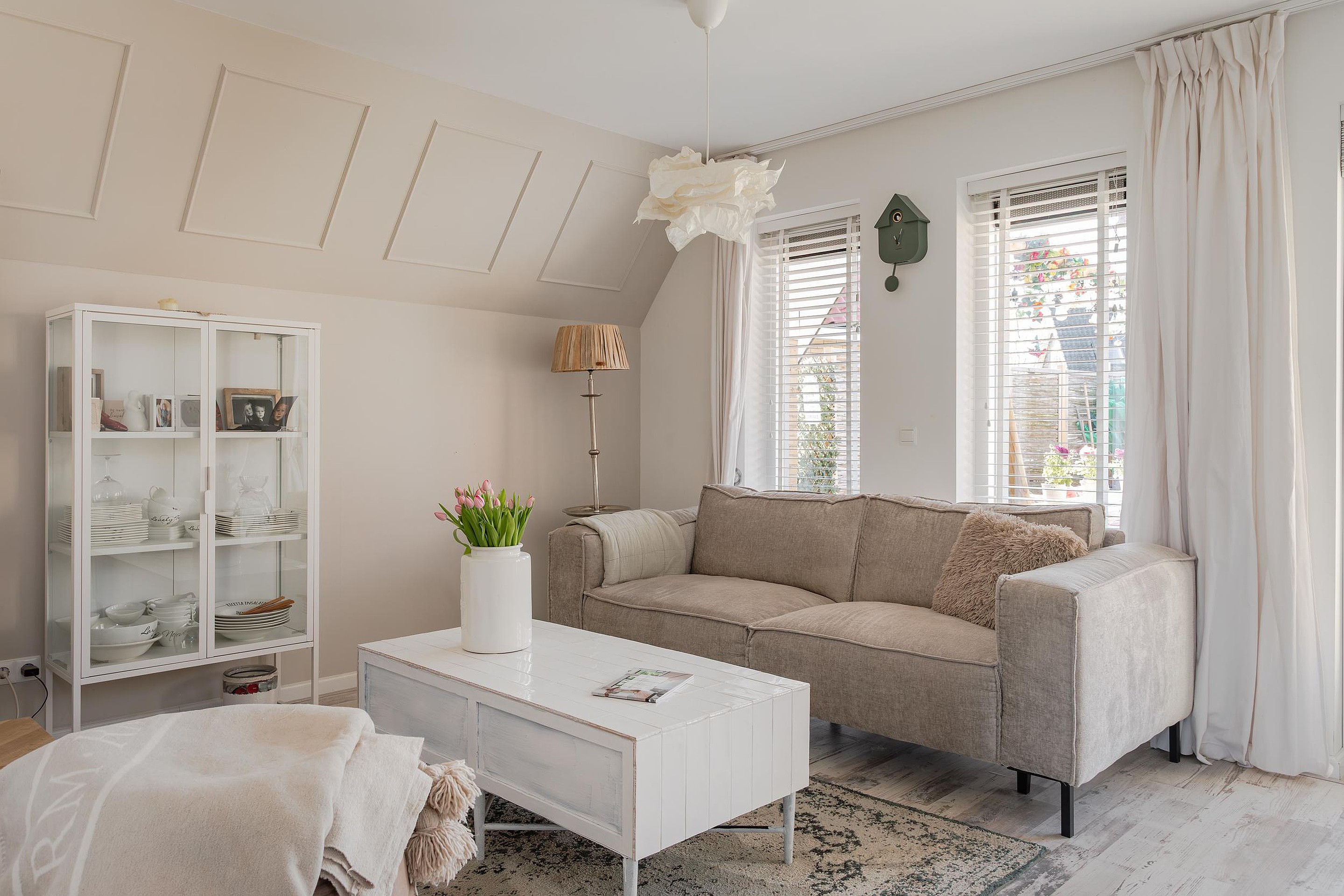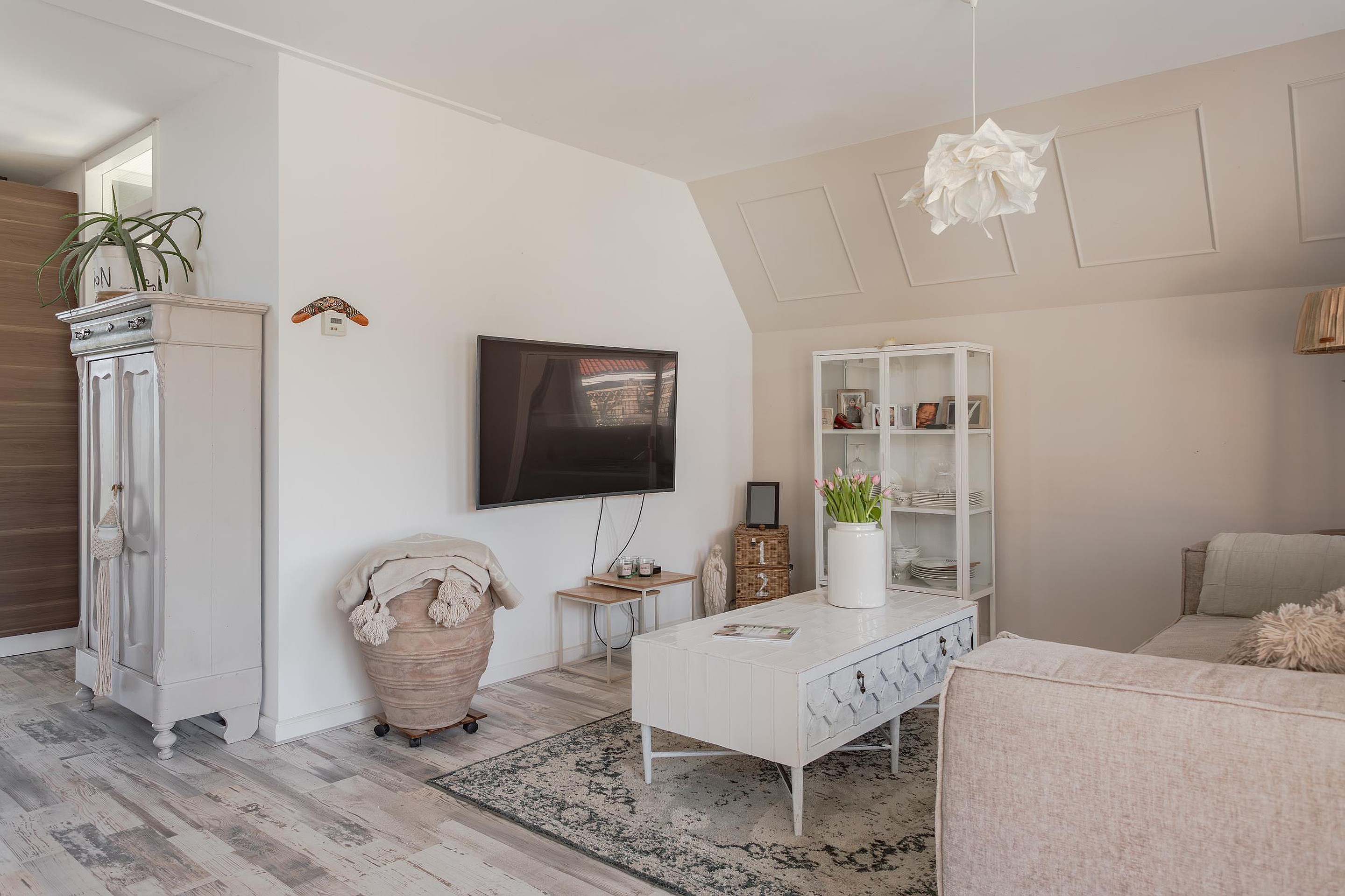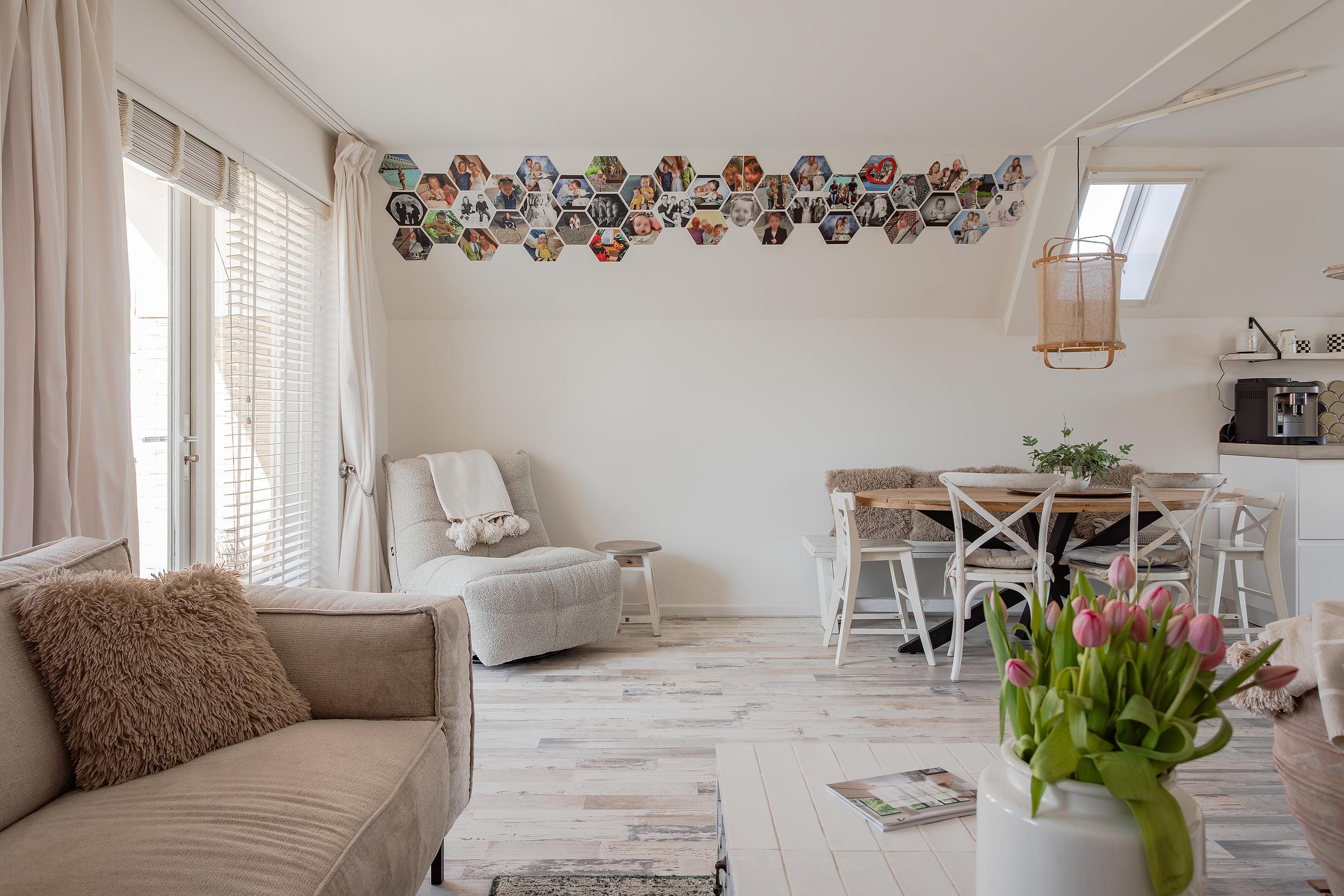 Gezellige living met openslaande deuren en hor naar het grote terras aan de voorzijde van de woning. Bij de aankoop in 2023 zijn de muren verhoogd en geïsoleerd. De wanden en het plafond zijn strak gestuukt en op de vloer ligt laminaat met vloerverwarming. Er is veel lichtinval vanwege de 2 ramen met ventilatieroosters tot aan de vloer en het Velux raam met hor bij de eethoek.