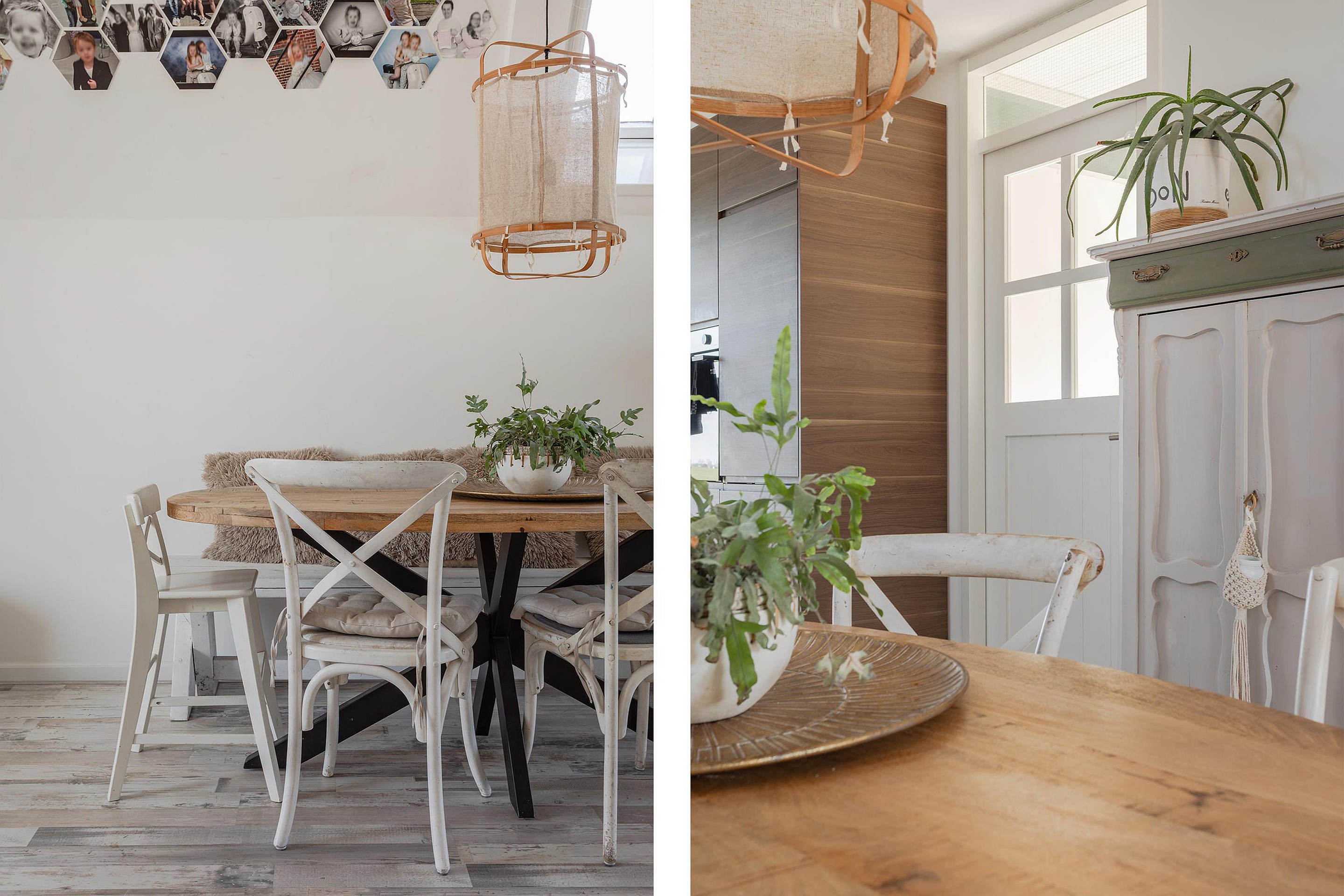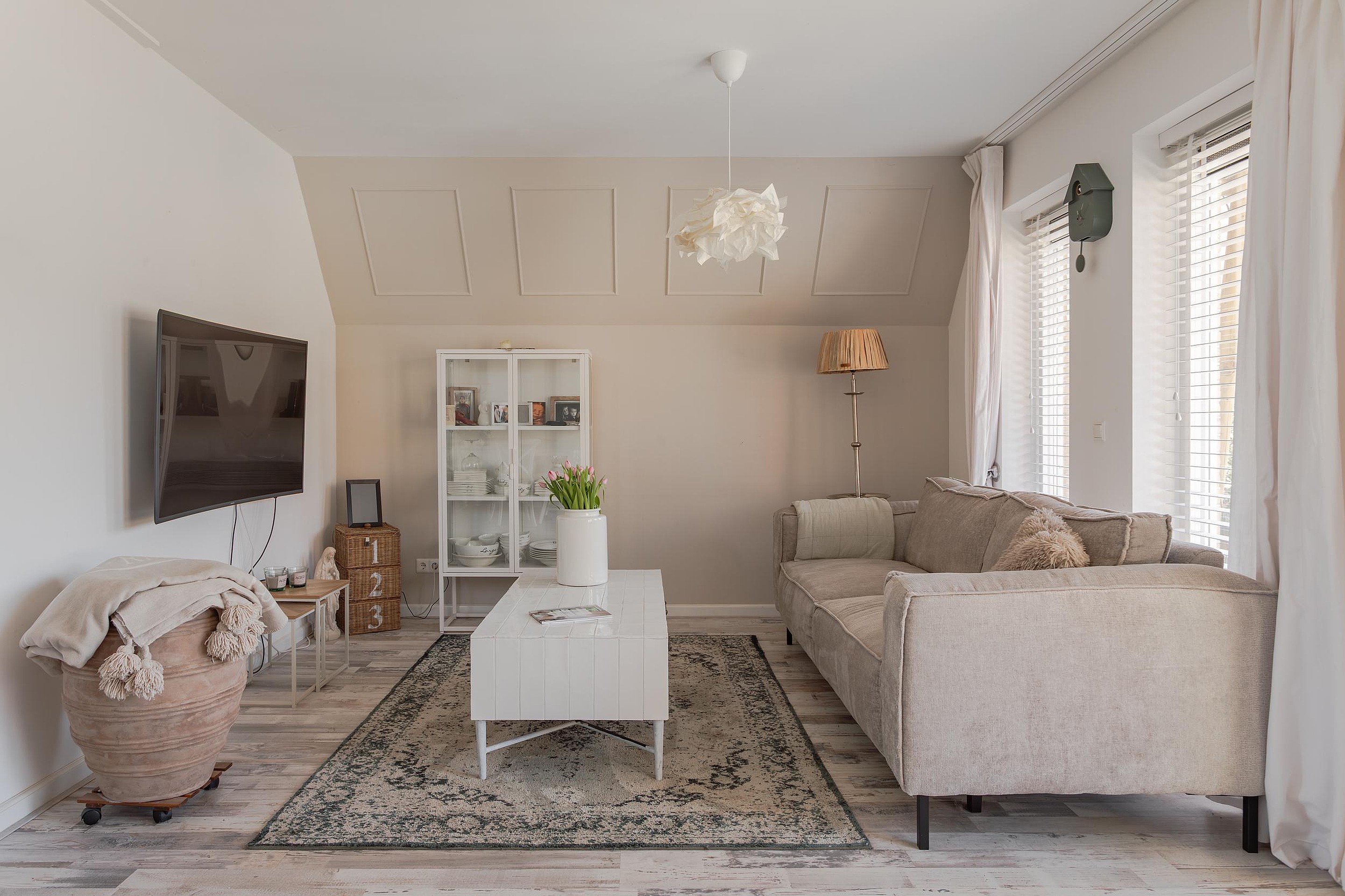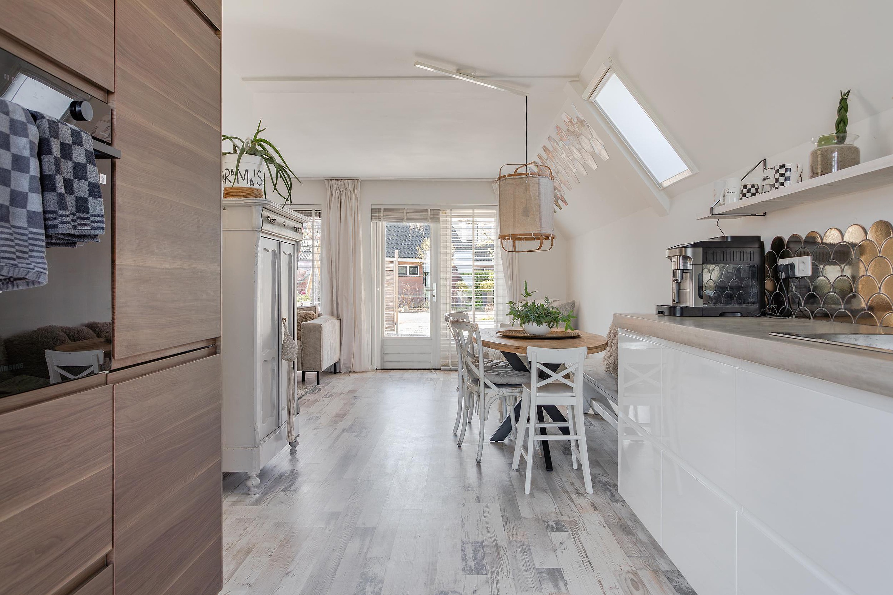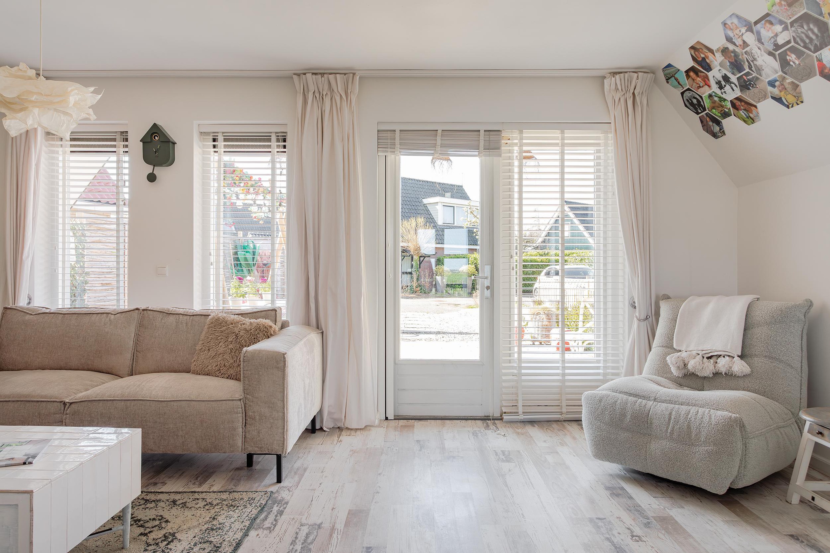 Gezellige living met openslaande deuren en hor naar het grote terras aan de voorzijde van de woning. Bij de aankoop in 2023 zijn de muren verhoogd en geïsoleerd. De wanden en het plafond zijn strak gestuukt en op de vloer ligt laminaat met vloerverwarming. Er is veel lichtinval vanwege de 2 ramen met ventilatieroosters tot aan de vloer en het Velux raam met hor bij de eethoek.