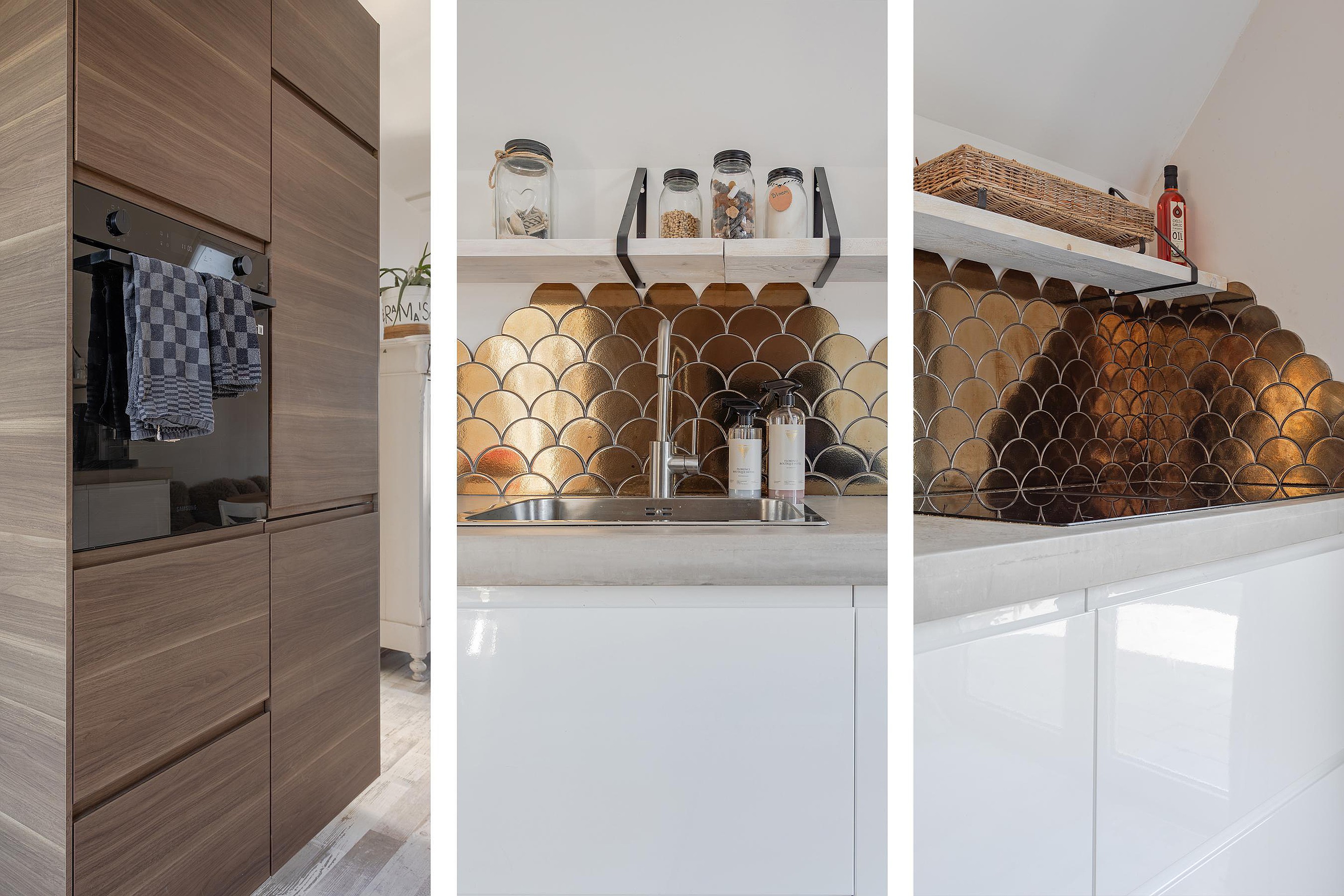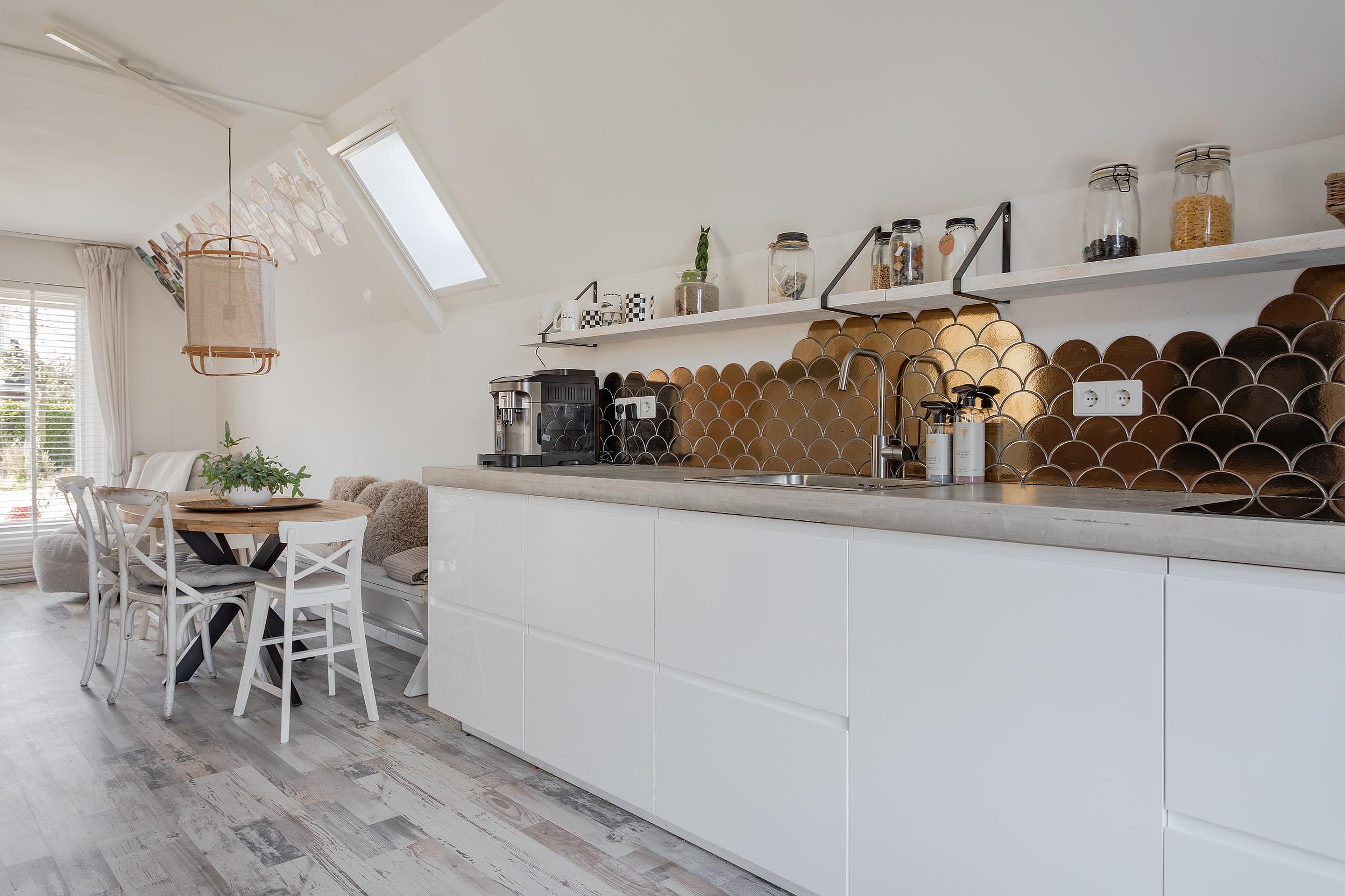 Begin 2024 is deze moderne keuken geplaatst met een hoog werkblad uitgevoerd in beton cire. Er zijn veel laden, speelse wandtegels, veel stopcontacten en diverse inbouwapparatuur, zoals: de vaatwasser en een inductie kookplaat met geïntegreerde afzuiger met de afvoer naar buiten. In het wandmeubel is ook nog veel kastruimte en daarin zijn de koel/vriescombinatie en de grote oven geplaatst.