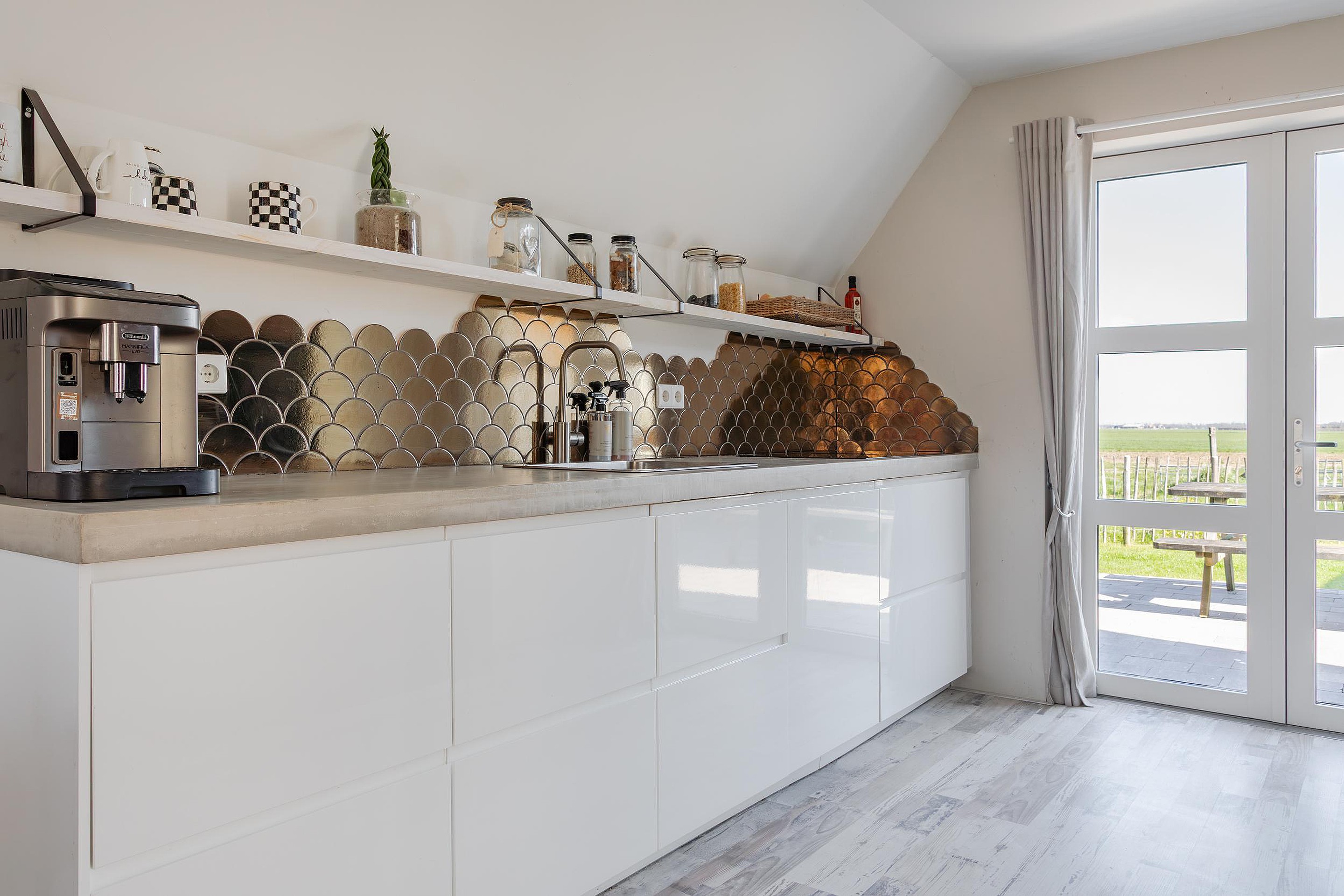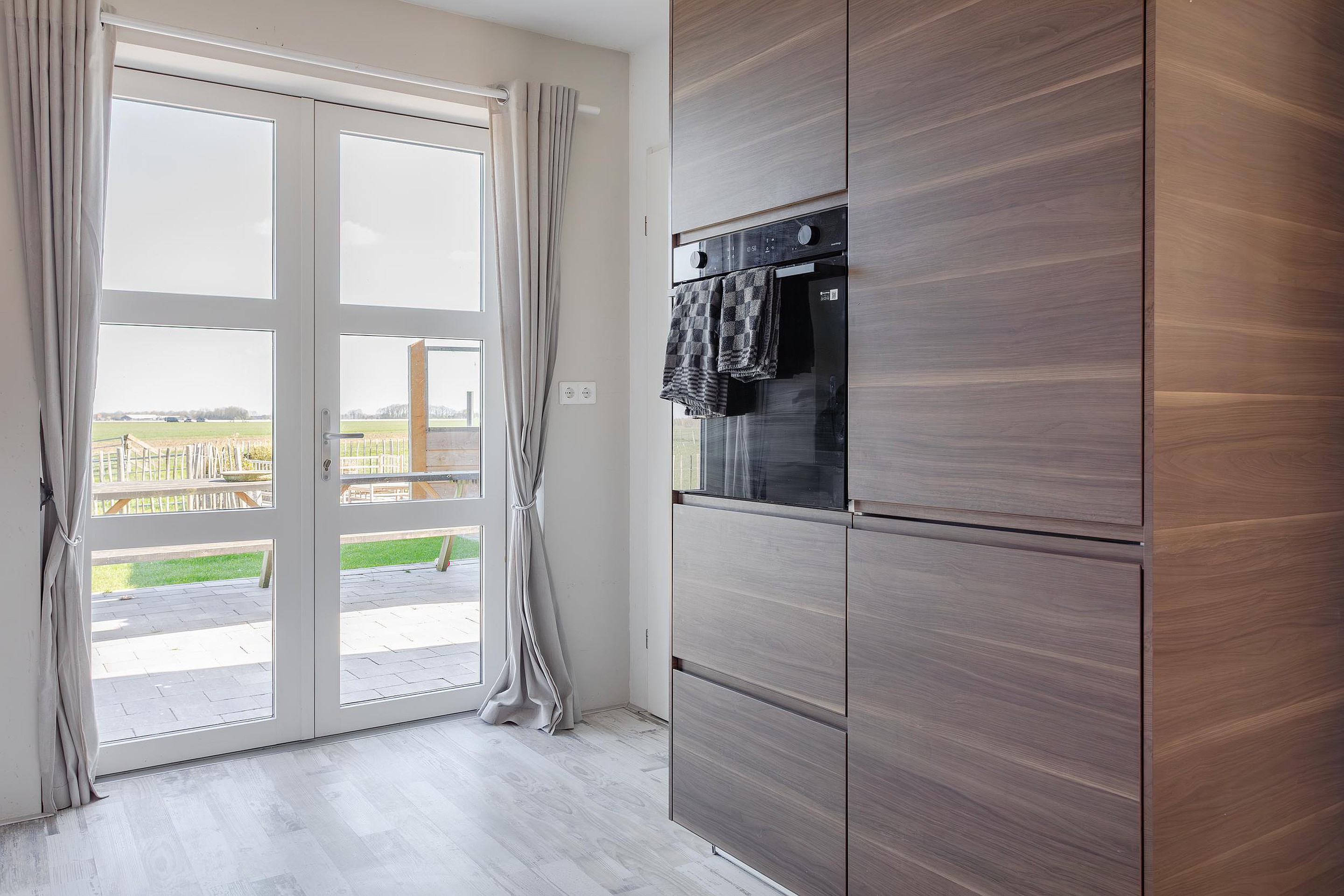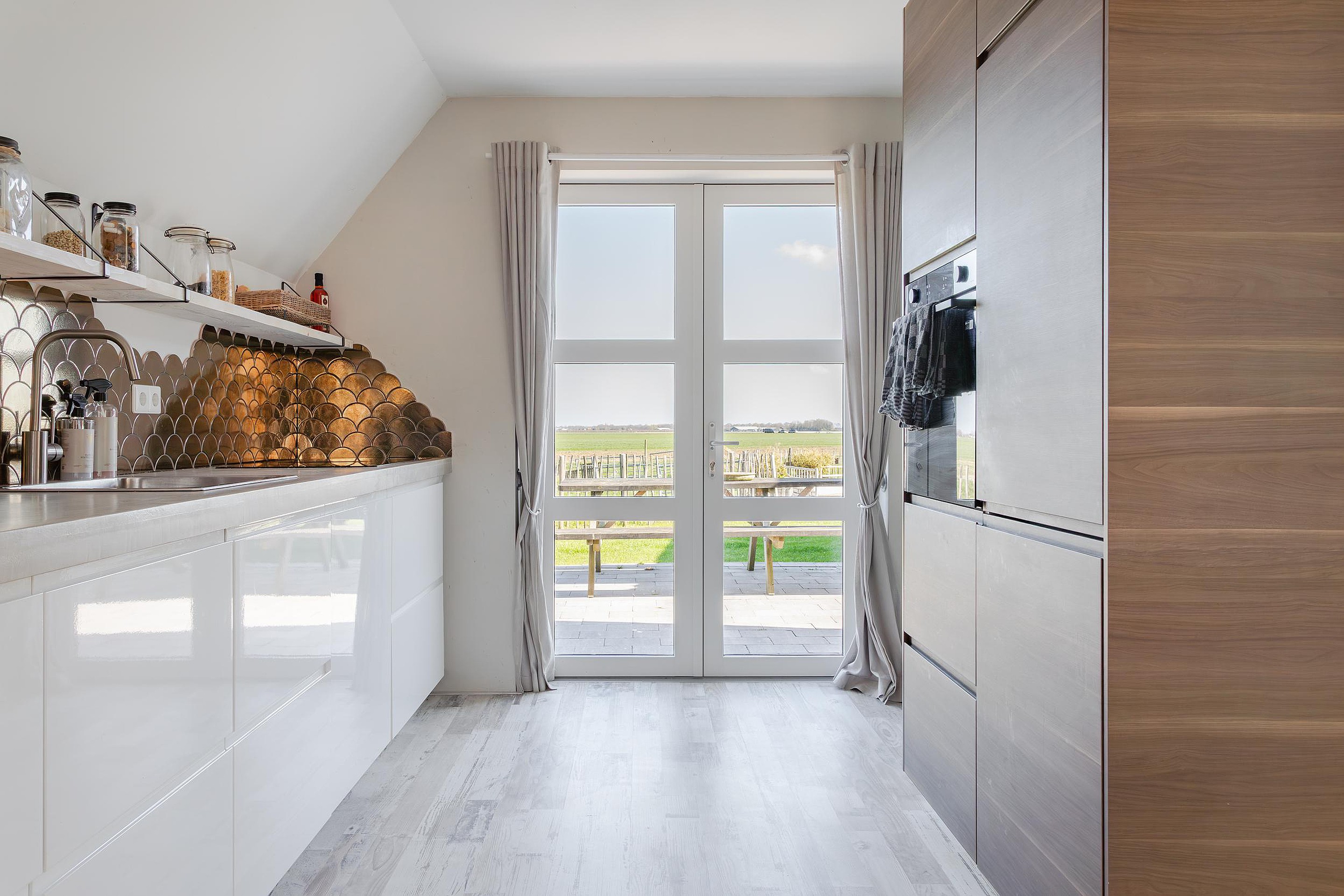 Vanuit de keuken zijn nieuwe kunststof openslaande deuren naar de tuin geplaatst en geniet u tijdens het koken van een prachtig uitzicht over de weilanden.