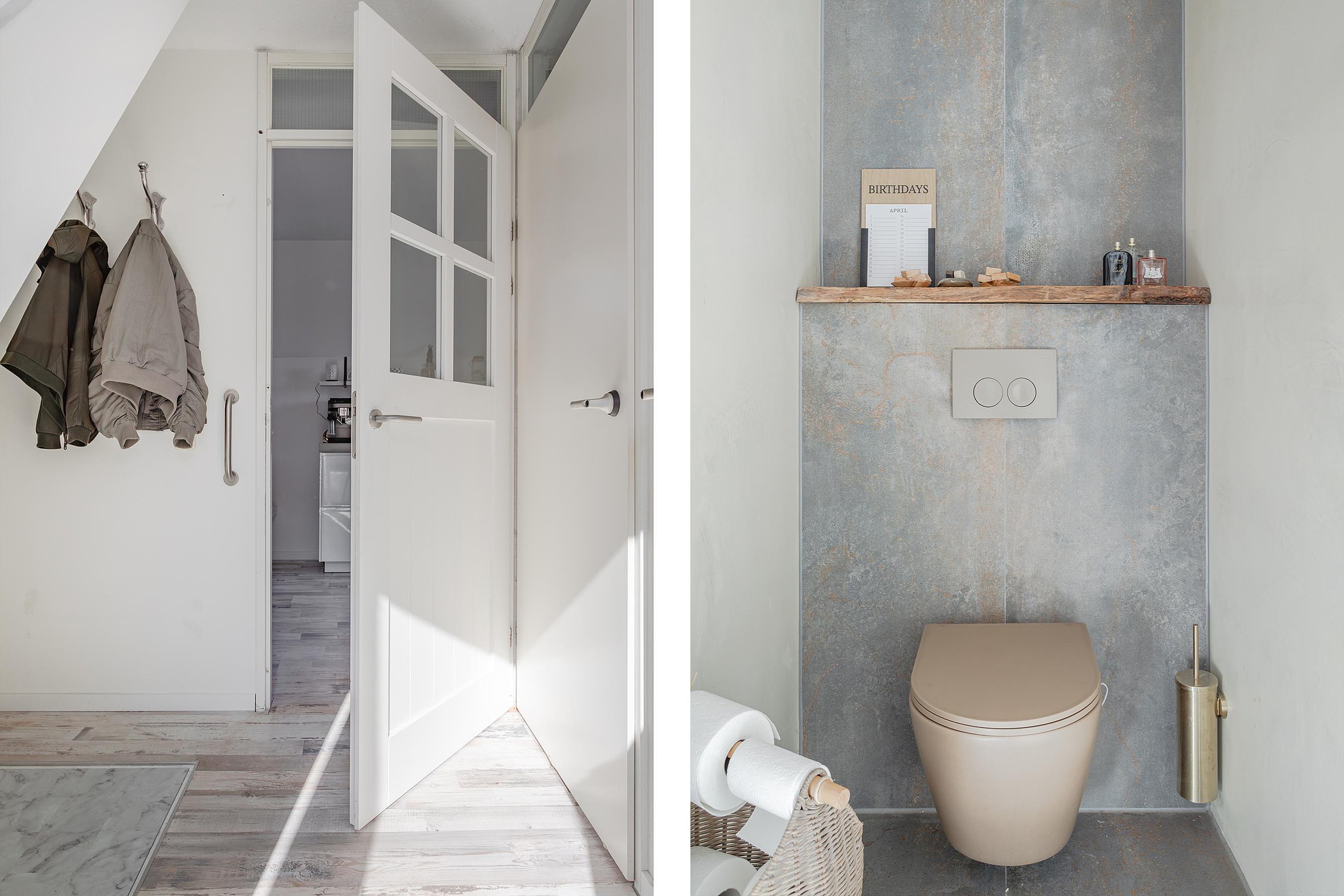 Vanuit de keuken geeft een paneeldeur met roederamen toegang tot de hal met de zijentree, trapopgang, de kelder, badkamer en het toilet. De toiletruimte is in 2024 vernieuwd met beton cire wanden en plafond, stijlvolle wandtegels achter het wandcloset en centrale afzuiging