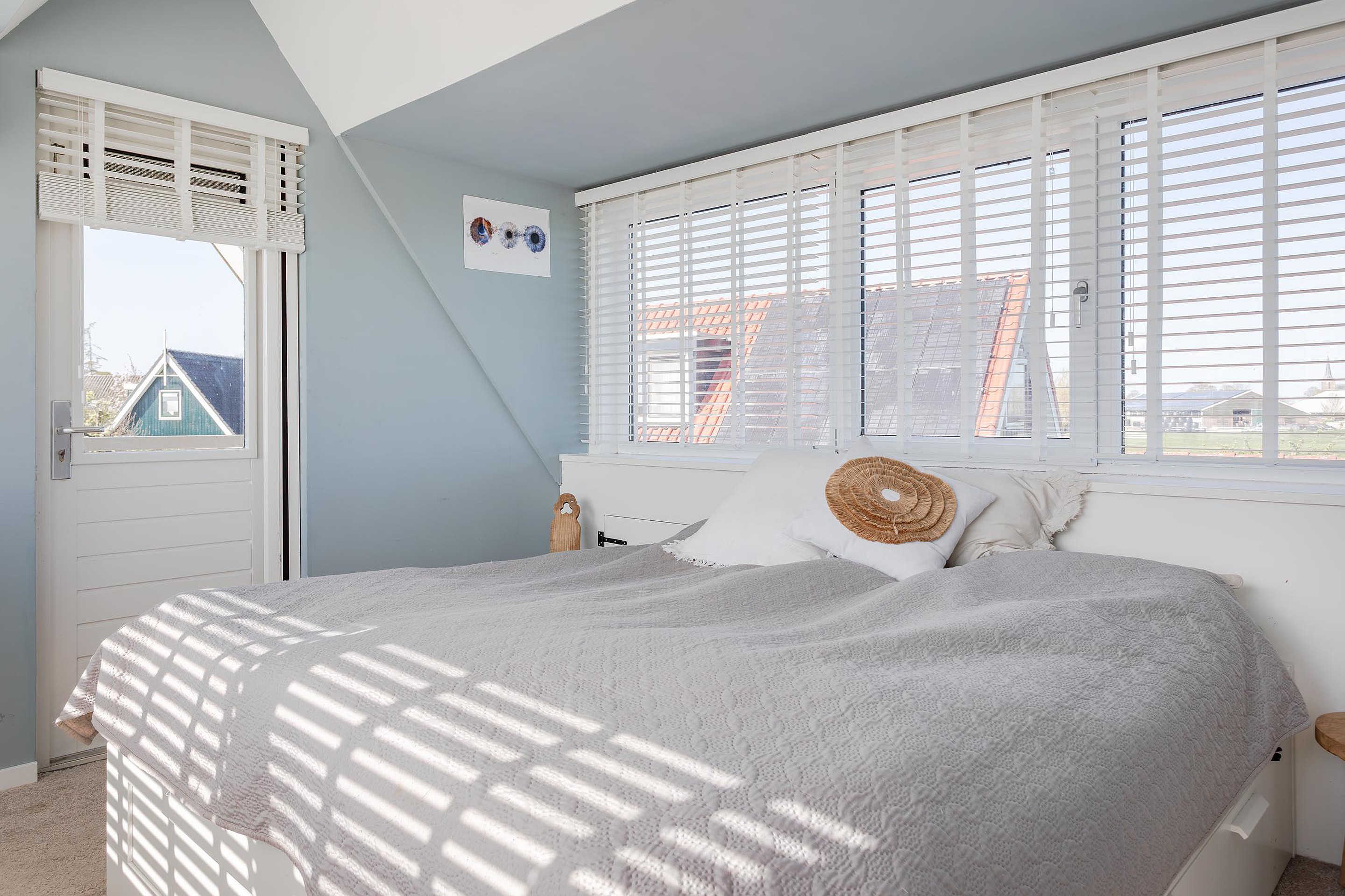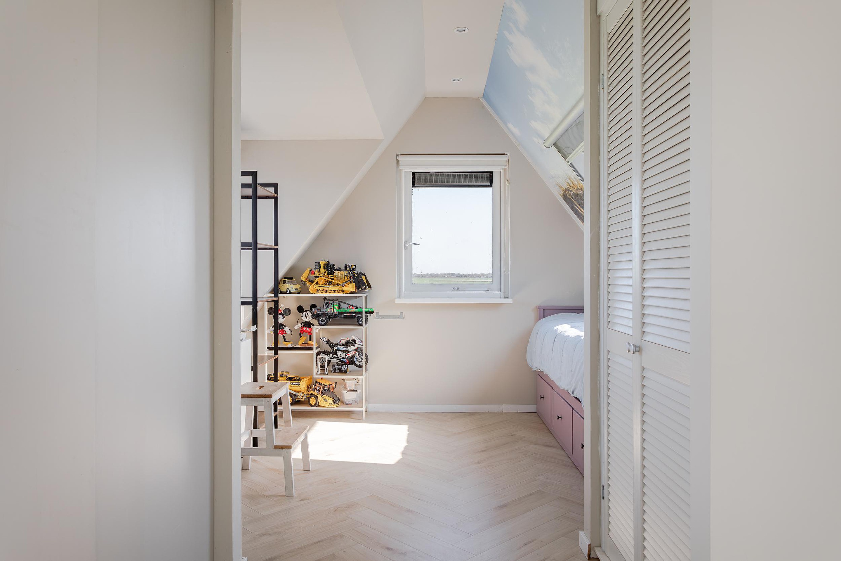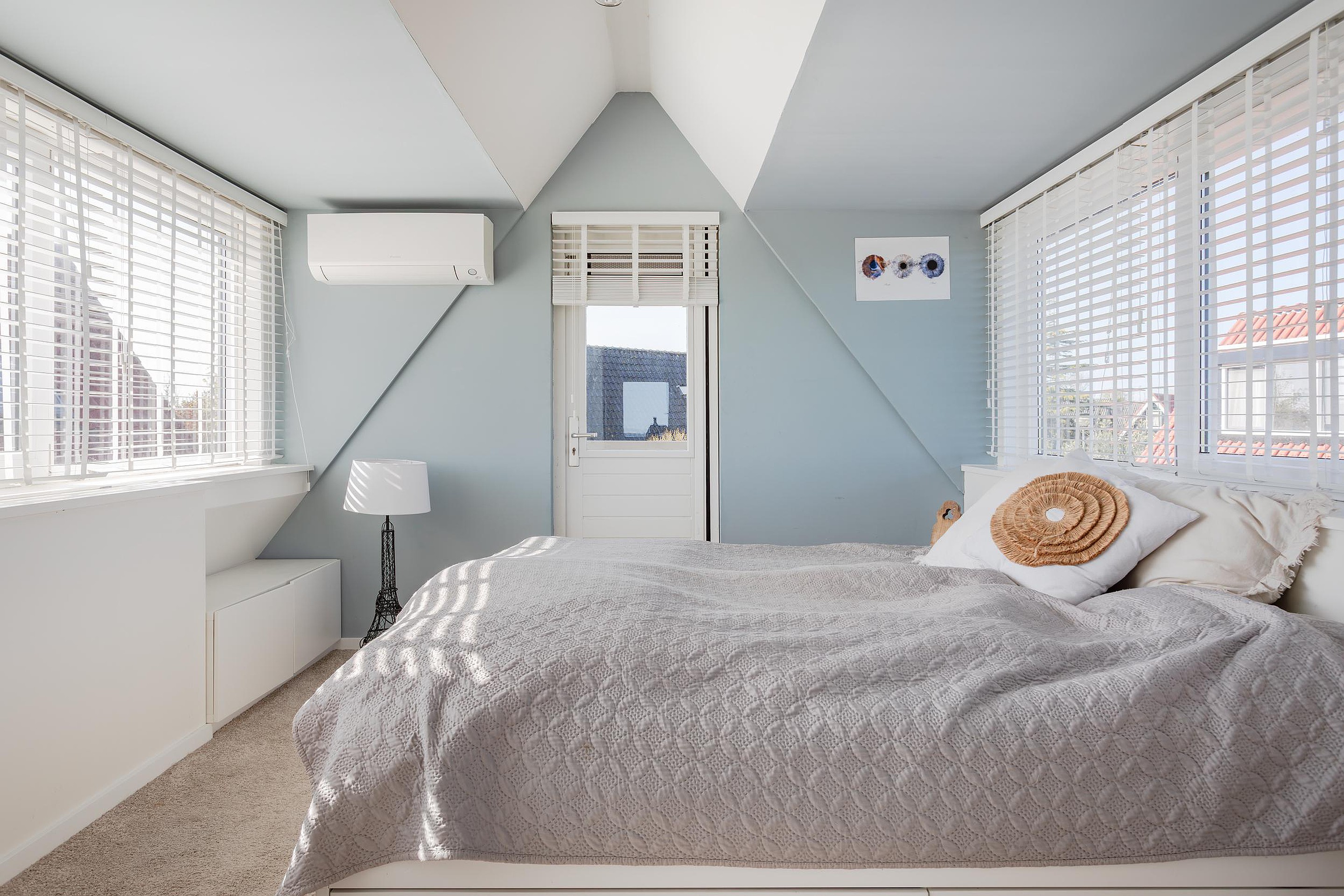 Slaapkamer voorzijde – via een stijlvolle “boerderij ”schuifdeur heeft u toegang tot de ruime slaapkamer met aan beide zijden een dakkapel, uitgevoerd in kunststof draai/kiep ramen en HR++ glas. In 2024 is er een airco geplaatst die niet alleen koelt maar ook verwarmd. Op warme zomeravonden kunt u ook de deur naar het balkon openzetten. Er is bergruimte achter de knieschotten en het uitzicht vanuit deze kamer is aan beide zijden spectaculair.