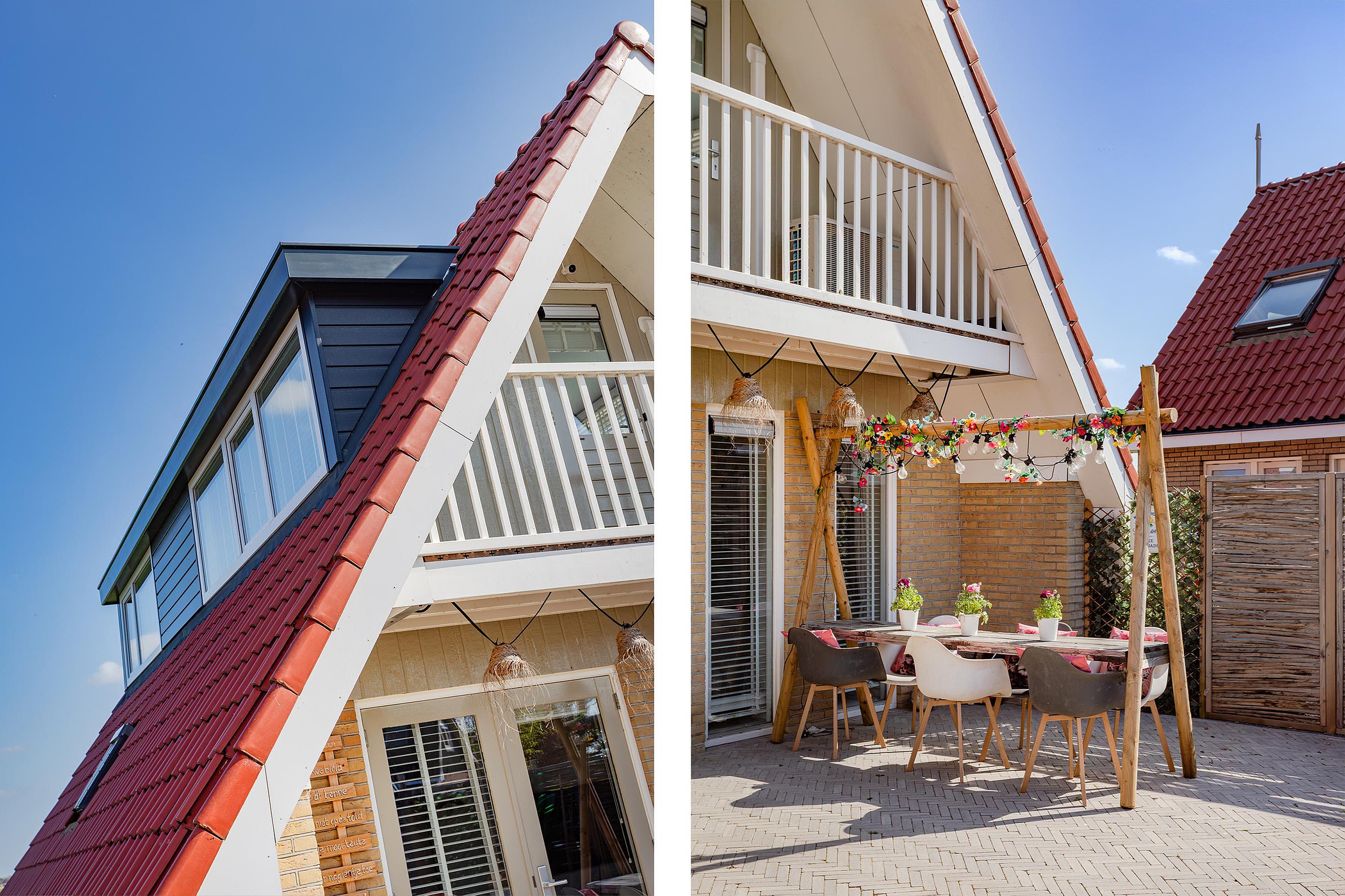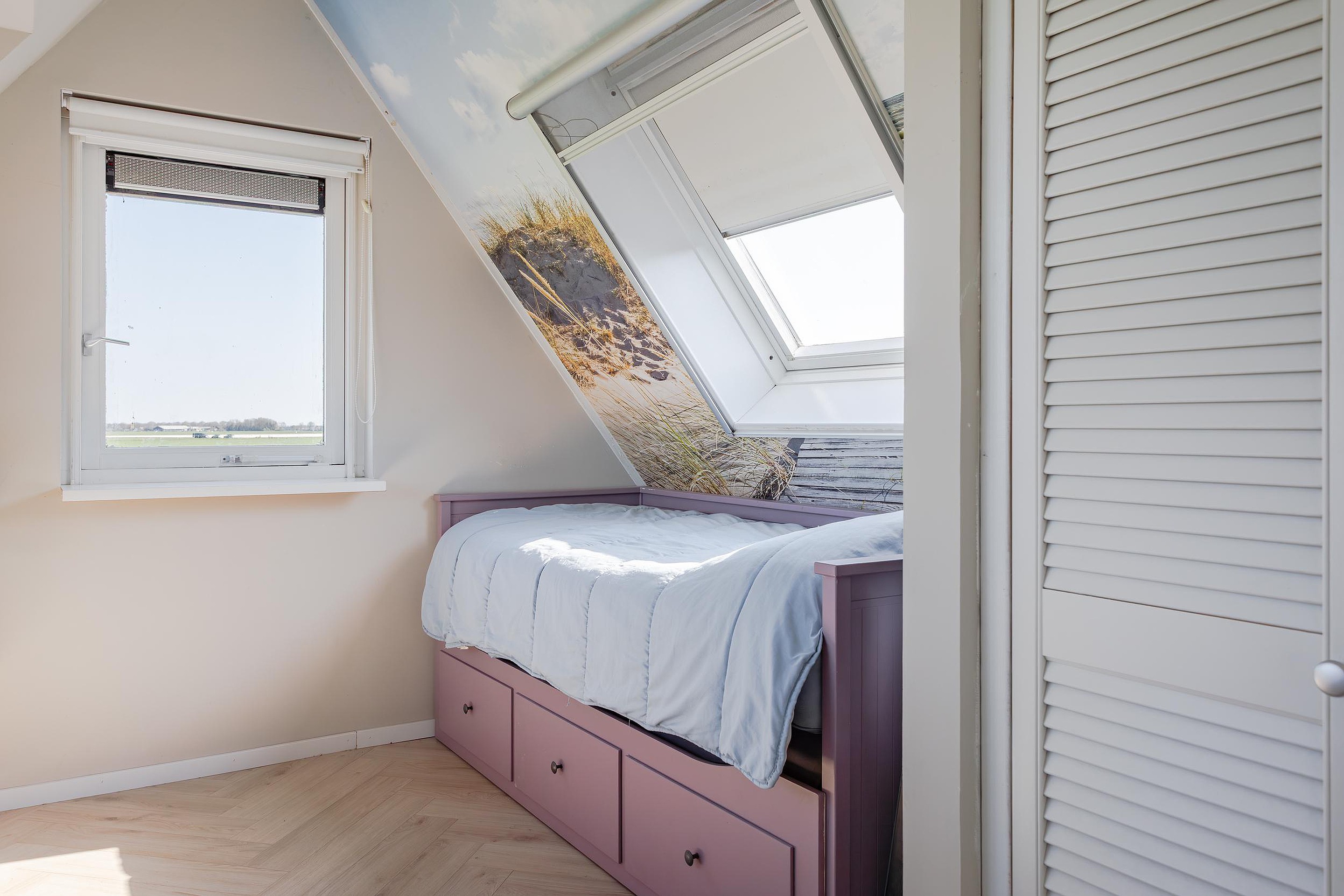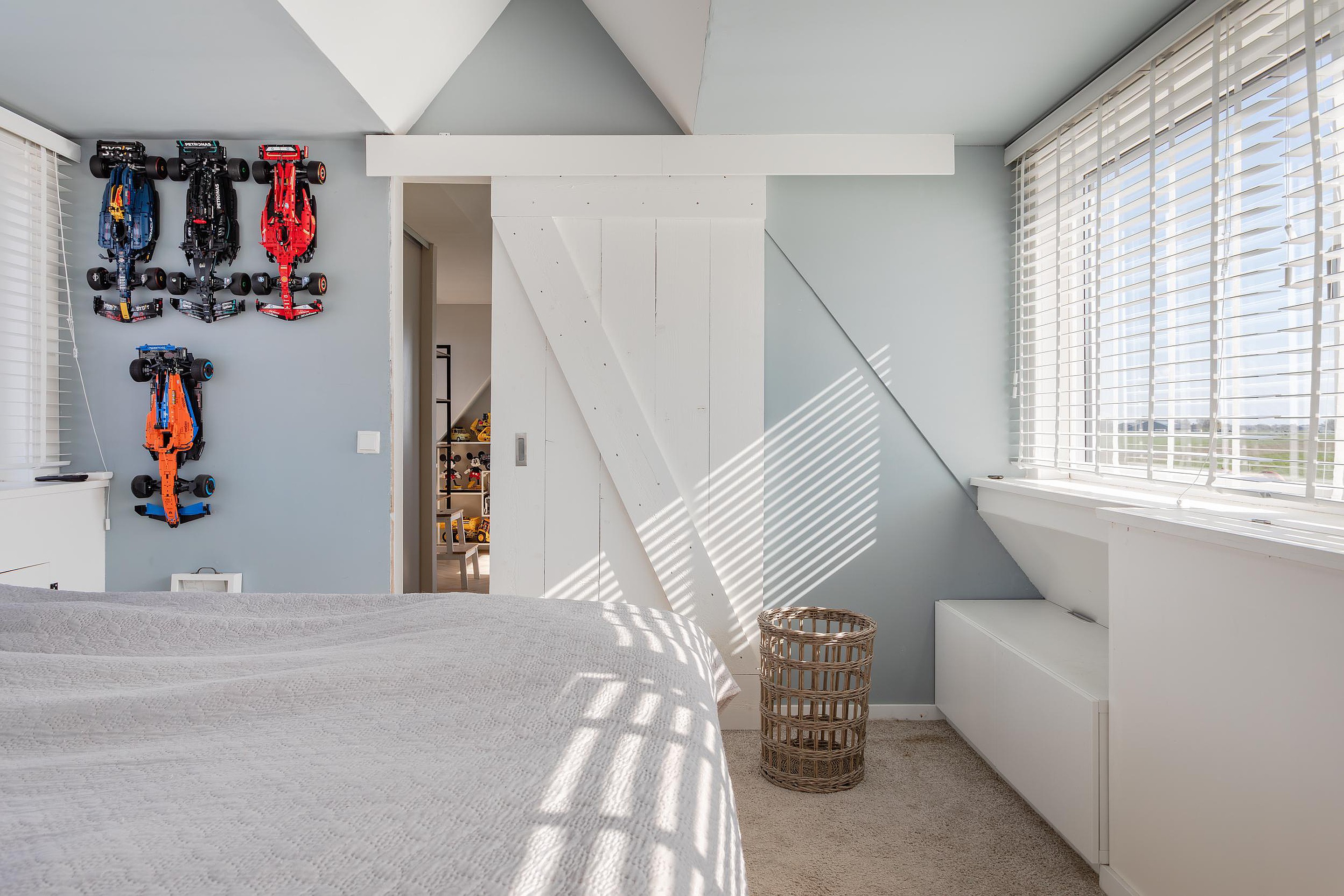 Slaapkamer voorzijde – via een stijlvolle “boerderij ”schuifdeur heeft u toegang tot de ruime slaapkamer met aan beide zijden een dakkapel, uitgevoerd in kunststof draai/kiep ramen en HR++ glas. In 2024 is er een airco geplaatst die niet alleen koelt maar ook verwarmd. Op warme zomeravonden kunt u ook de deur naar het balkon openzetten. Er is bergruimte achter de knieschotten en het uitzicht vanuit deze kamer is aan beide zijden spectaculair.