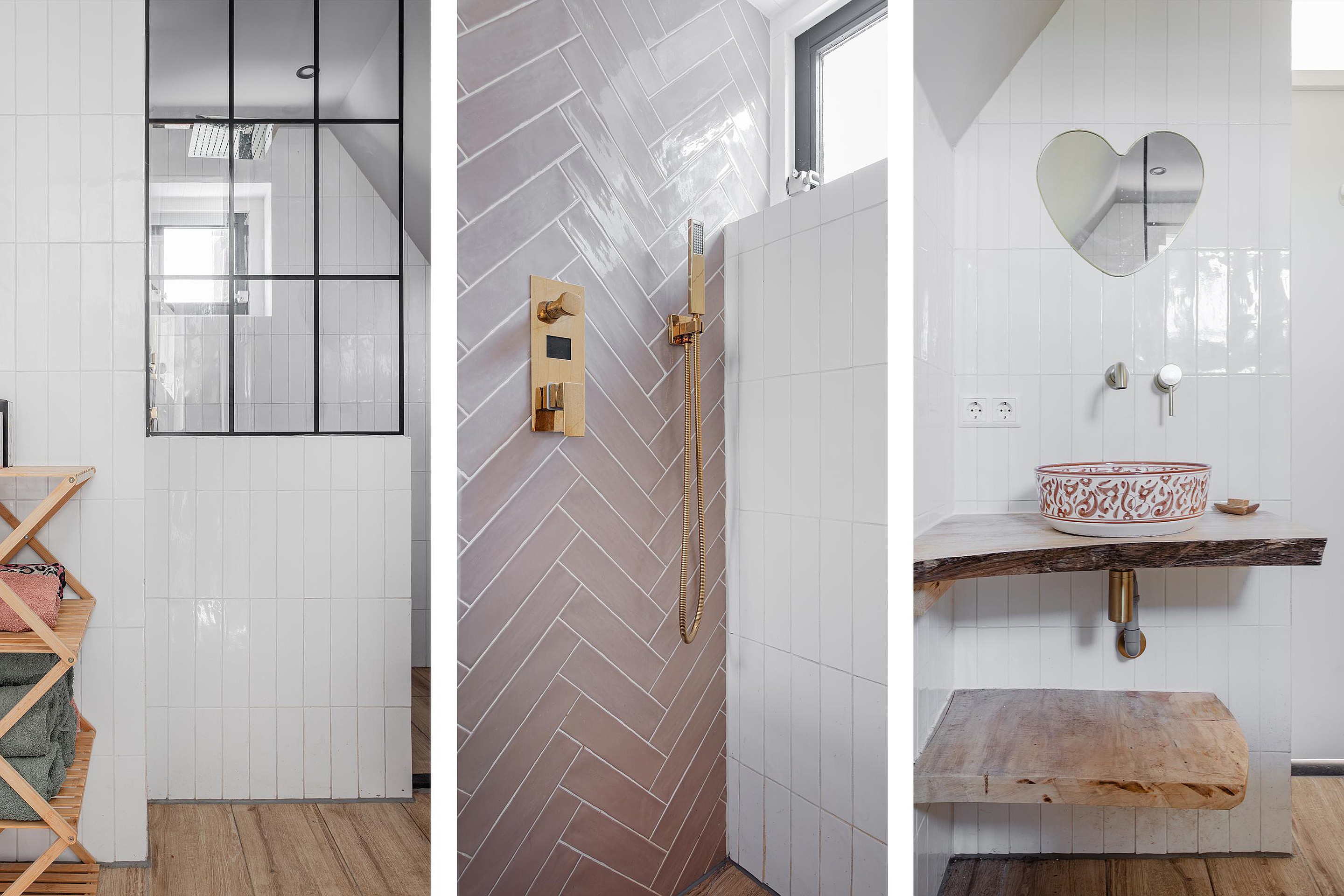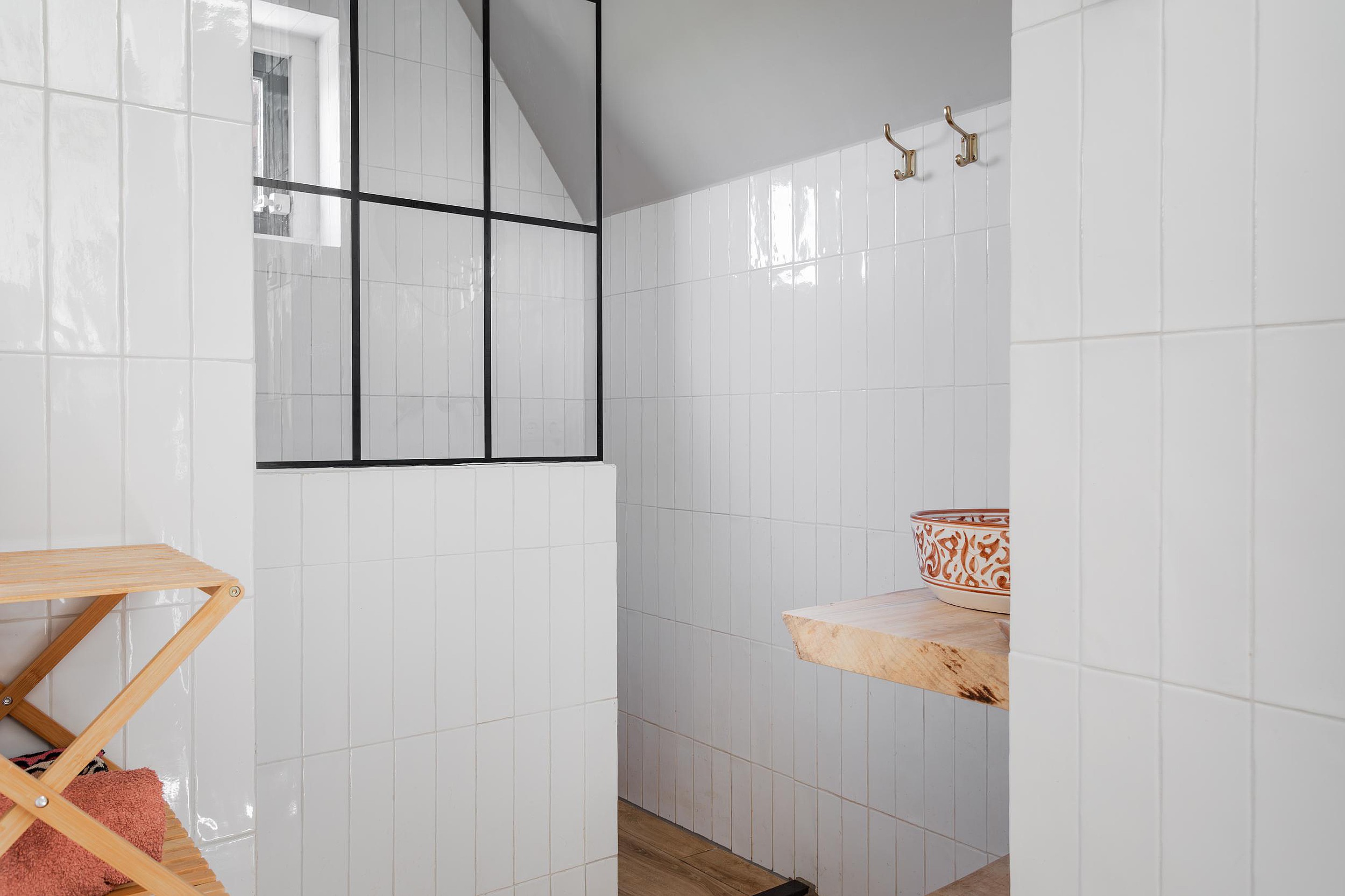 Ook de badkamer op de begane grond heeft in 2024 een metamorfose ondergaan waar de wanden licht betegeld zijn, houtlook vloertegels met elektrisch vloerverwarming, houten plateau met een waskom, inbouwspots en een inloopdouche met thermostaatkraan, hand- en regendouche en een drainafvoer.