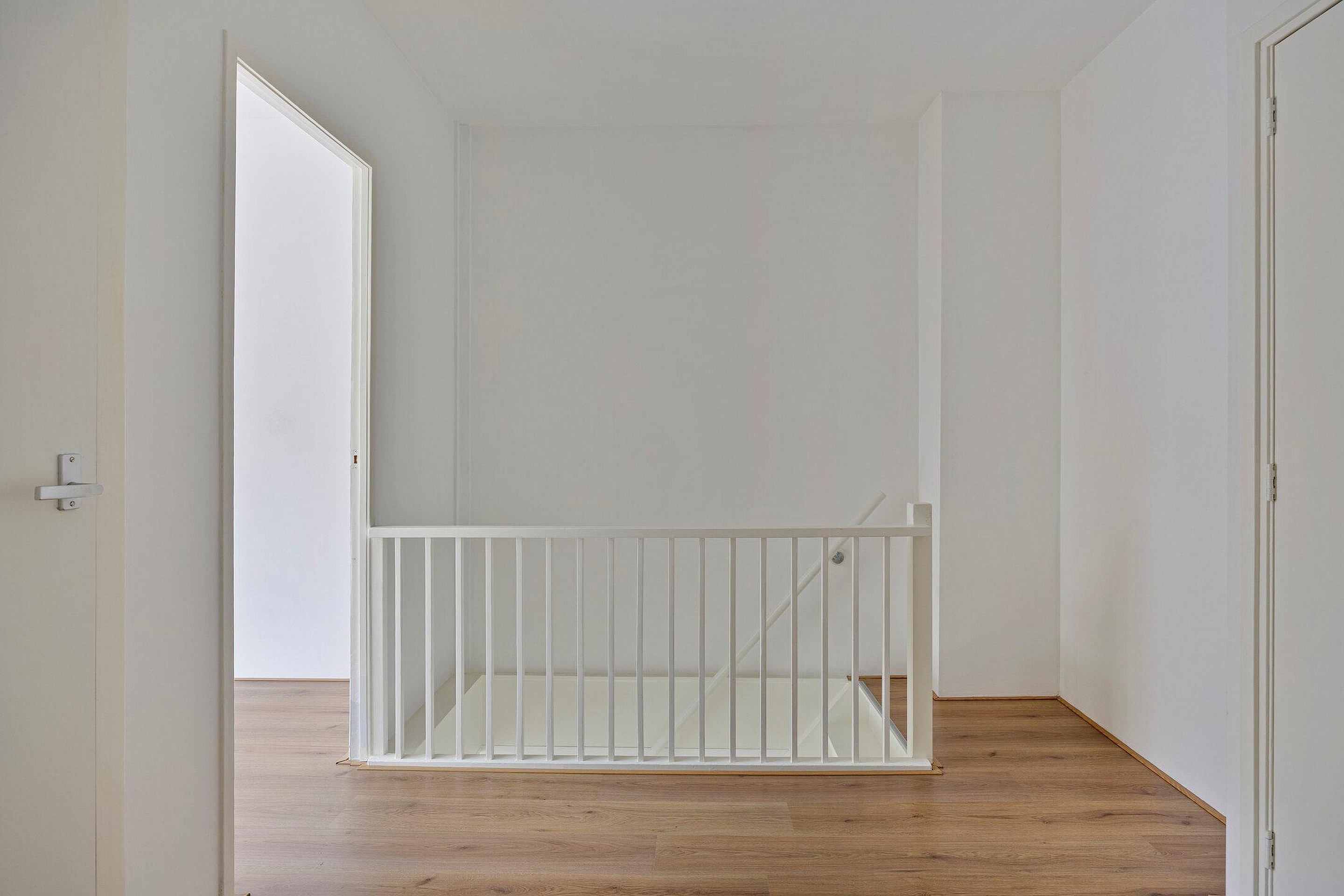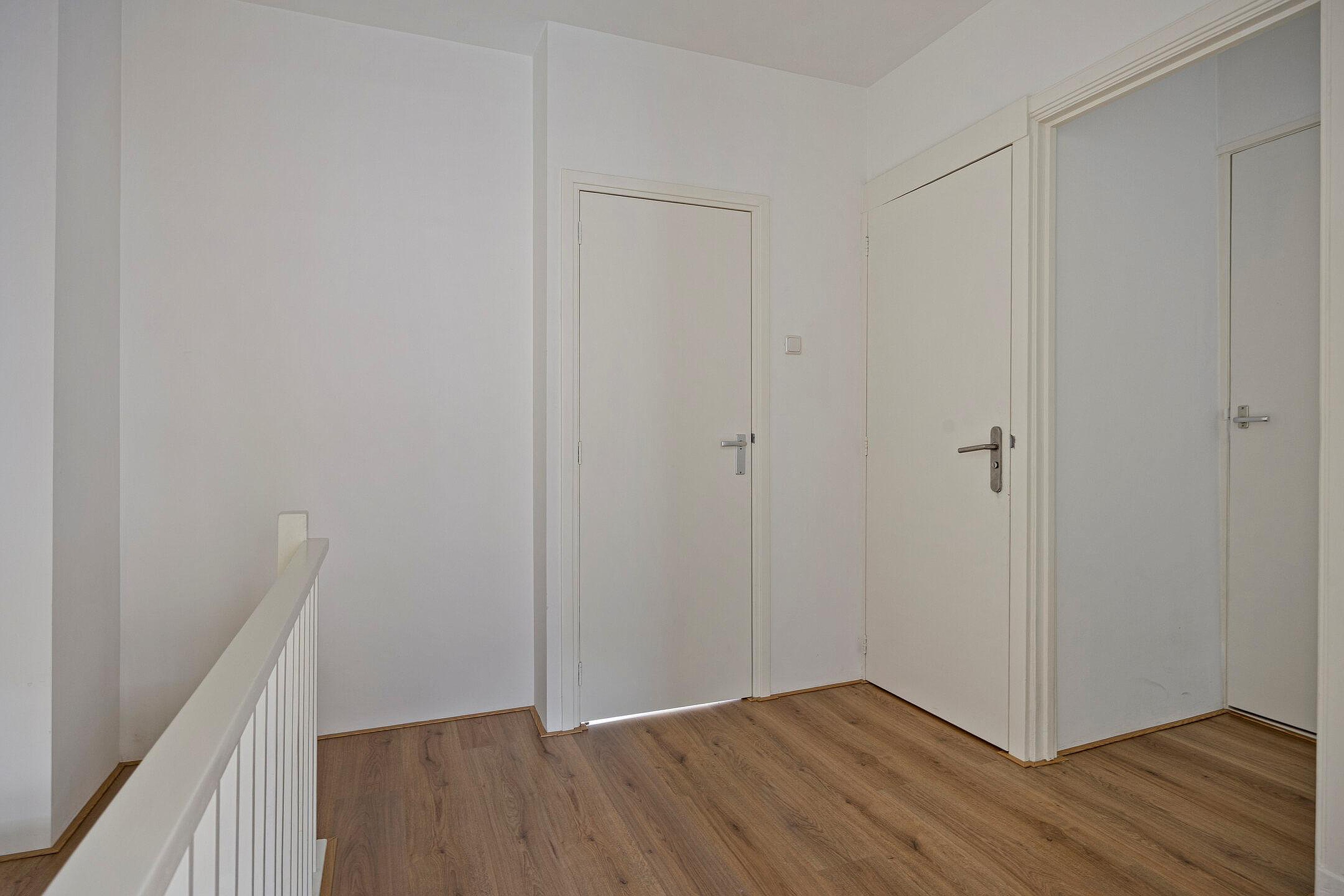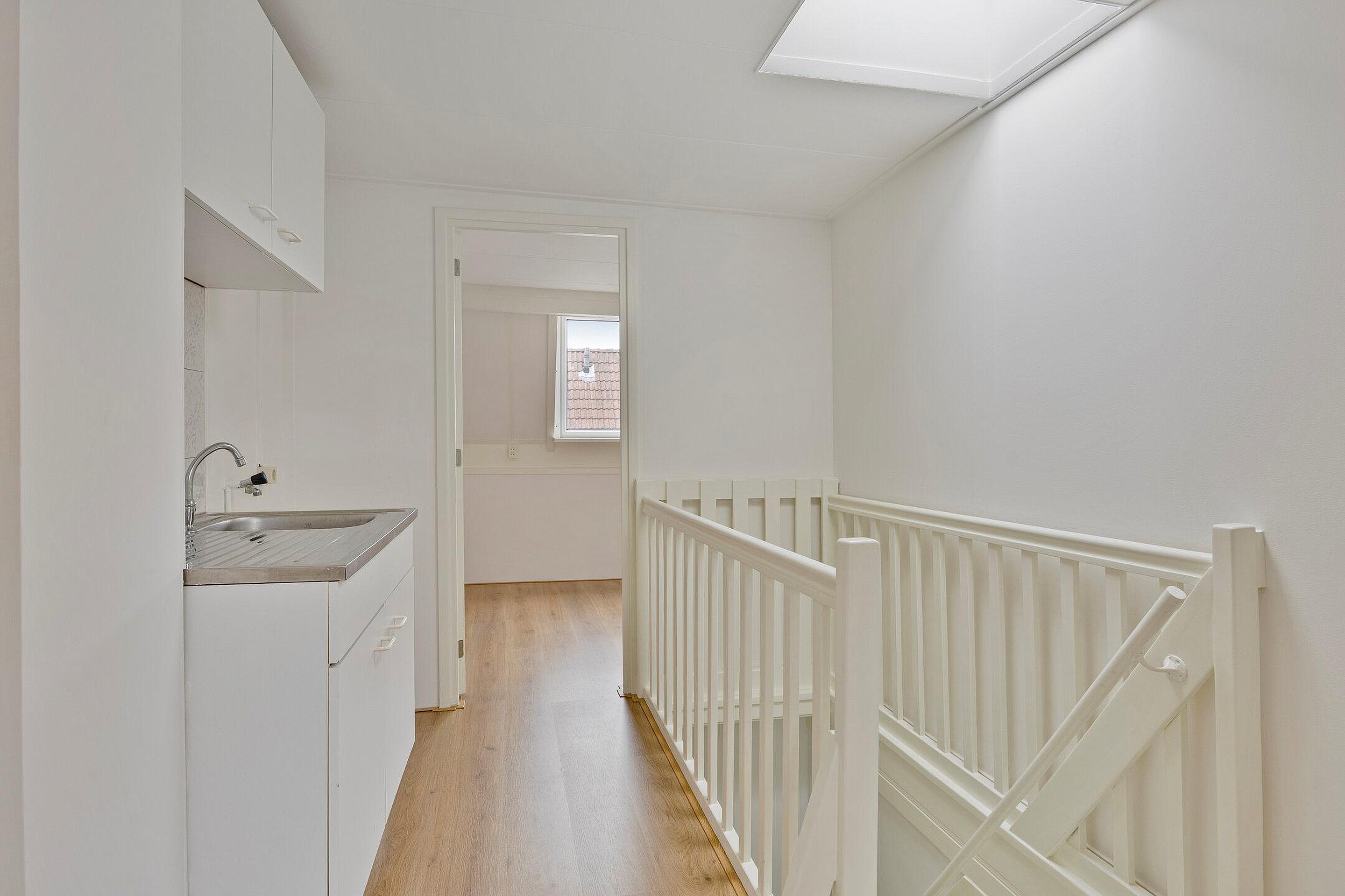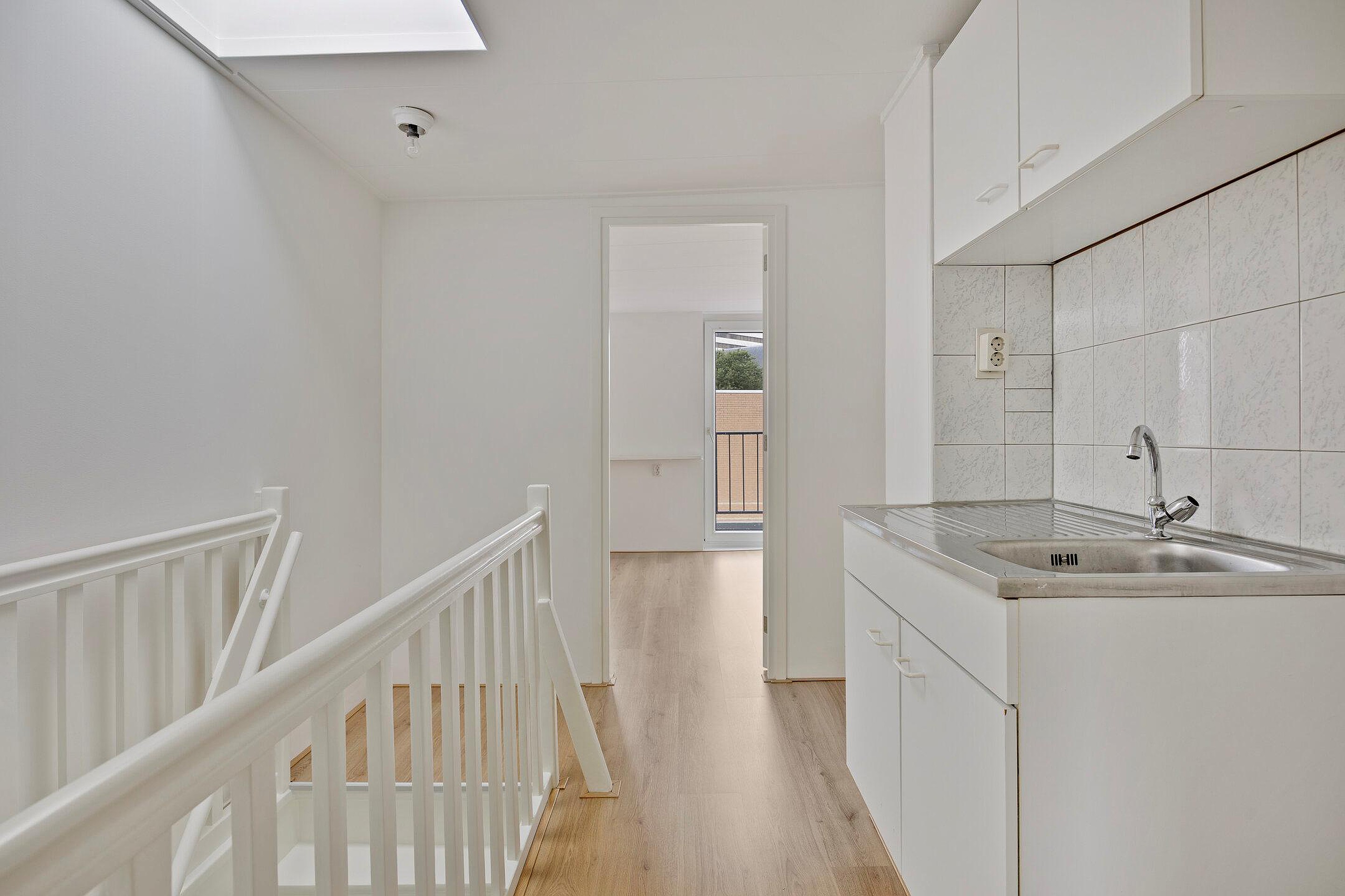Overloop met dakraam, keukenblokje en wasmachineaansluiting. Twee slaapkamers. De slaapkamer aan de achterzijde geeft toegang tot balkon.