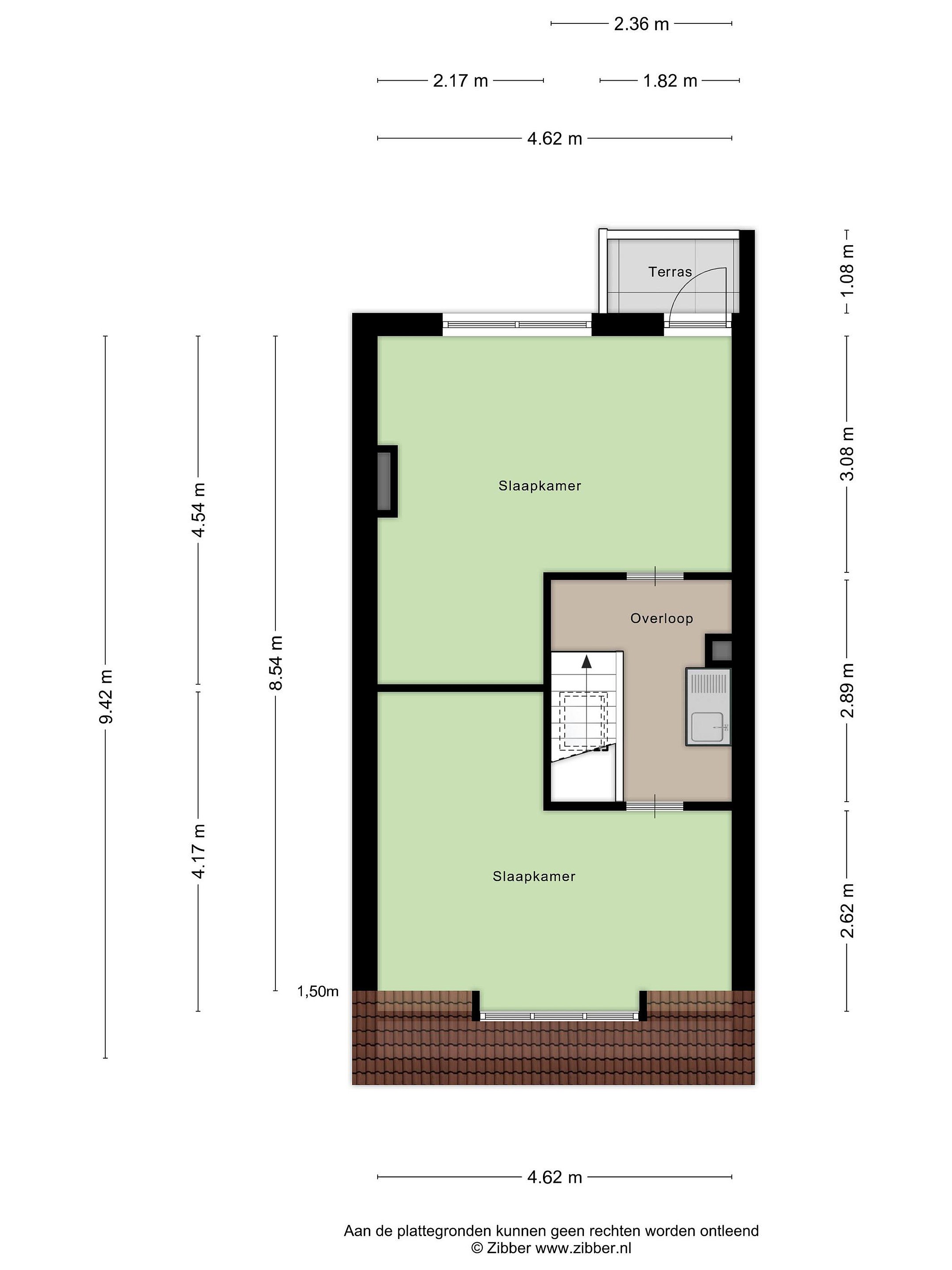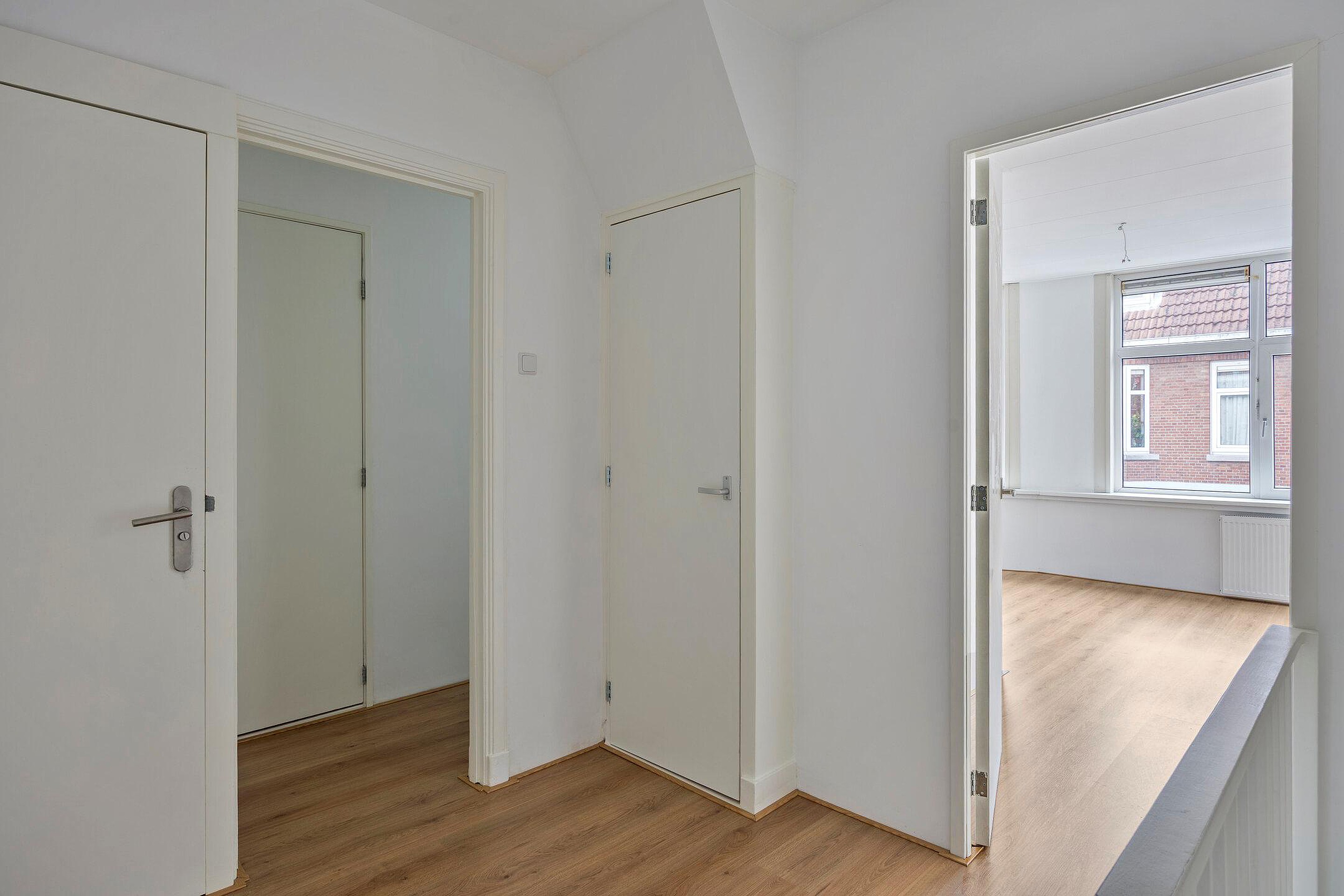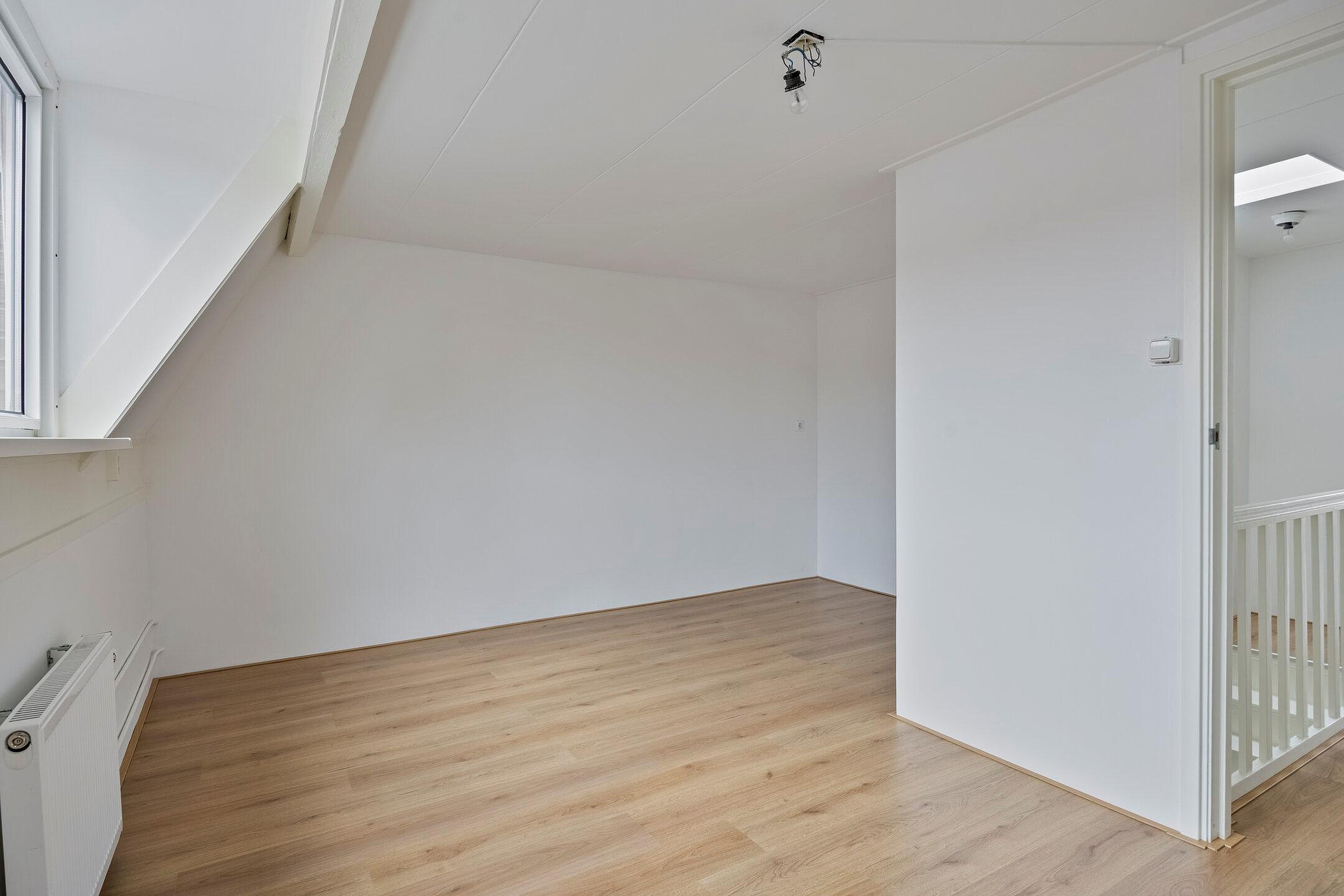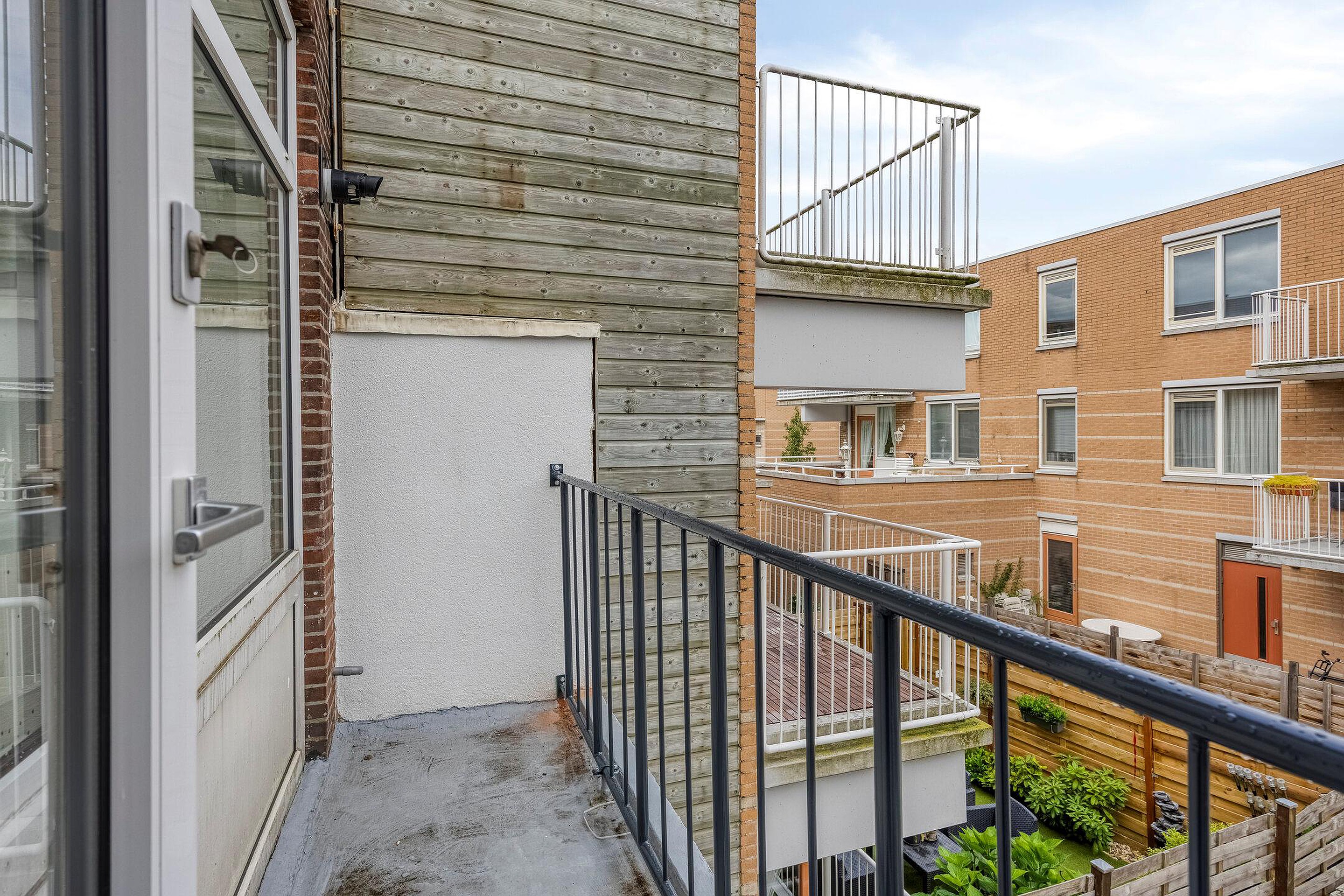 Overloop met dakraam, keukenblokje en wasmachineaansluiting. Twee slaapkamers. De slaapkamer aan de achterzijde geeft toegang tot balkon.