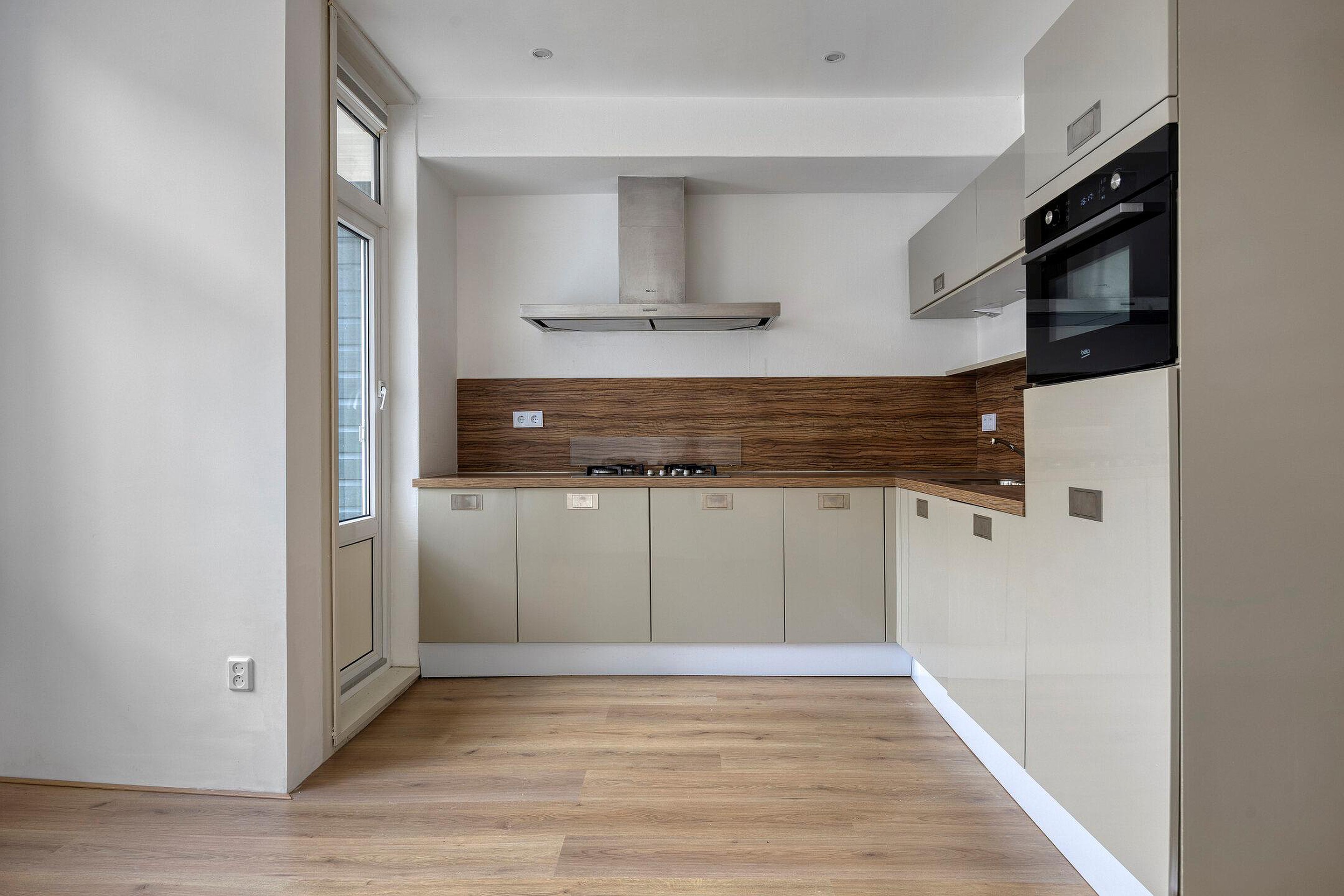 Lichte woonkamer met open keuken voorzien van een in hoek opgestelde keukeninrichting met inbouwapparatuur waaronder een vaatwasser, koel-/vriescombinatie, oven, gaskookplaat en afzuigkap. Vanuit de keuken is er toegang tot de achtertuin met vrijstaande berging en achterom.