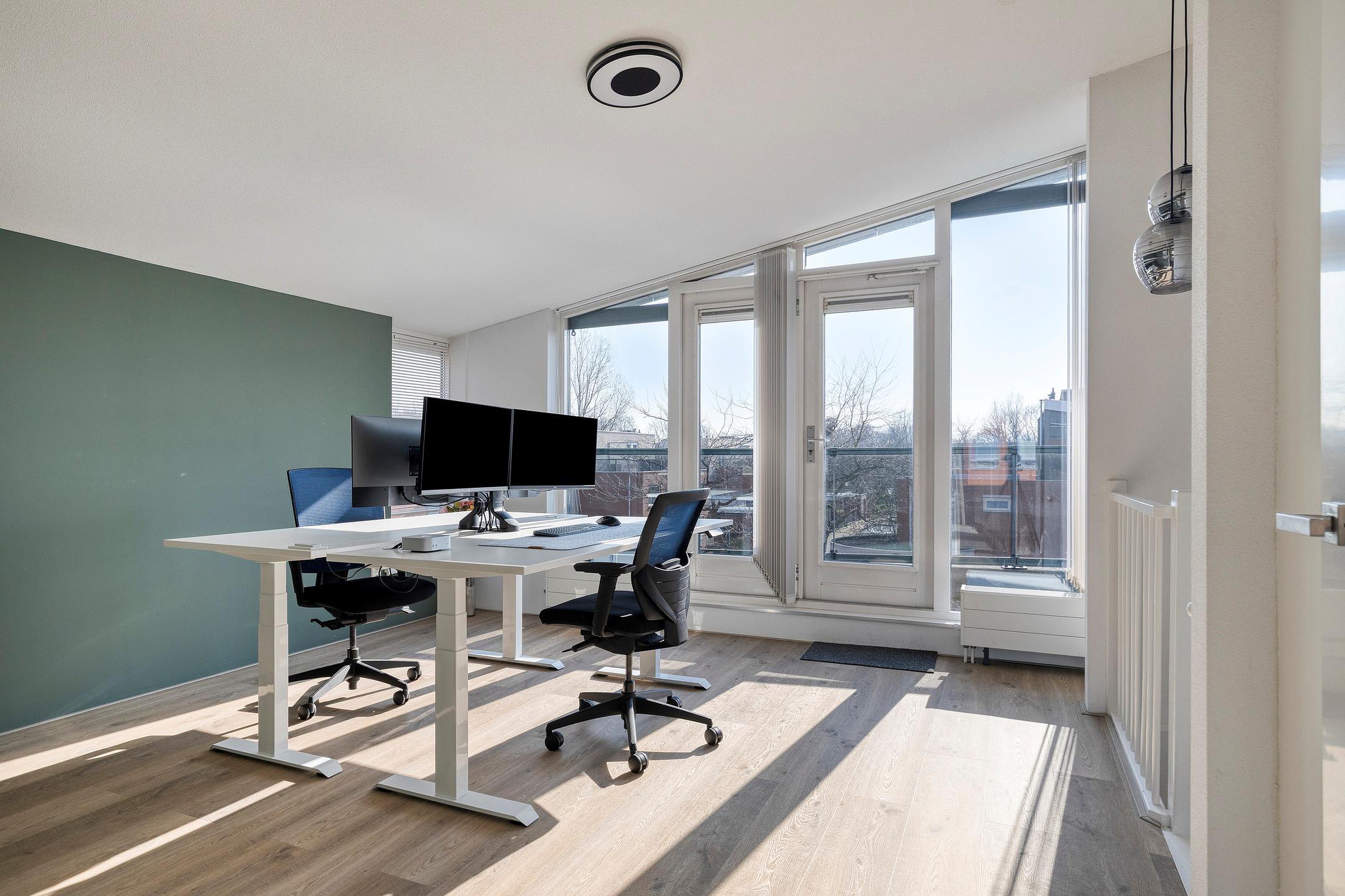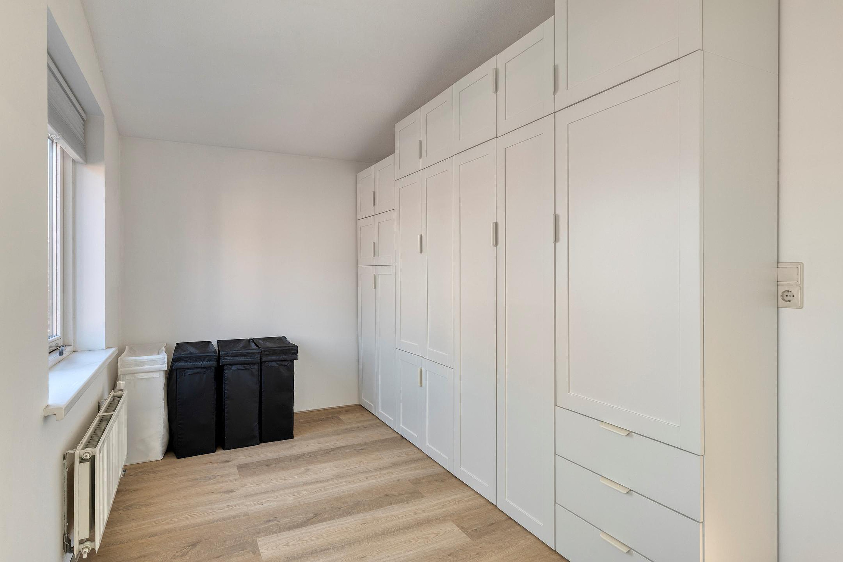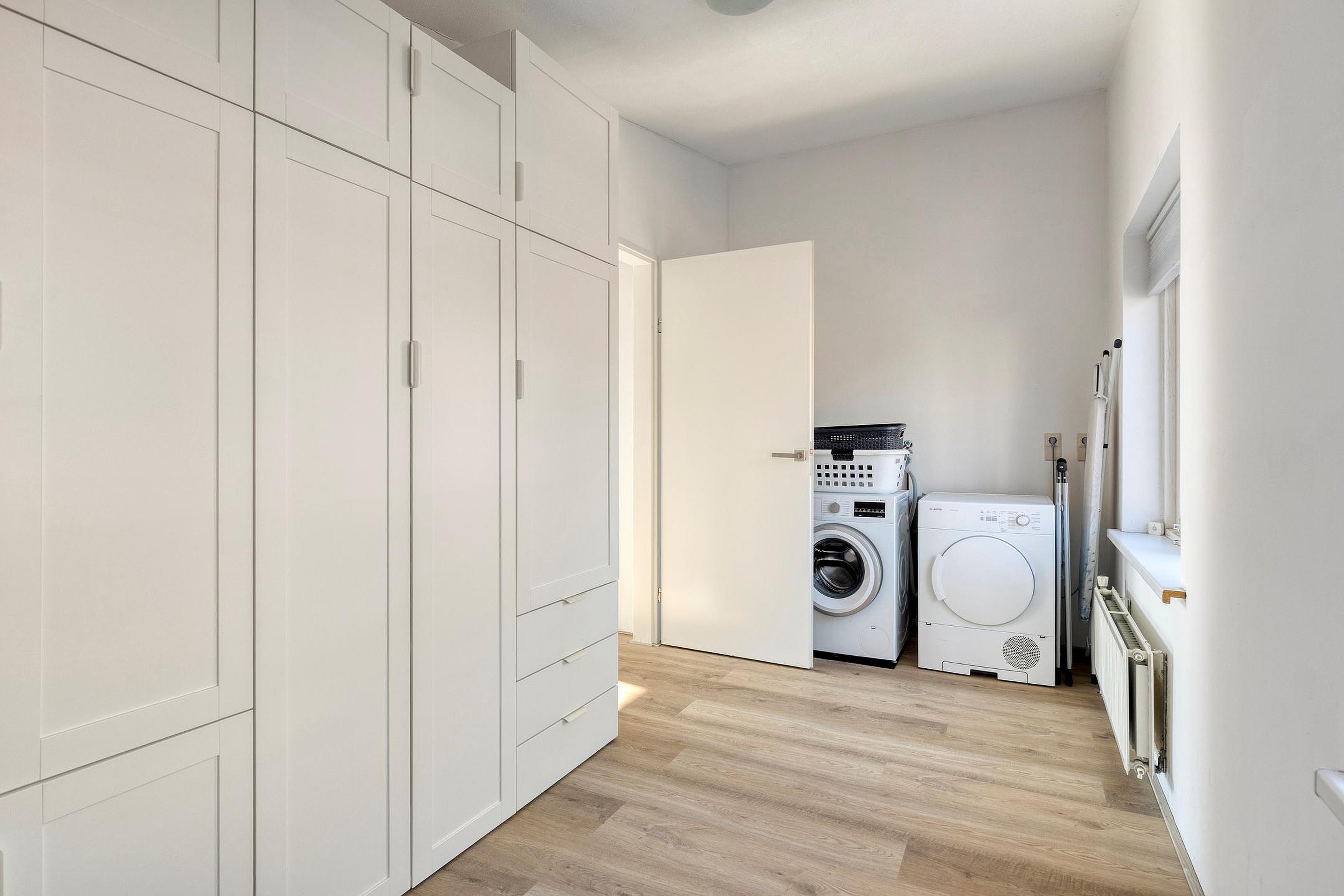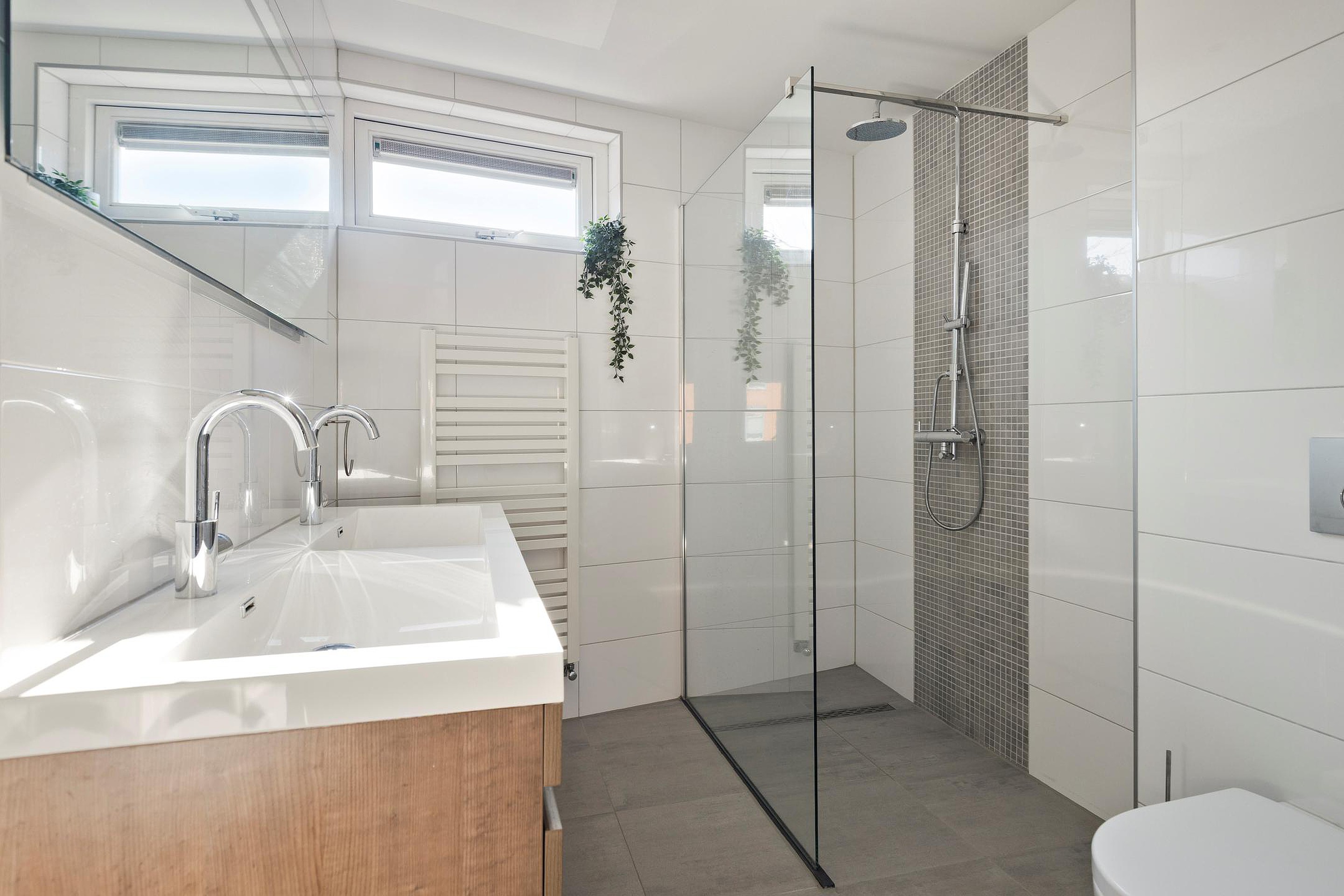 Boven vind je drie slaapkamers en een luxe badkamer met tweede toilet, inloopdouche en wastafelmeubel met dubbele wastafel. De slaapkamers zijn ruim en praktisch ingedeeld, met veel bergruimte. De slaapkamer aan de voorzijde is voorzien van rolluiken. Op de zolder is een royale kamer ingericht als werkkamer – perfect voor thuiswerken – met toegang tot een balkon aan de voorzijde. Aan de achterzijde bevindt zich een wasruimte met aansluitingen voor wasmachine en droger en een grote kastenwand. Alle kamers zijn voorzien van dezelfde laminaatvloer wat het geheel een rustige uitstraling geeft.