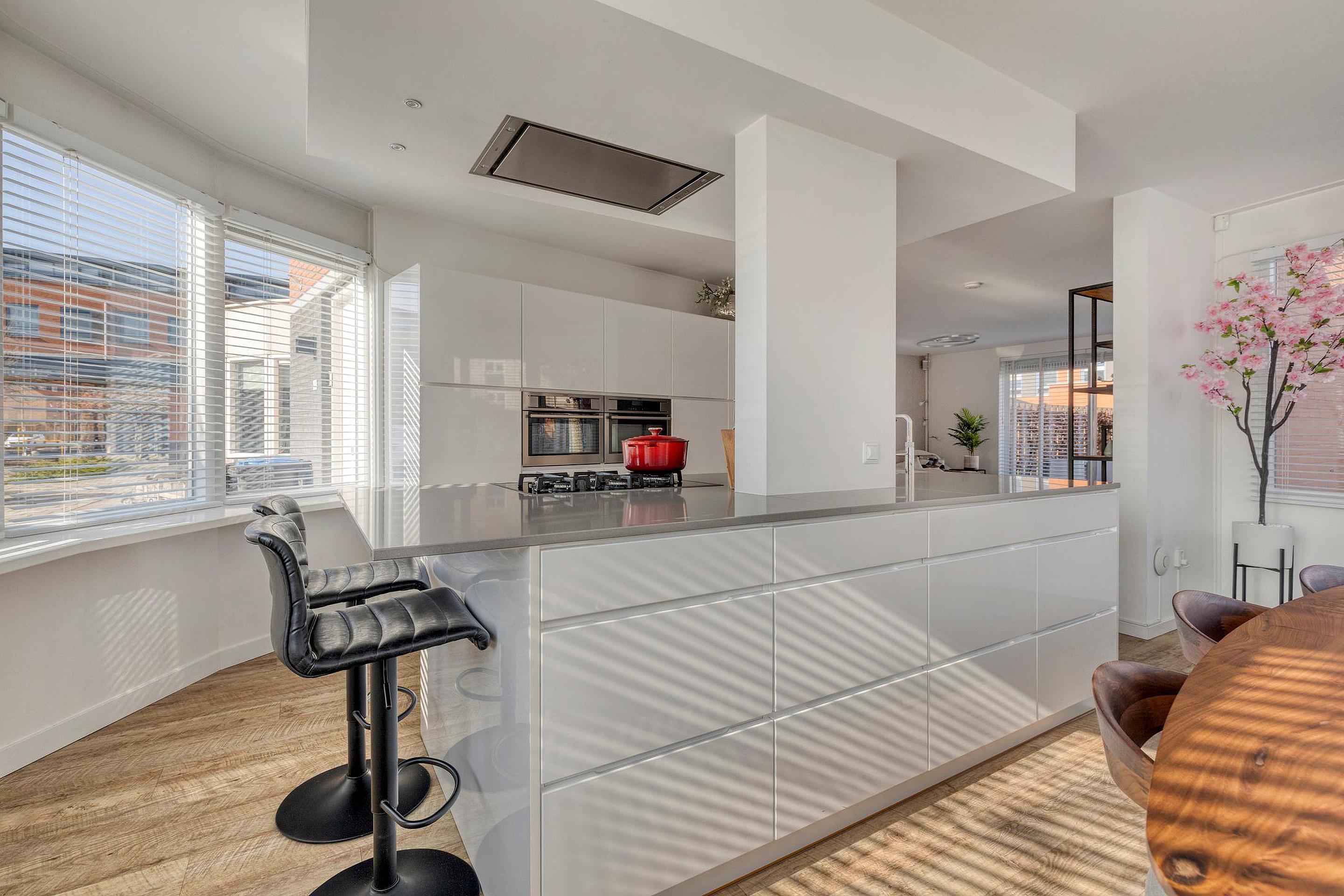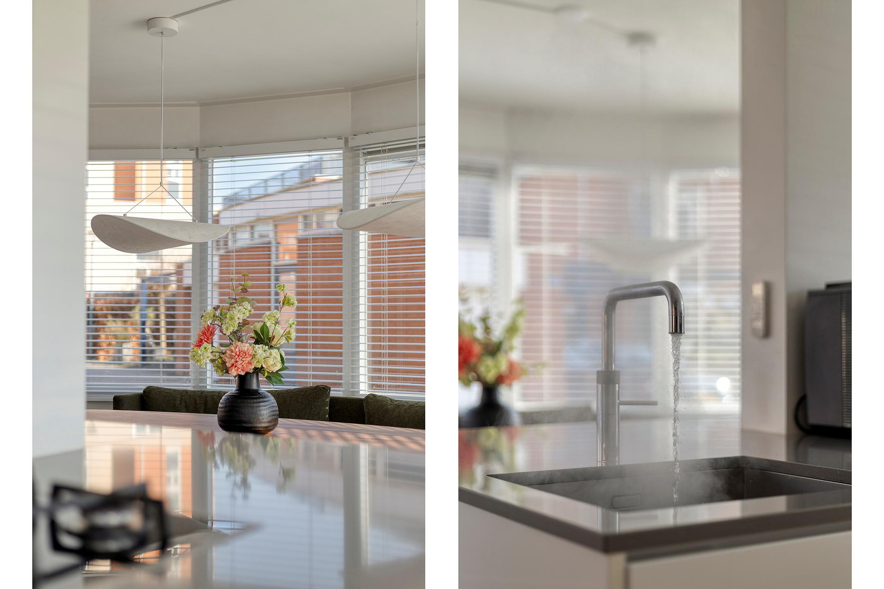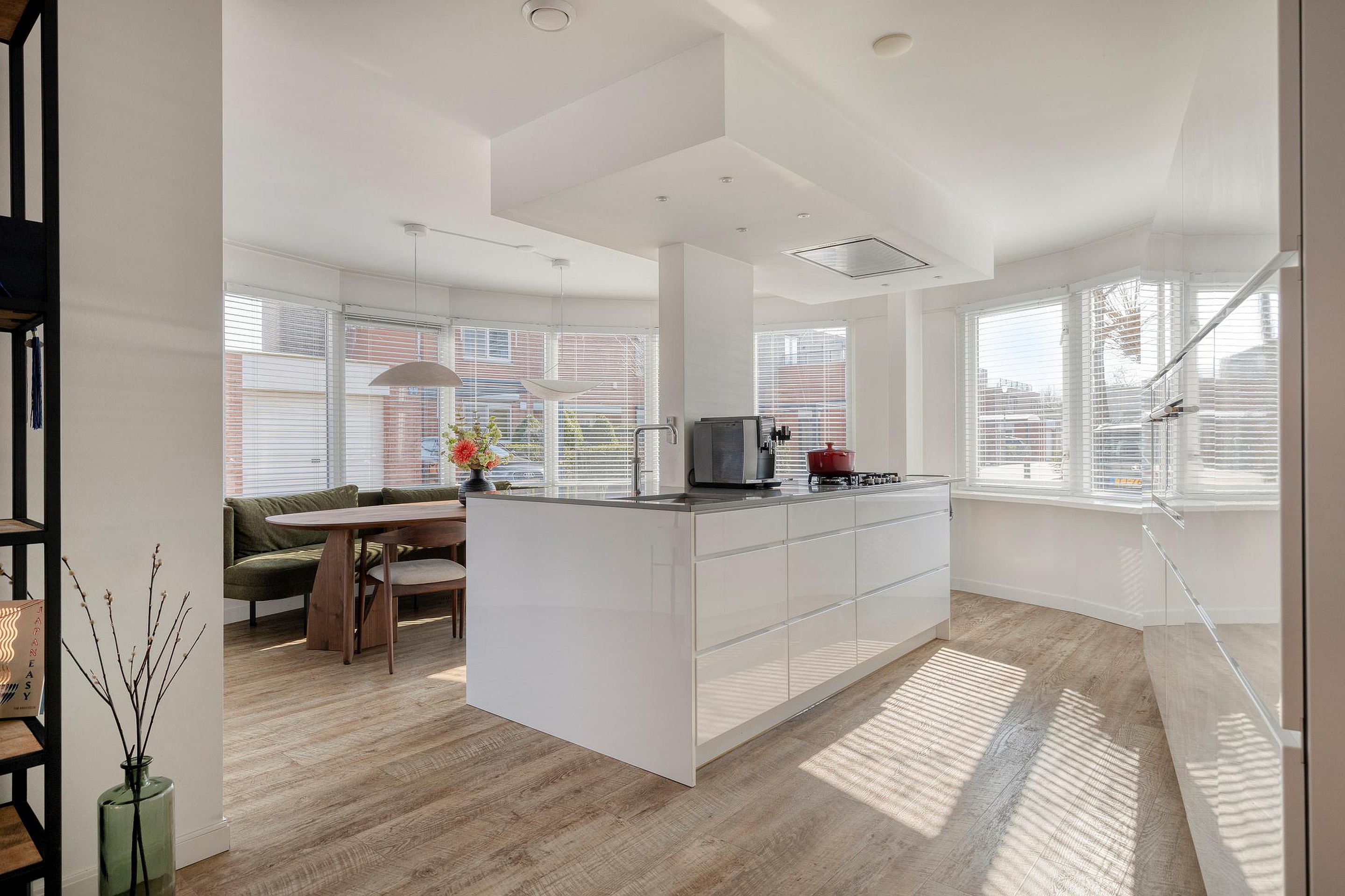 Vanuit de hal, met toilet en meterkast, kom je via een mooie stalen deur de woonkamer in. Deze woning heeft een unieke ronding aan de voorzijde waarin zich de luxe keuken en eetkamer bevinden – een echte eyecatcher waar het licht prachtig naar binnen valt. De elektrisch bedienbare Luxaflex maken het eenvoudig om hier het licht en de privacy naar wens te regelen. De moderne keuken is een droom voor elke kookliefhebber: hoogglans wit met een natuurstenen blad, een groot kookeiland, een kastenwand met inbouwapparatuur waaronder een combi oven/magnetron, oven, koelkast, vriezer, vaatwasser, Quooker én een strak in het plafond weggewerkte afzuigkap.