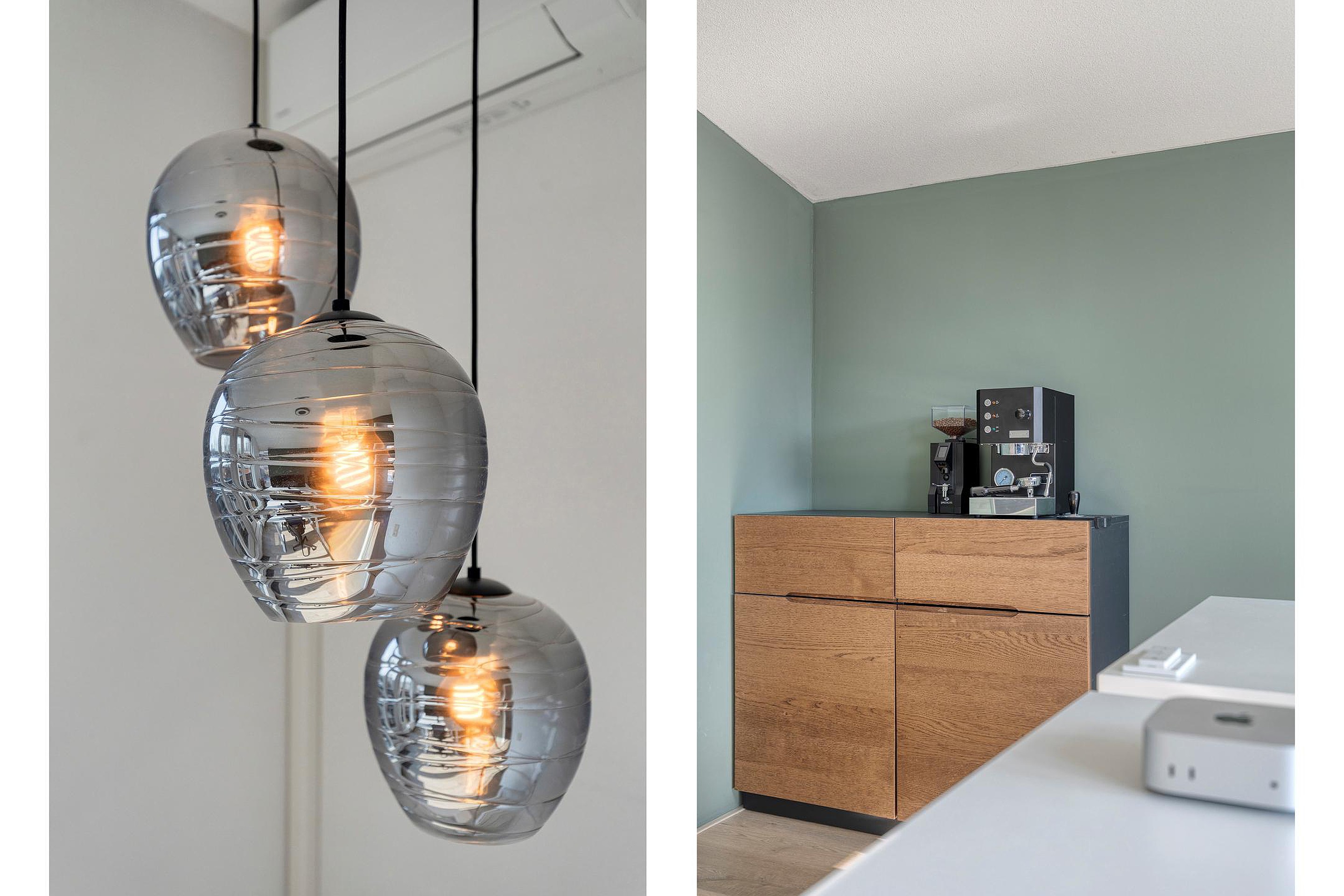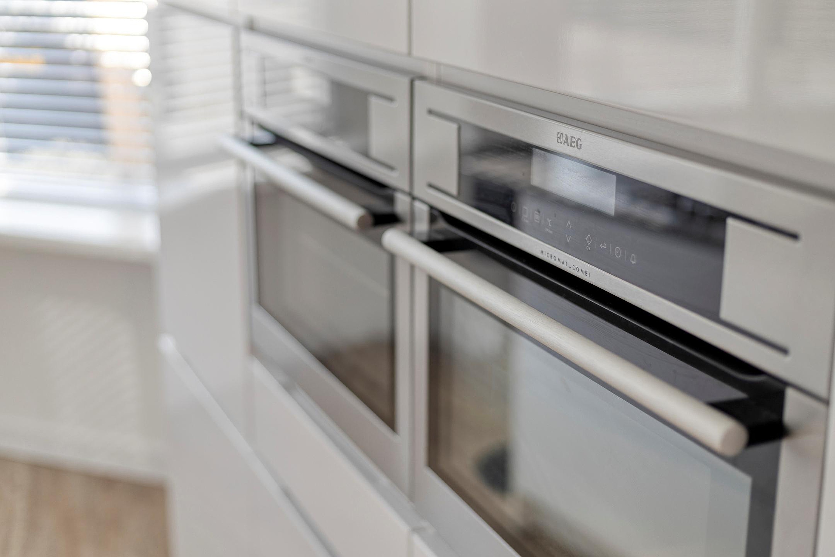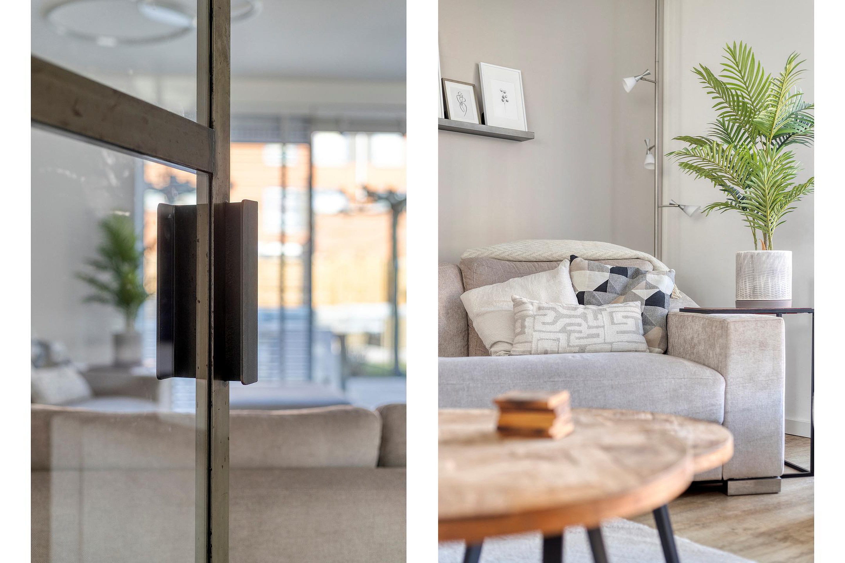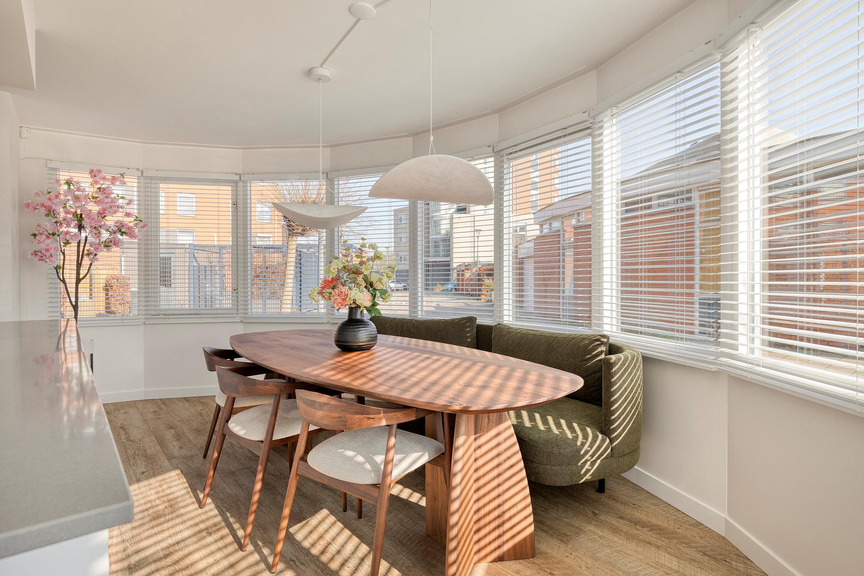 Vanuit de hal, met toilet en meterkast, kom je via een mooie stalen deur de woonkamer in. Deze woning heeft een unieke ronding aan de voorzijde waarin zich de luxe keuken en eetkamer bevinden – een echte eyecatcher waar het licht prachtig naar binnen valt. De elektrisch bedienbare Luxaflex maken het eenvoudig om hier het licht en de privacy naar wens te regelen. De moderne keuken is een droom voor elke kookliefhebber: hoogglans wit met een natuurstenen blad, een groot kookeiland, een kastenwand met inbouwapparatuur waaronder een combi oven/magnetron, oven, koelkast, vriezer, vaatwasser, Quooker én een strak in het plafond weggewerkte afzuigkap.
