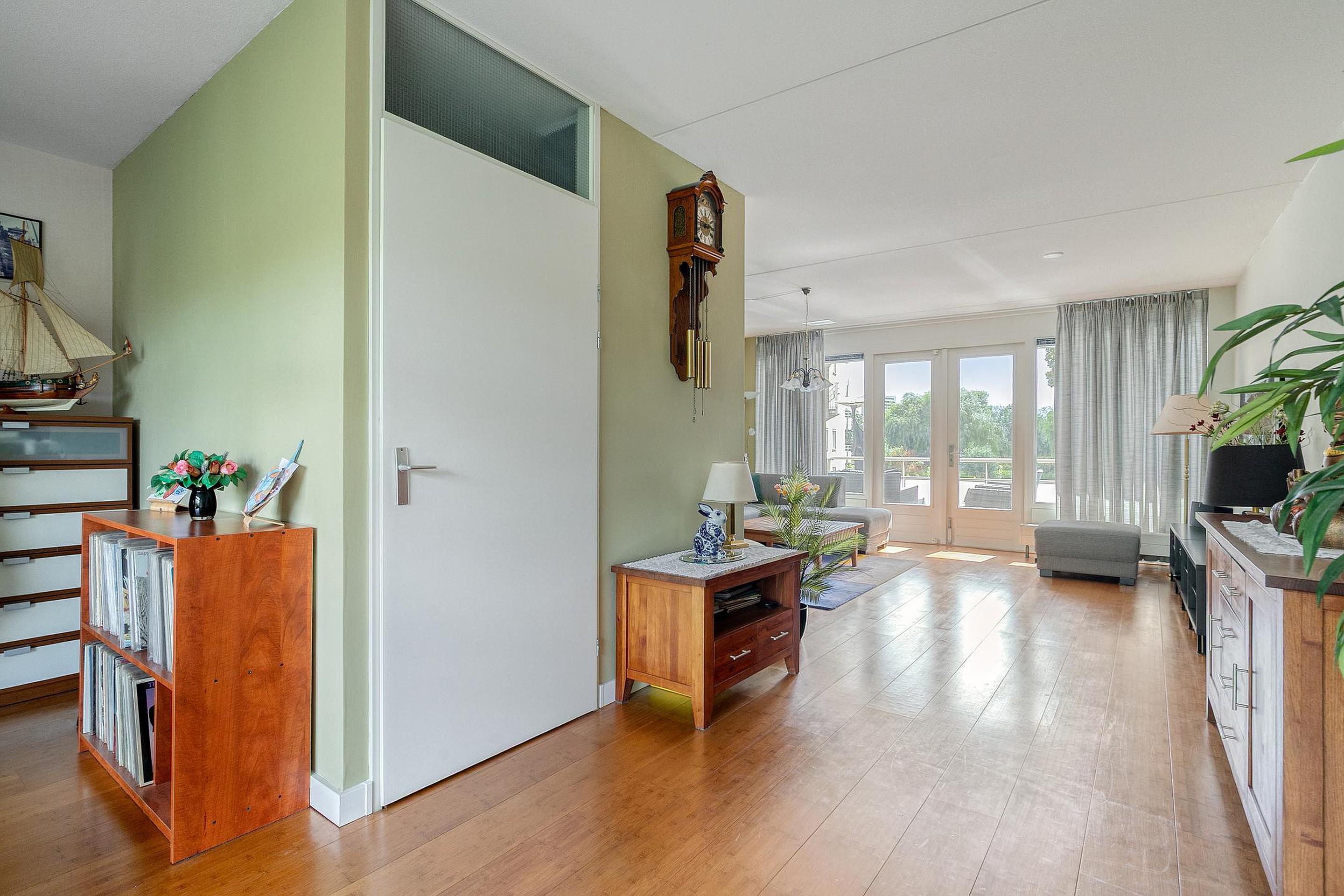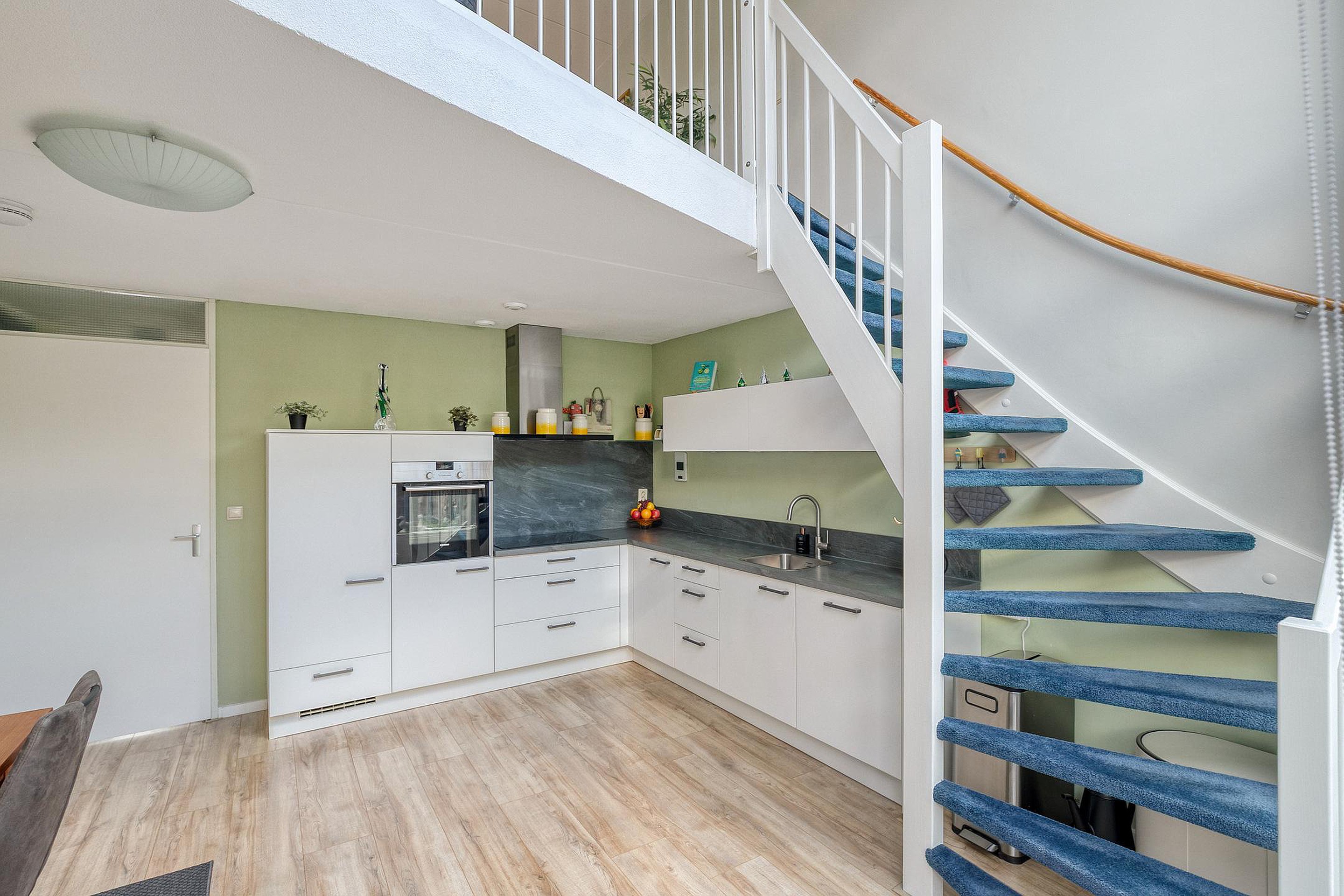 De eerste verdieping is bereikbaar via zowel de hal als de woonkeuken. Hier bevindt zich de ruime en lichte woonkamer met vide en openslaande deuren naar een zonnig balkon op het zuiden met groot zonnescherm. U geniet hier van een vrij uitzicht over molens, groen en water.