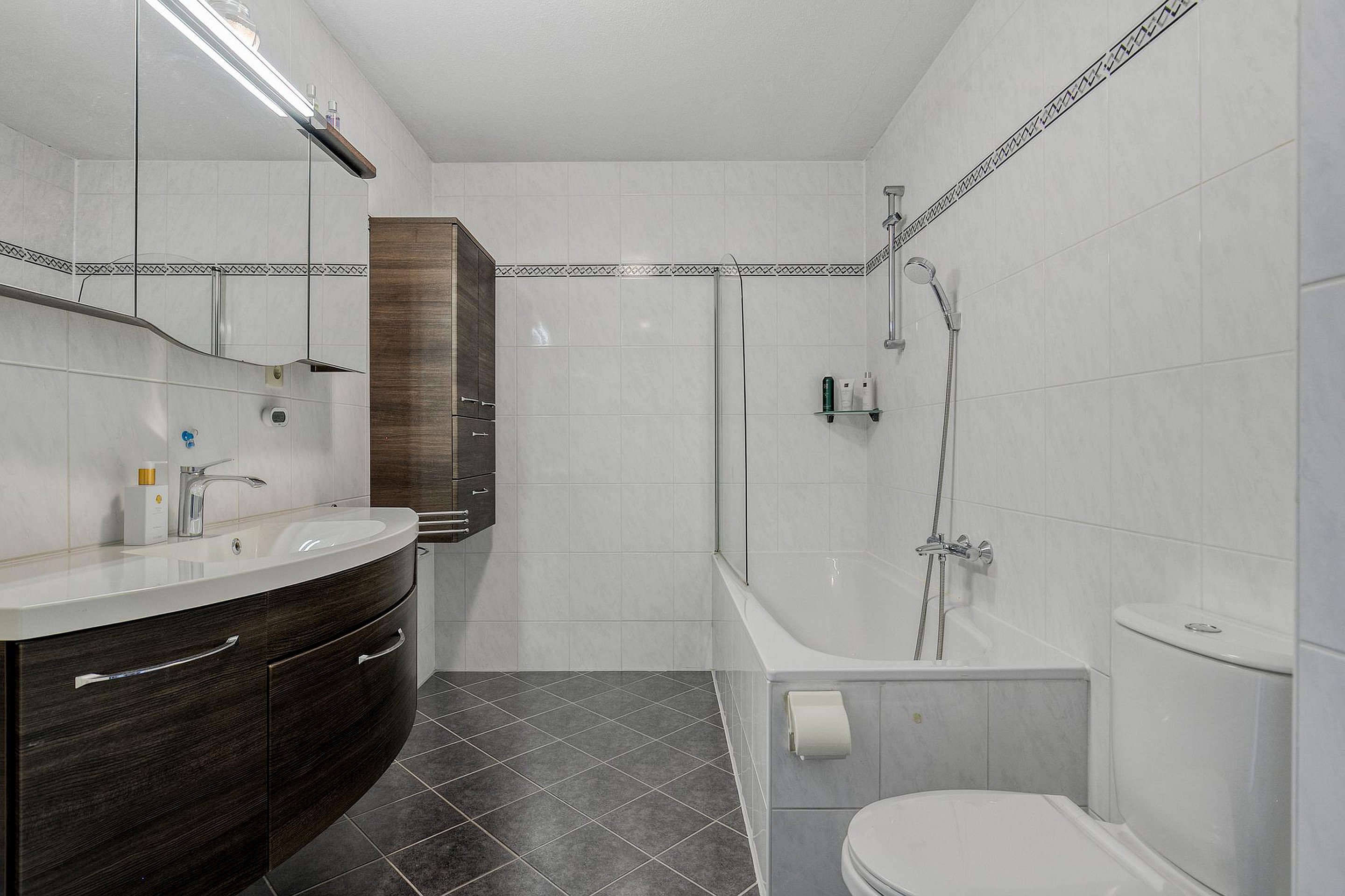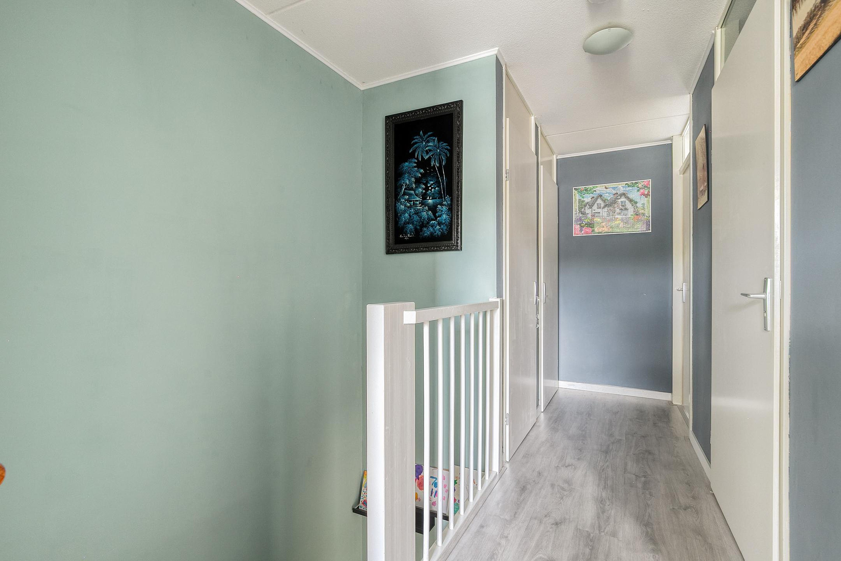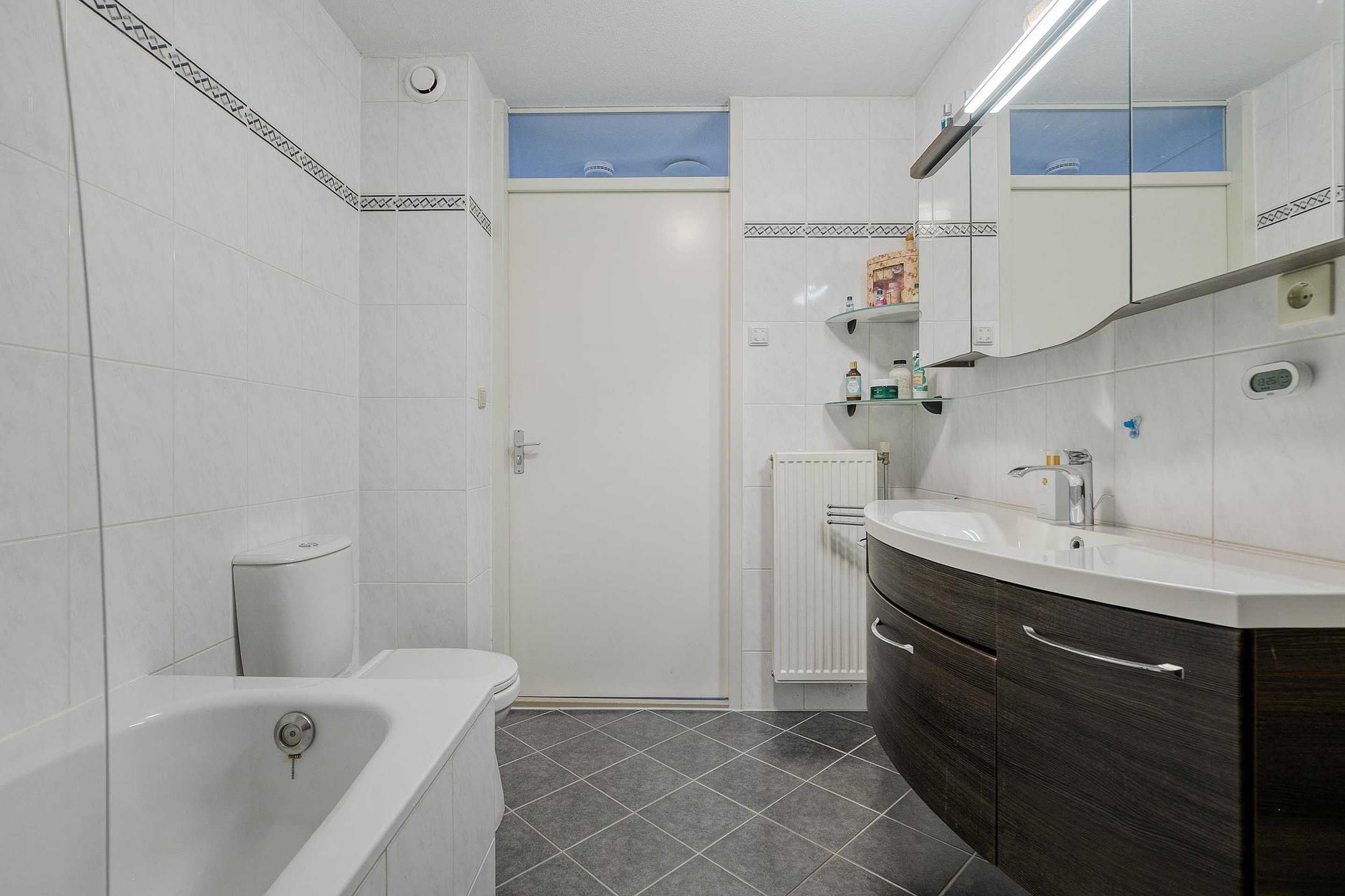 Overloop met twee vaste kasten (wasmachineaansluiting en CV-opstelling, ketel uit 2022) en toegang tot drie slaapkamers en de badkamer. De volledig betegelde badkamer is voorzien van een toilet, ligbad en wastafelmeubel.