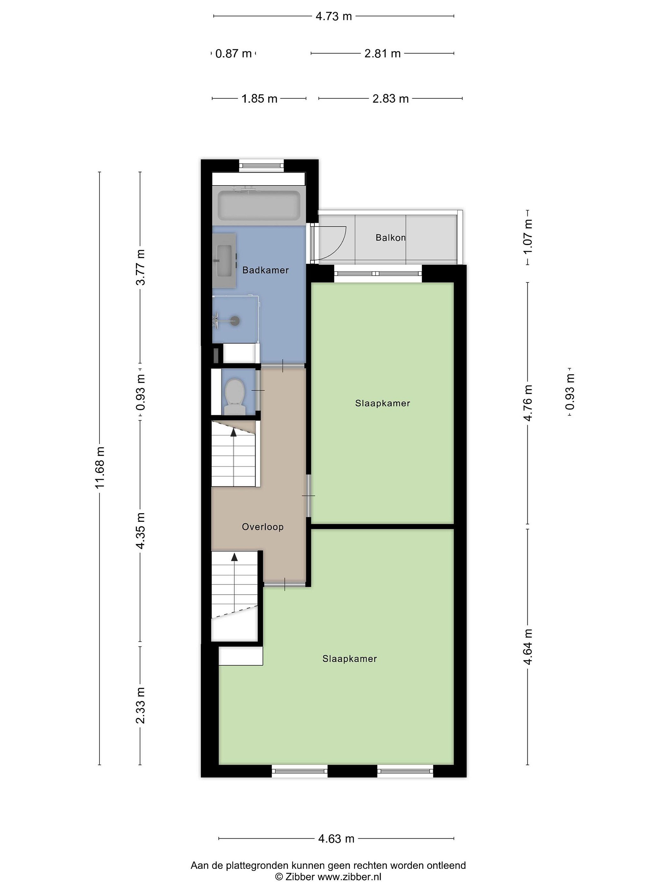 Overloop met toilet en toegang tot een slaapkamer aan de voorzijde en een slaapkamer aan de achterzijde van de woning. Beide zijn voorzien van een laminaatvloer. De badkamer bevindt zich aan de achterzijde en heeft een douche, ligbad en wastafelmeubel. Vanuit de badkamer is het balkon toegankelijk.