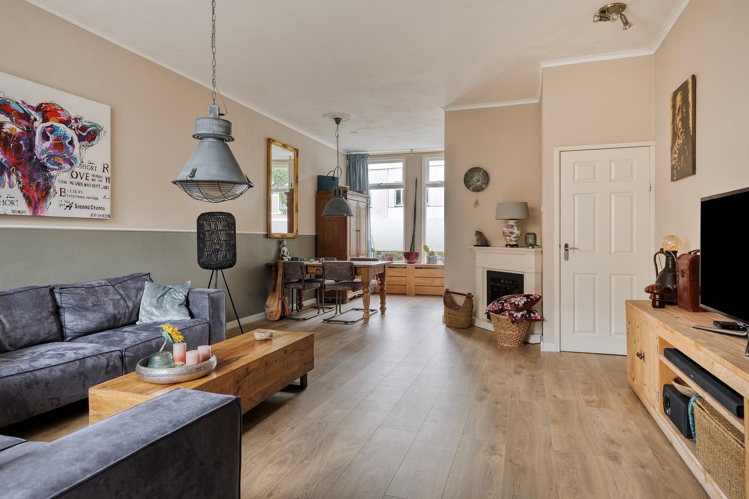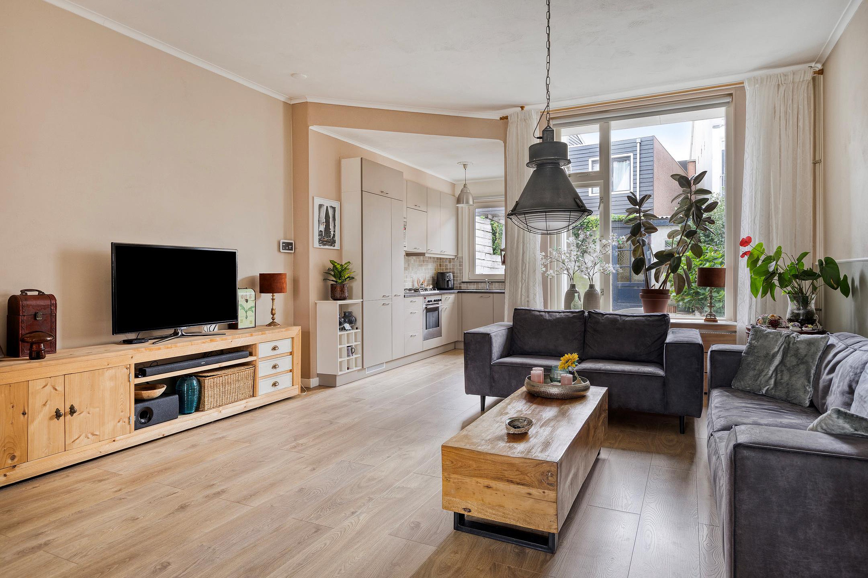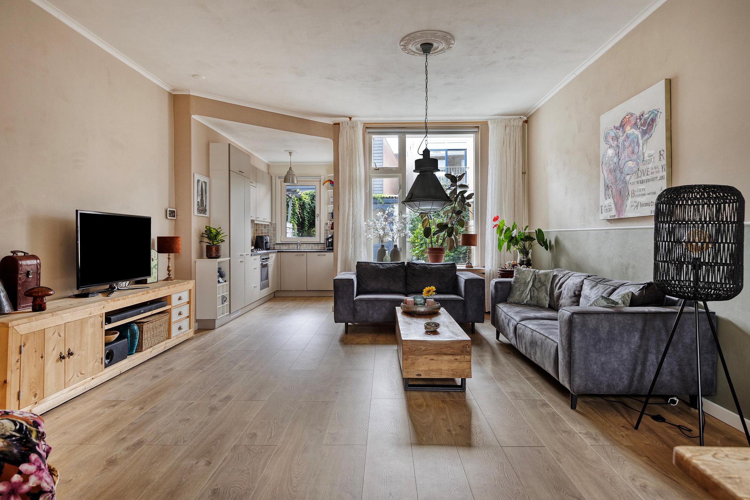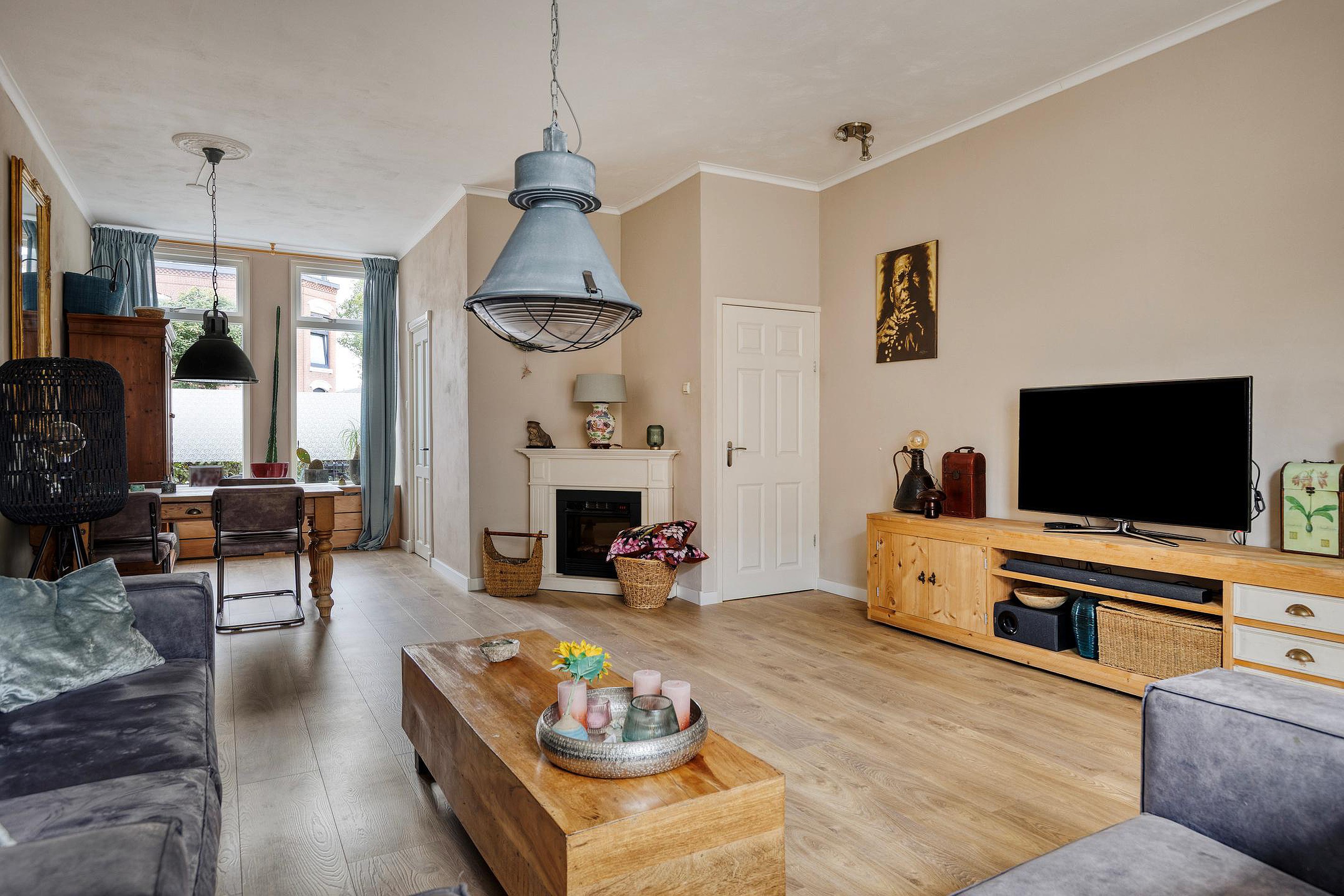 Ruime woonkamer met laminaatvloer, gestucte wanden en plafonds, een schouw met elektrische haard, open keuken en toegang tot de achtertuin.