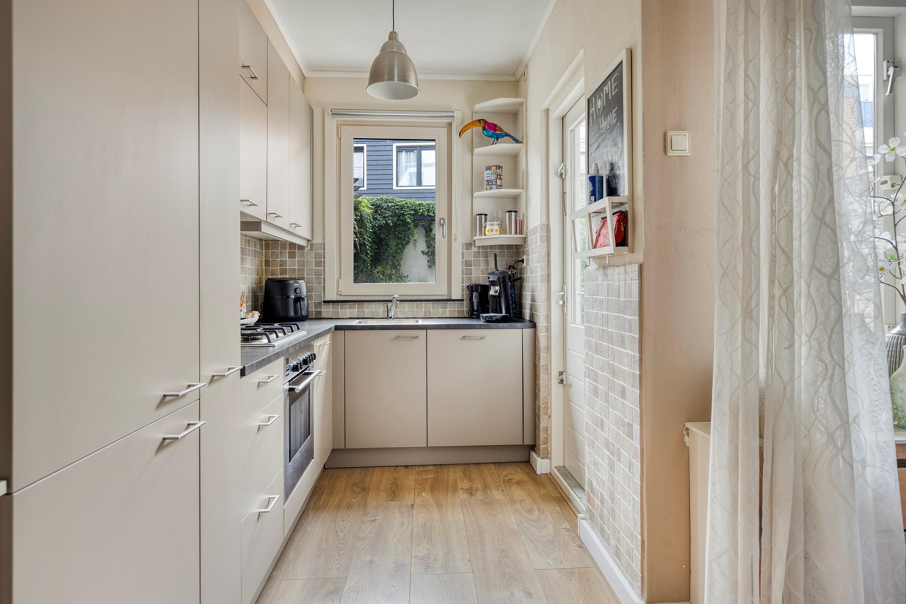 De keuken is in 2025 gerenoveerd en heeft een in hoek opgestelde keukeninrichting met voldoende werk- en bergruimte en inbouwapparatuur, waaronder een vaatwasser, oven, magnetron, koel-/vriescombinatie, afzuigkap en gaskookplaat.