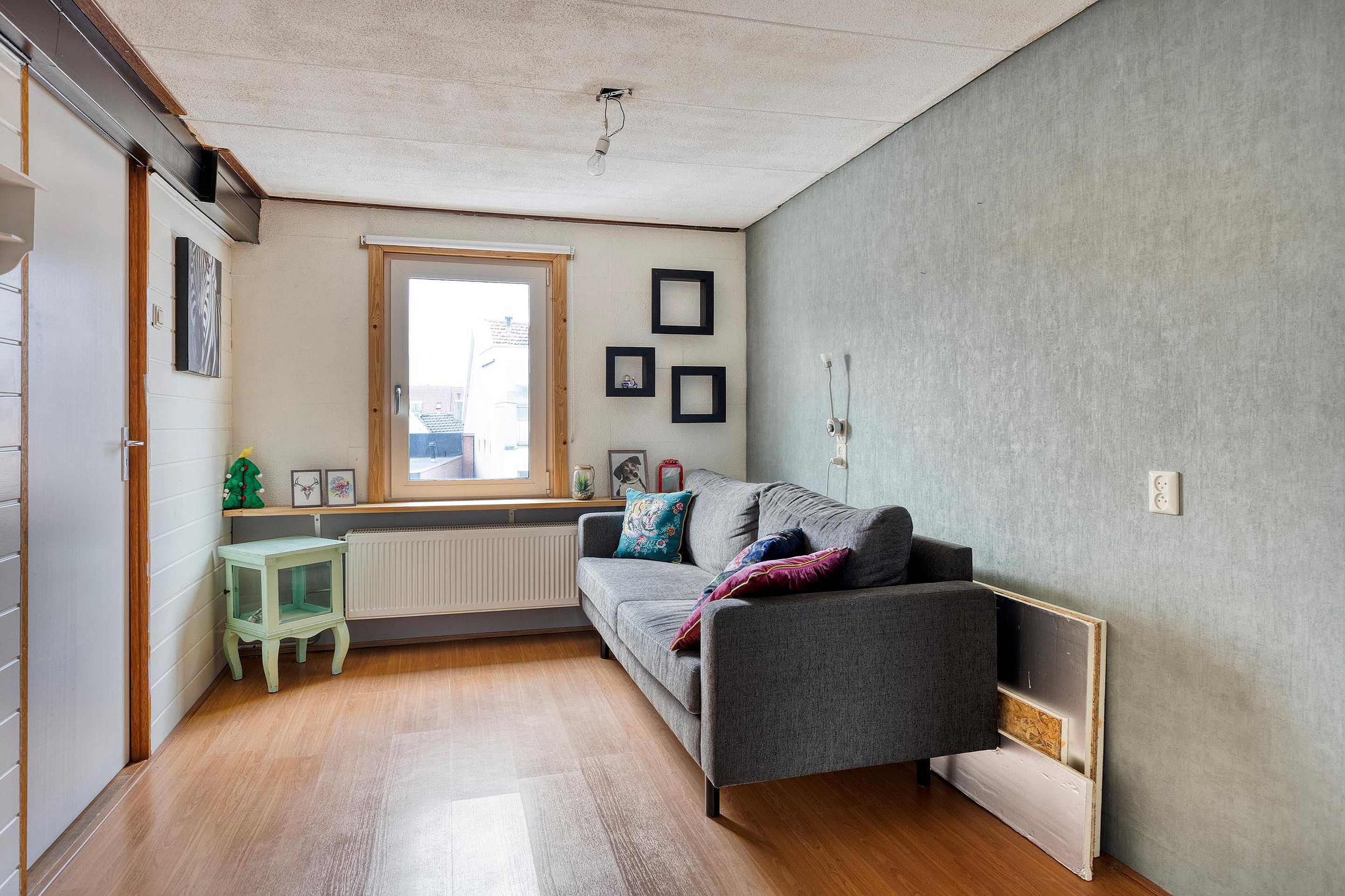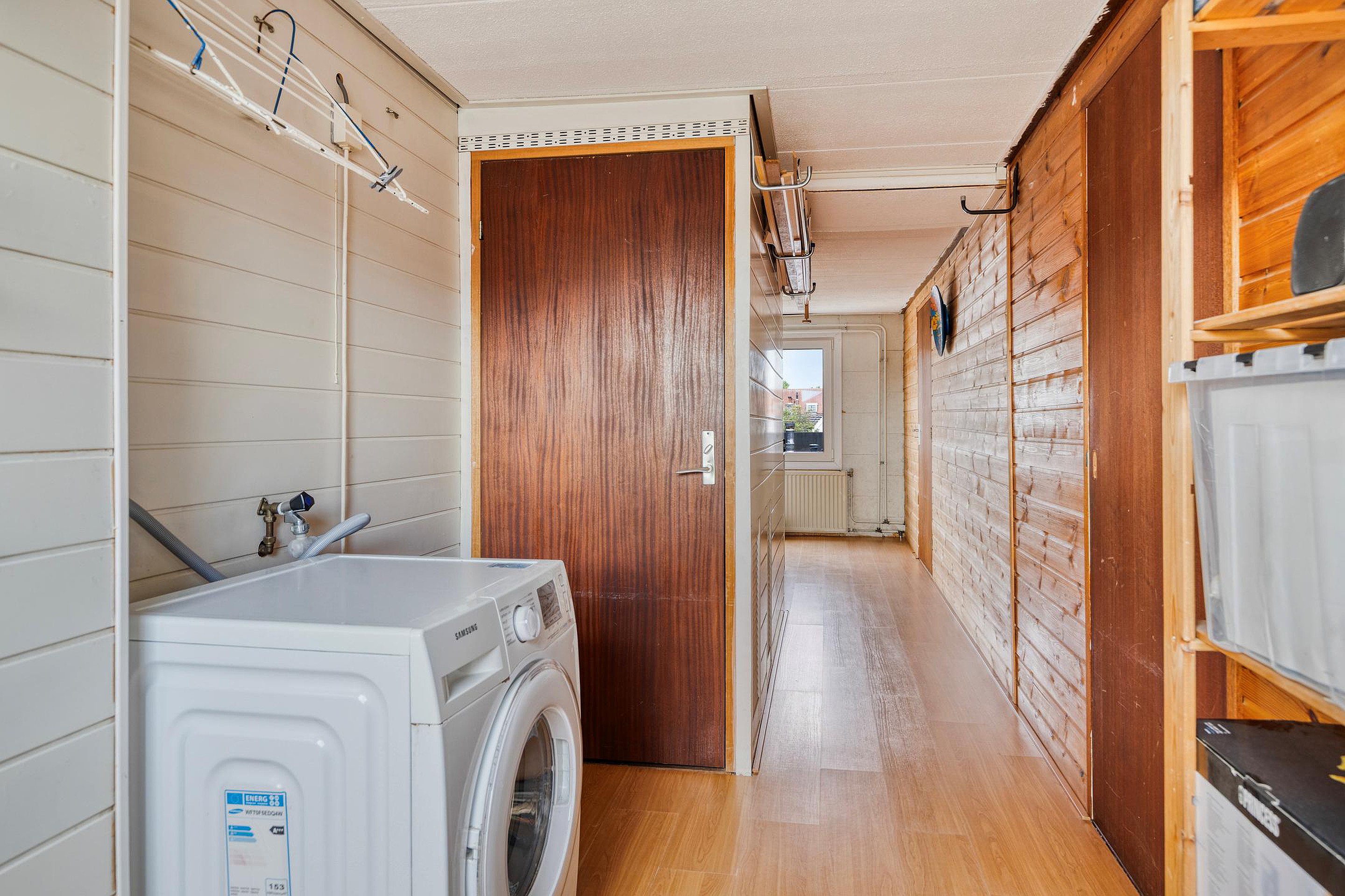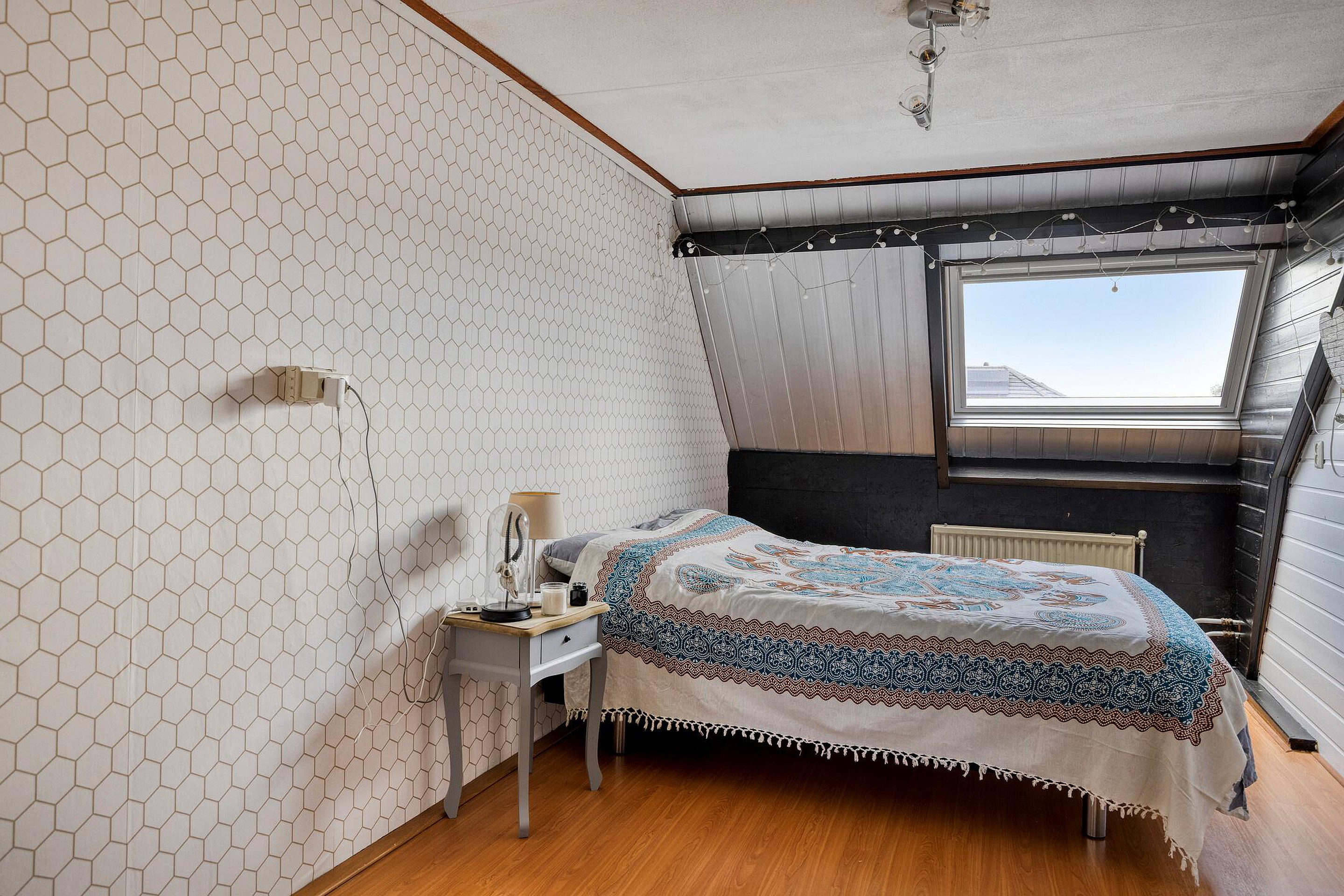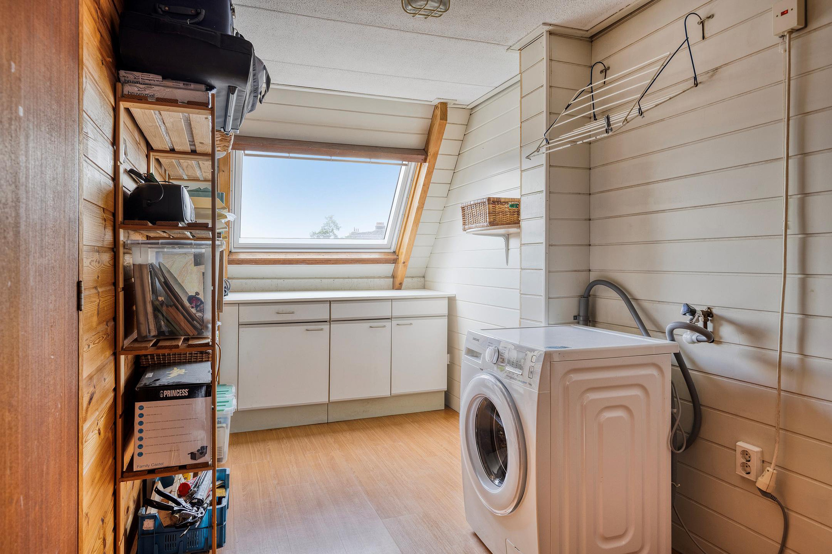Overloop met toegang tot alle vertrekken. Op deze verdieping bevinden zich 2 slaapkamers, beiden met laminaatvloer, en een wasruimte met aansluiting voor wasmachine en droger. De wasruimte en de slaapkamer aan de voorzijde hebben een dakraam.