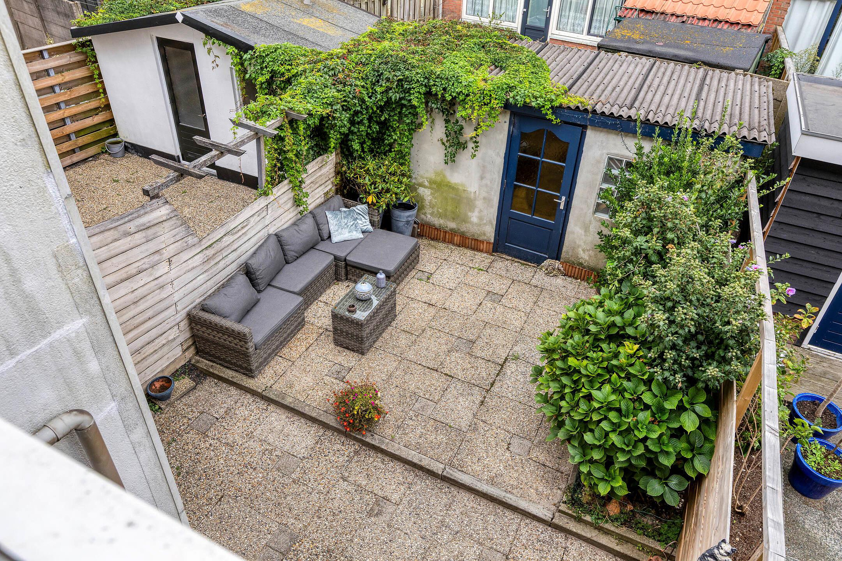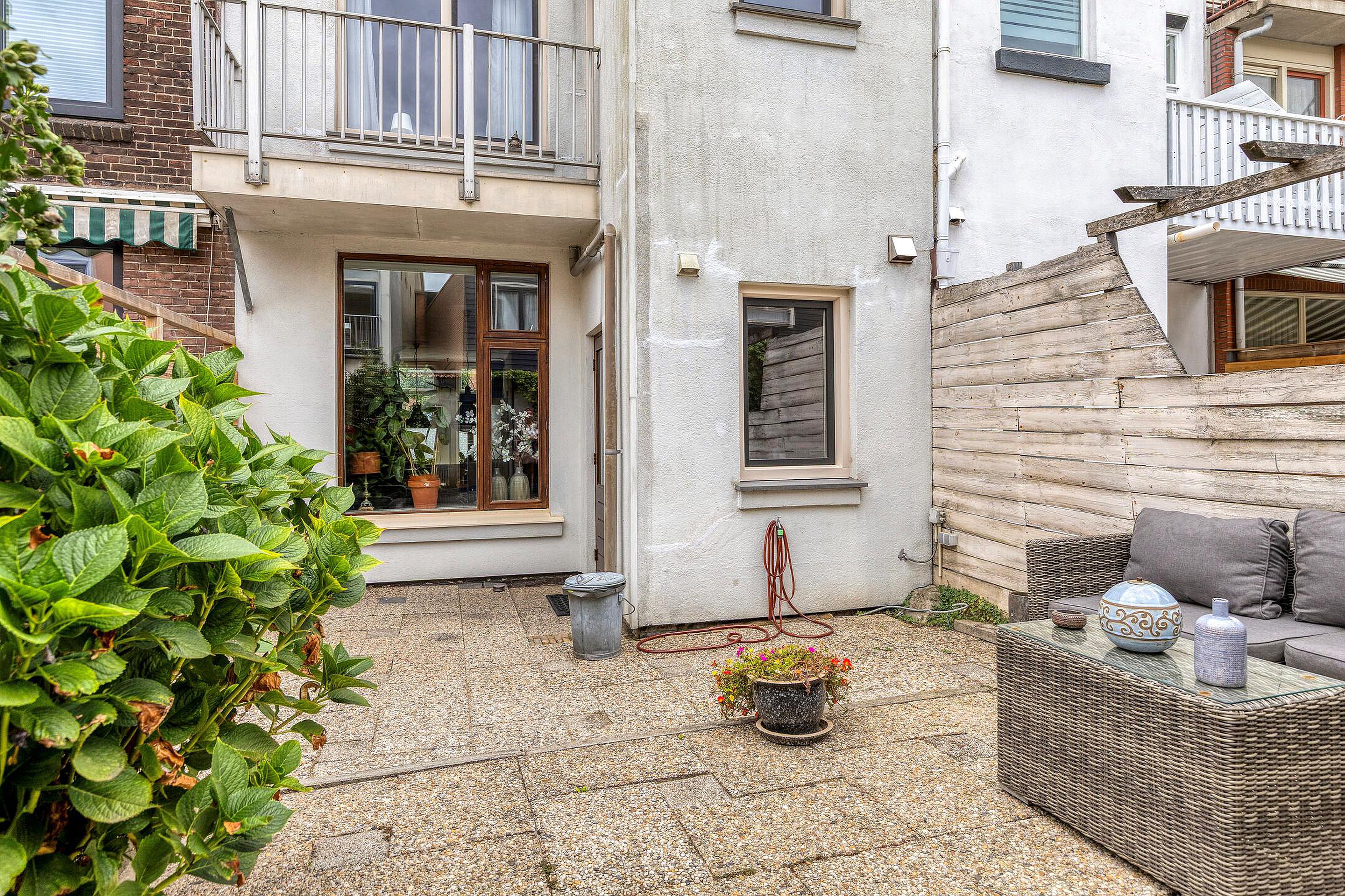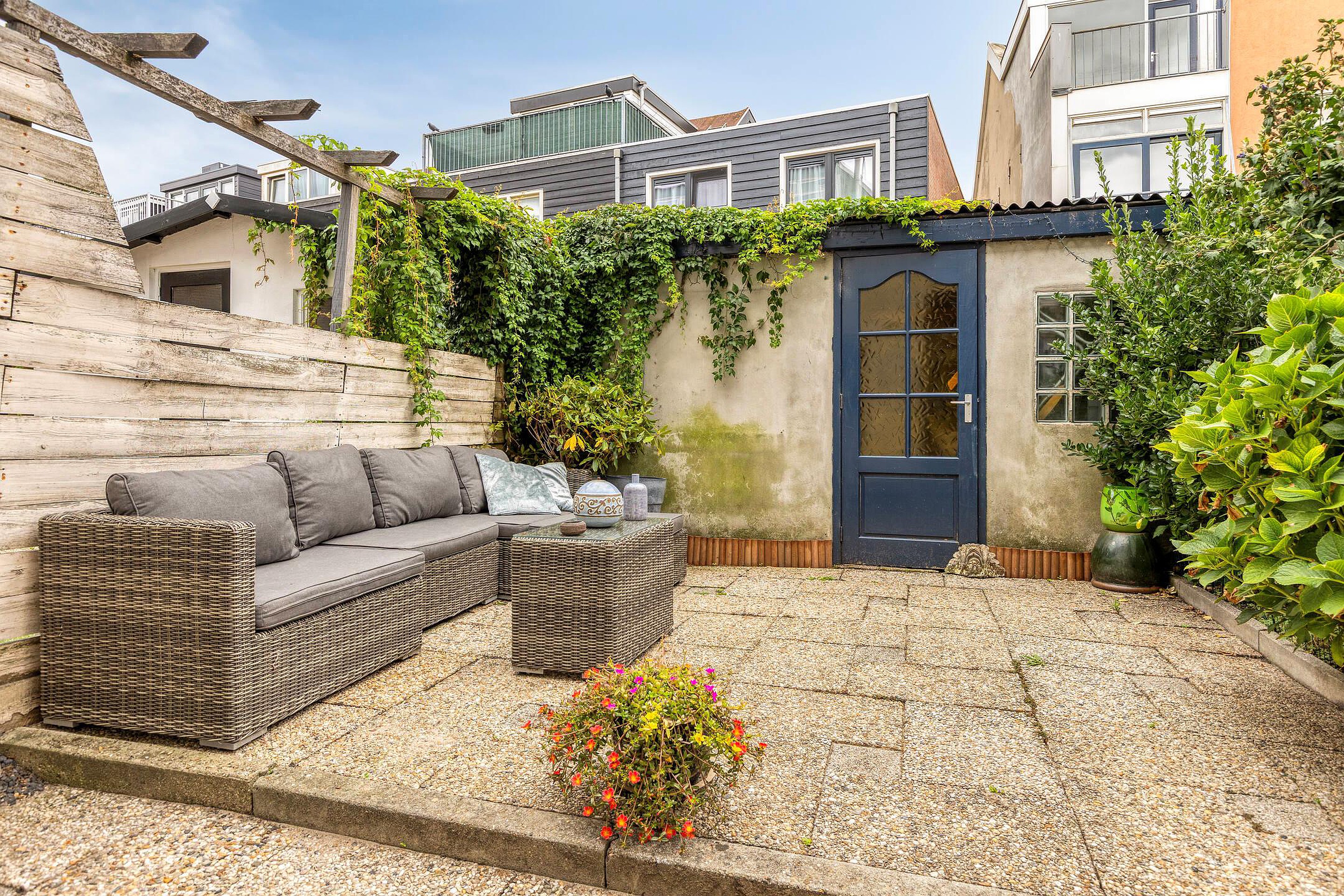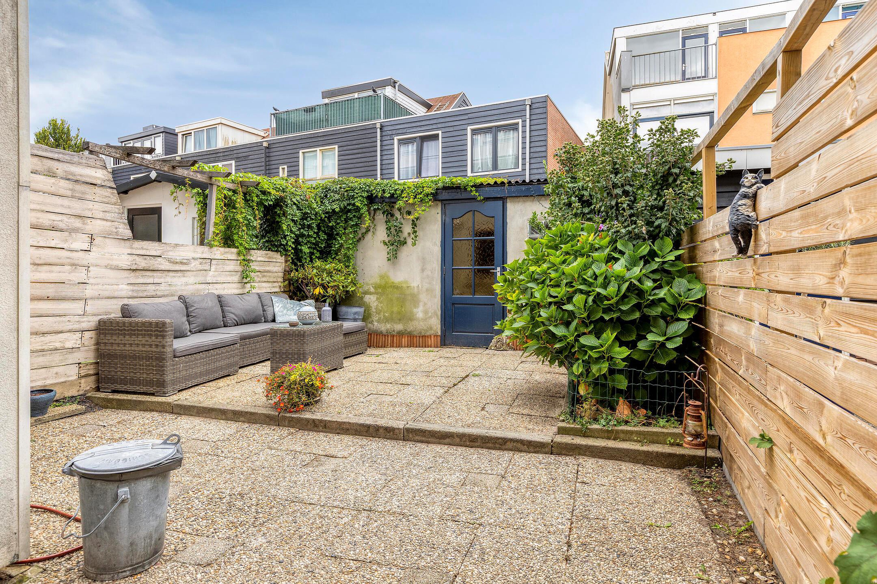De tuin is onderhoudsvriendelijk met bestrating en groene borders, heeft een berging en is gelegen op het zuiden.