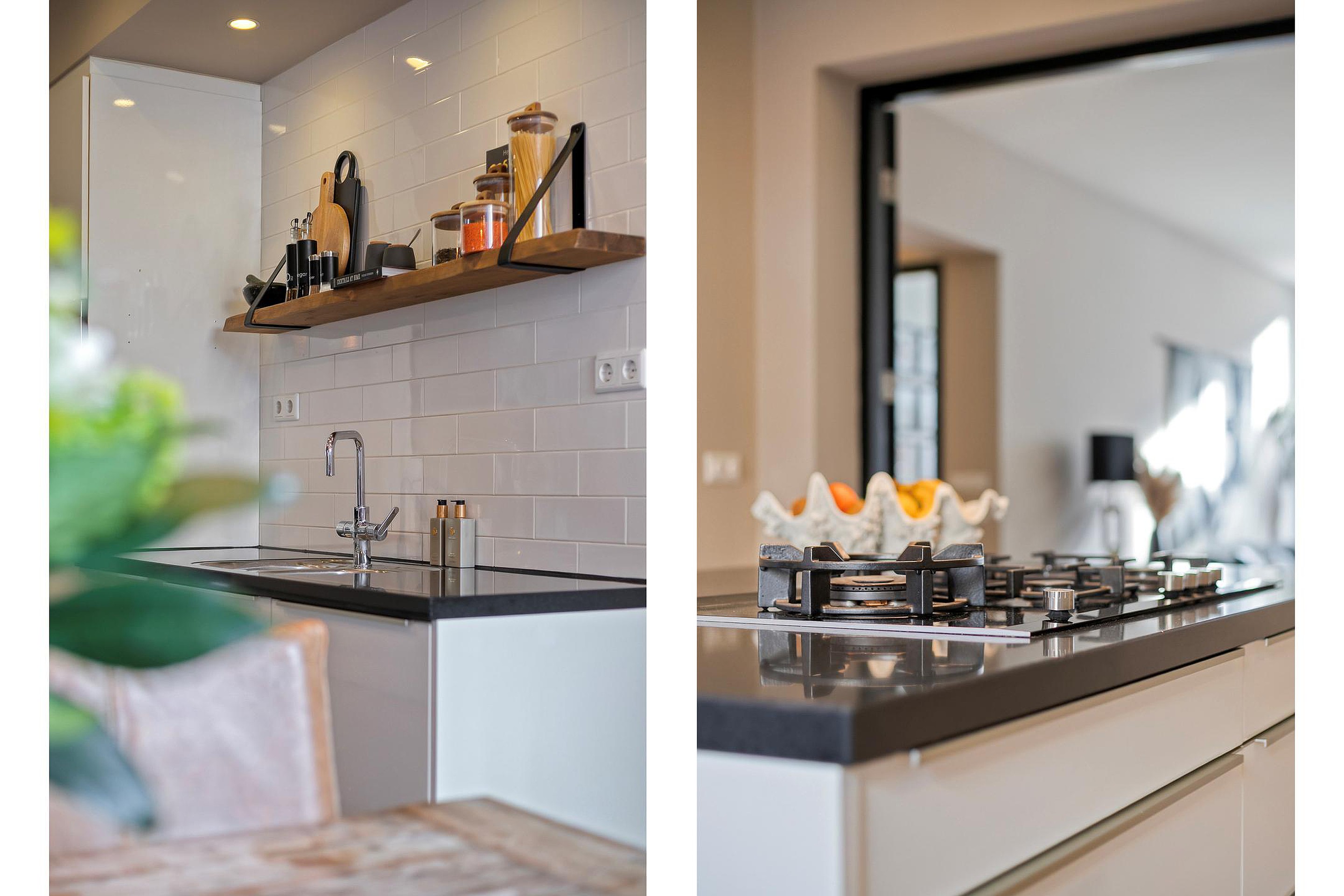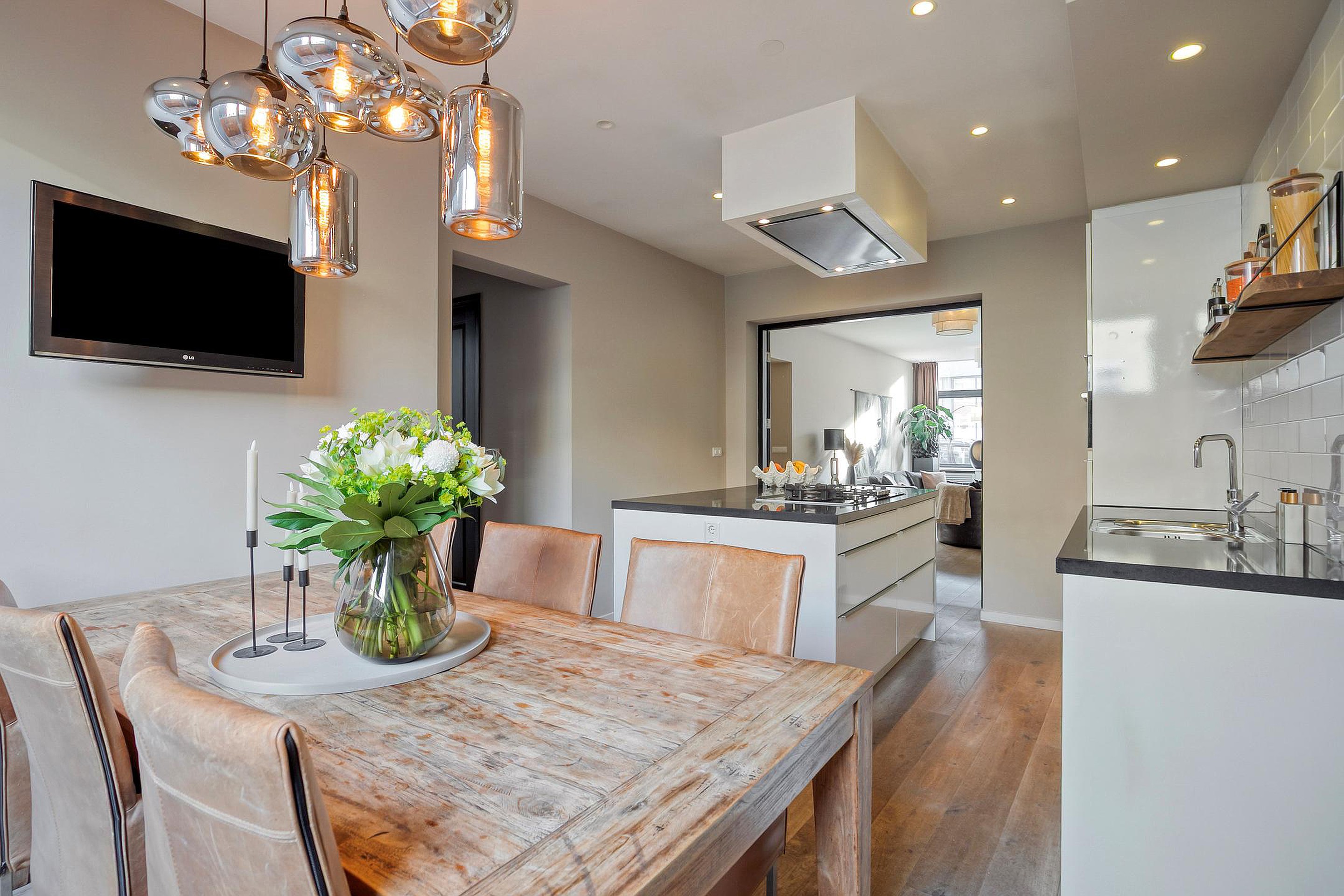 Via openslaande deuren is de keuken bereikbaar. Deze is in 2013 gerealiseerd en uitgevoerd met een kookeiland en diverse inbouwapparatuur, waaronder een 5-pits gaskookplaat met afzuigkap, twee koelkasten, een separate vriezer, vaatwasser en combimagnetron. Vanuit de keuken is de beschutte binnenplaats van circa 5 m2 bereikbaar. Deze binnenplaats is zodanig gesitueerd dat het mogelijk is om in de toekomst een vaste trap te realiseren naar het dakterras, waarmee de buitenruimtes van de begane grond en eerste verdieping optimaal met elkaar verbonden kunnen worden.