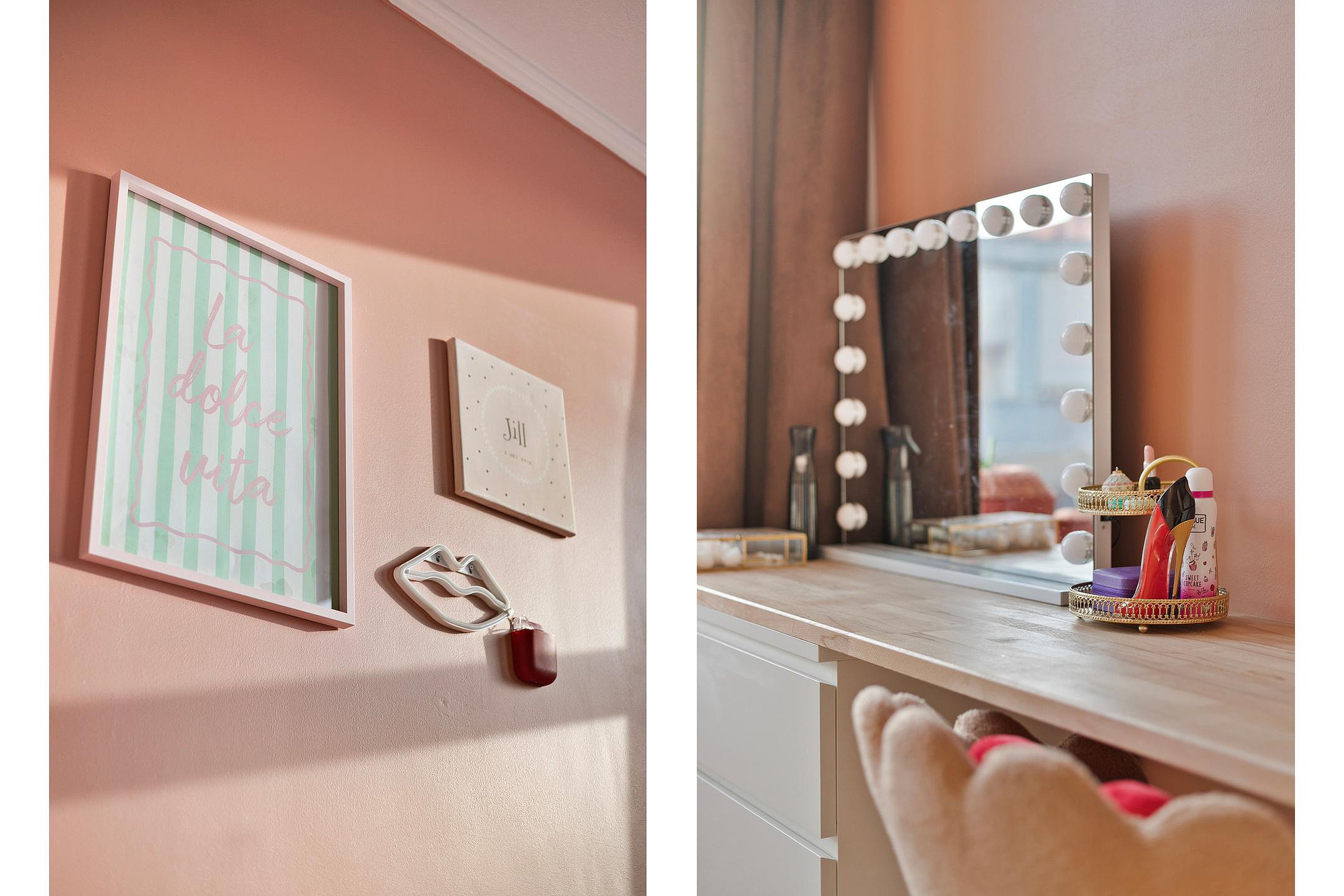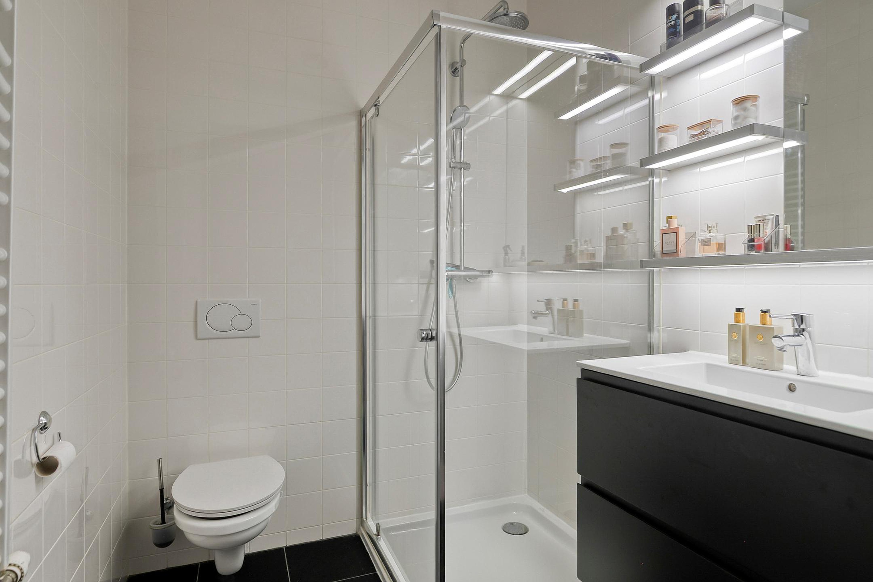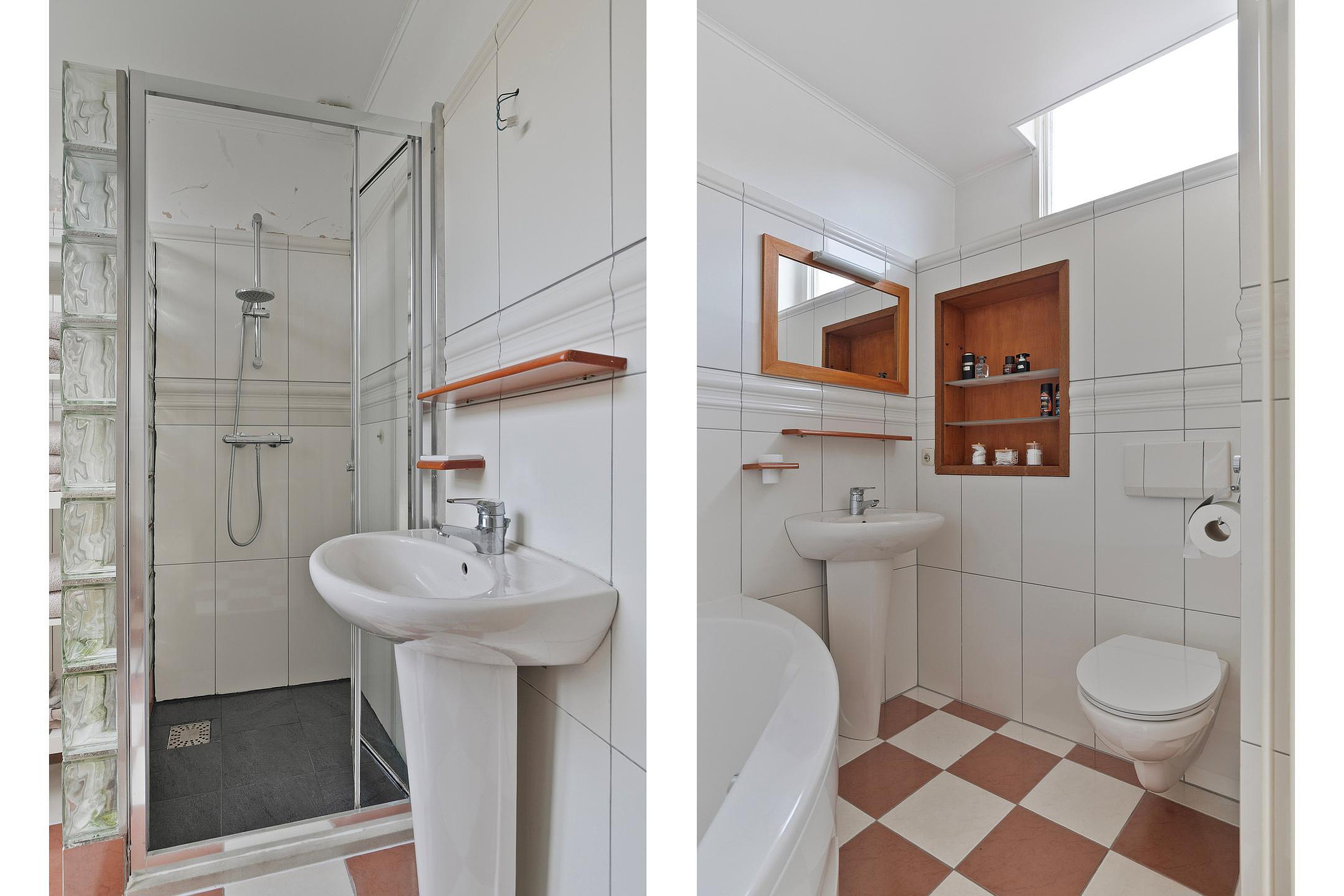Aan de achterzijde van de woning bevinden zich twee slaapkamers en een volledig betegelde badkamer met douchecabine, wastafelmeubel en toilet. Twee ruimtes zijn voorzien van dakkoepels voor extra daglicht. Vanuit zowel een slaapkamer als de berging is de zij-ingang bereikbaar, wat deze verdieping bijzonder geschikt maakt voor werken aan huis.