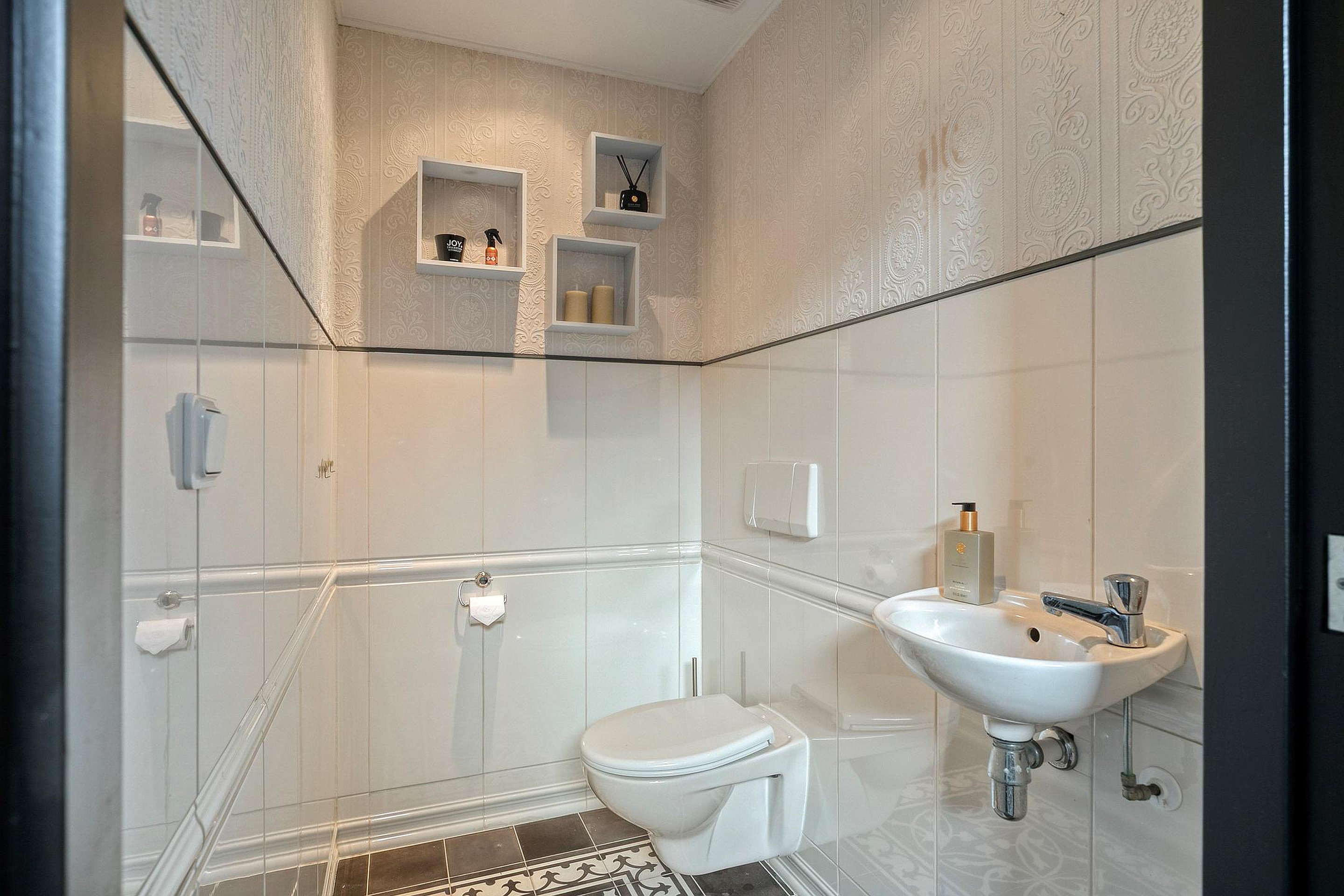 Royale entree met garderobekast, deels betegeld toilet met fonteintje en trapopgang naar de eerste verdieping. De woonkamer is ruim en sfeervol en voorzien van een echte open haard. De prettige maatvoering en lichtinval zorgen hier voor een aangename leefruimte.