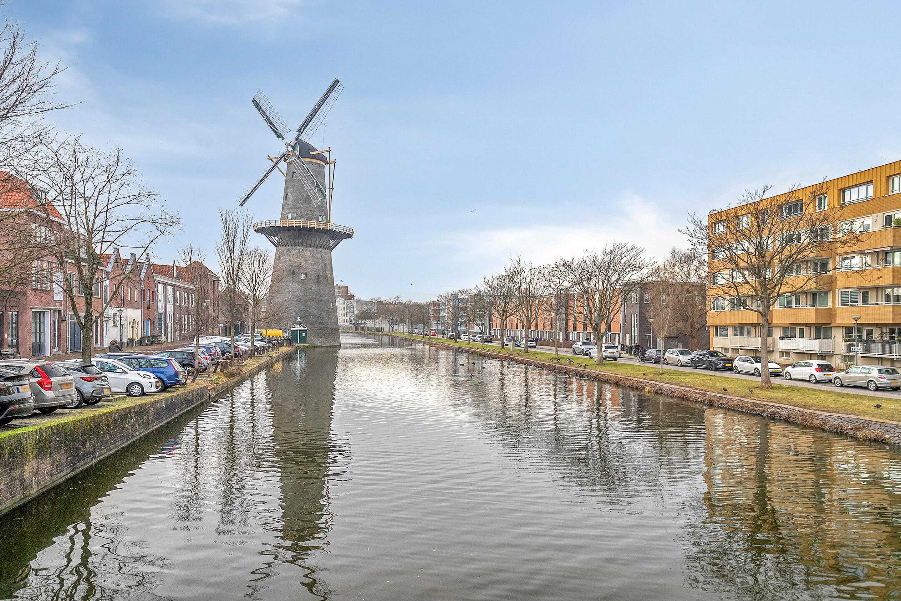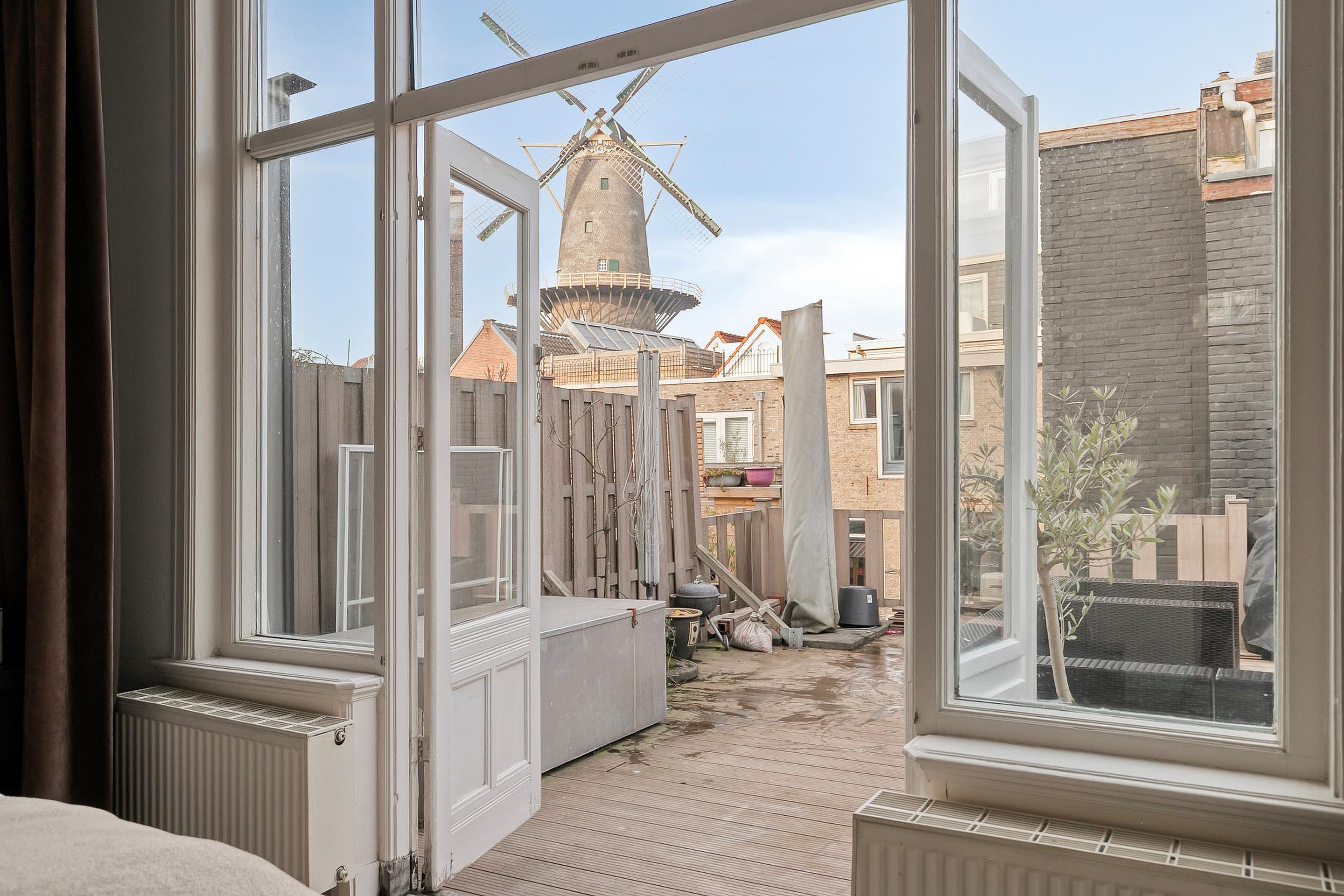 Vanuit zowel de badkamer als de achterslaapkamer is er toegang tot het royale dakterras van circa 53 m2. Hier geniet u van rust, privacy en een vrij uitzicht op molen De Vrijheid — een zeldzaam en blijvend icoon in het Schiedamse straatbeeld.