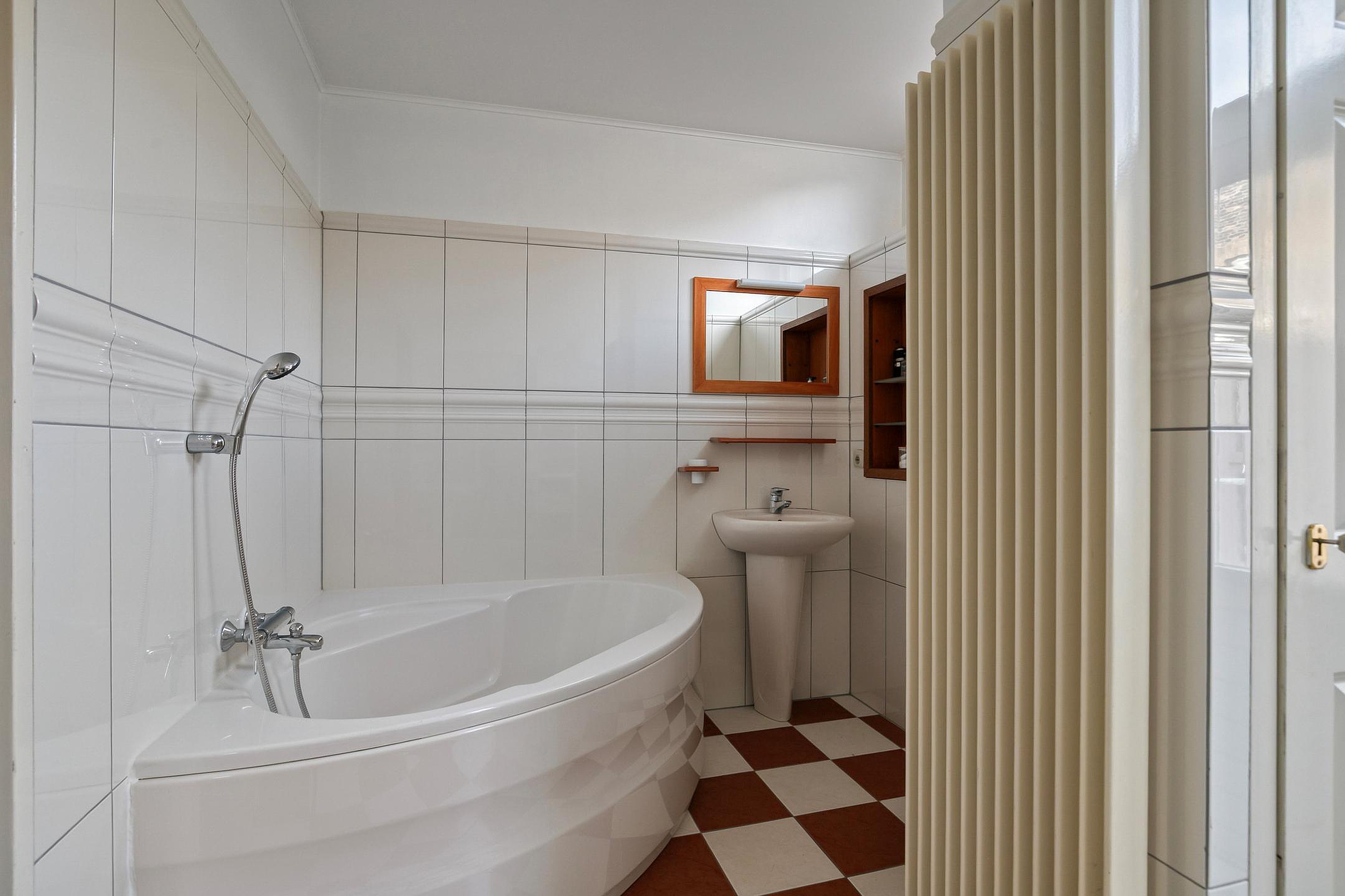 Overloop met toegang tot drie ruime slaapkamers, waarvan één aan de achterzijde en twee aan de voorzijde. De badkamer is deels betegeld en voorzien van een hoekbad, separate douchehoek, dubbele wastafel en toilet. Tevens zijn hier de aansluitingen voor wasmachine en droger aanwezig.