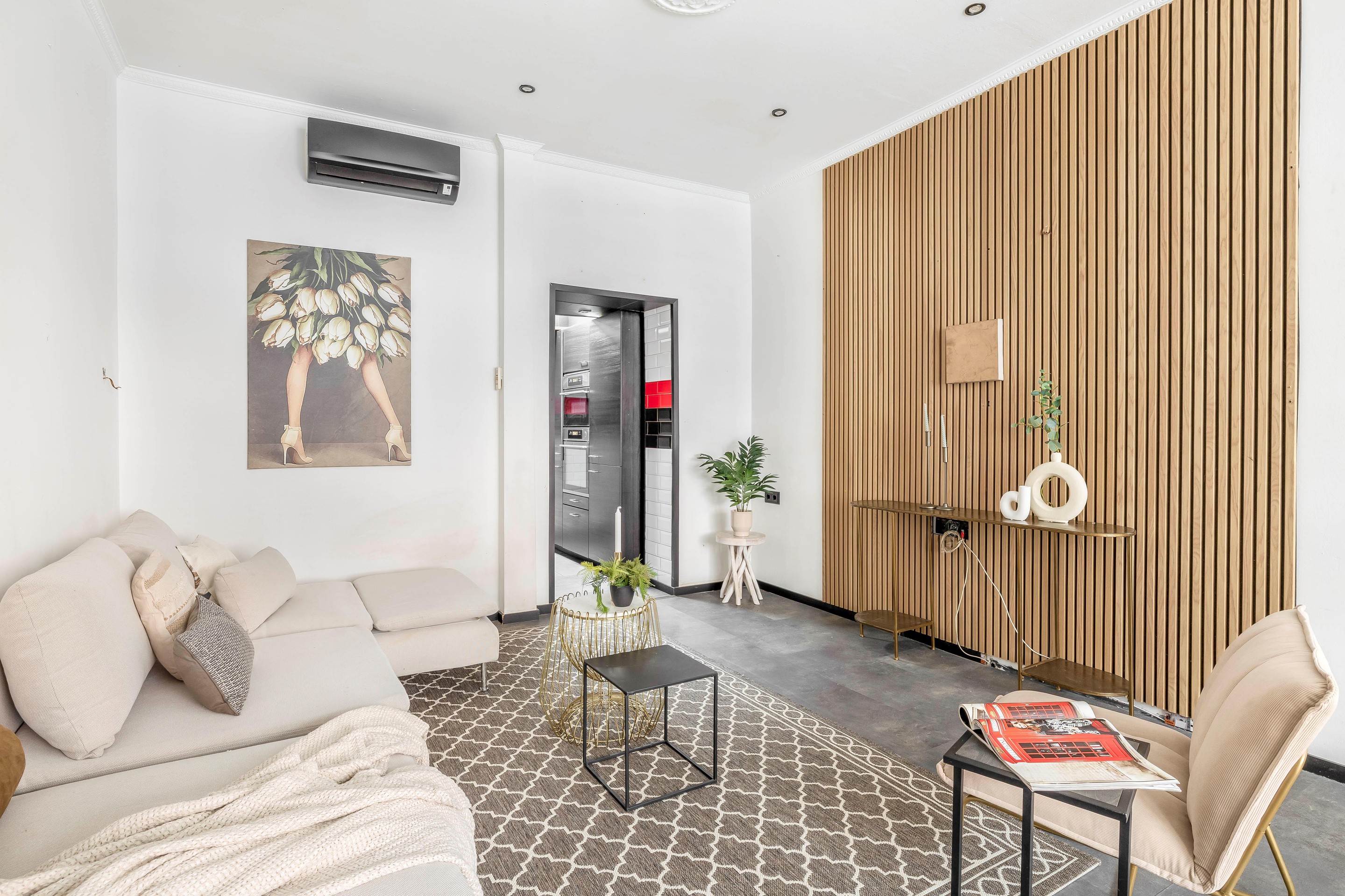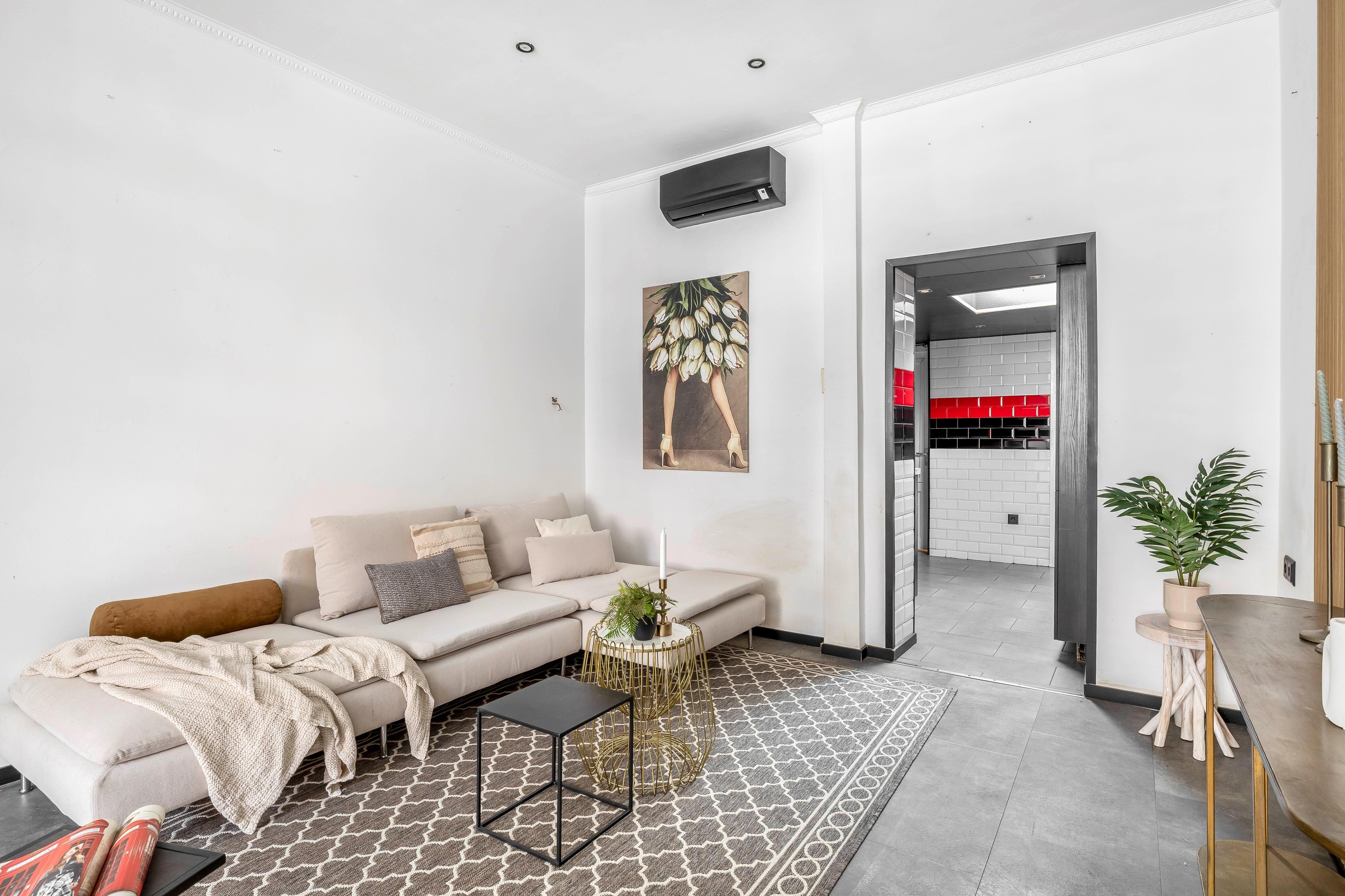 Je komt binnen in een hal die toegang biedt tot de ruime woonkamer. De woonkamer heeft een prettige lichtinval en genoeg ruimte voor een gezellige zithoek én eettafel. Dankzij de openslaande ramen aan de voorzijde heb je een fijne connectie met buiten. Bovendien is de woonkamer voorzien van airconditioning ideaal tijdens warme zomerdagen.