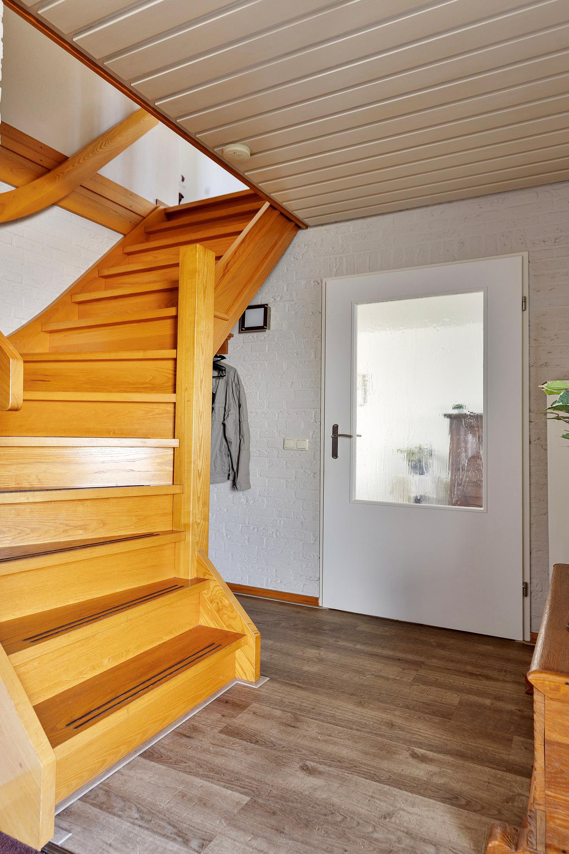 Begane grond Via de entree/hal betreedt u de woning. In de hal bevinden zich het geheel betegelde toilet met staand closet en fonteintje, de trapopgang naar de eerste verdieping en de toegang tot de woonkamer en de keuken. De nette laminaat-vloer in de hal loopt naadloos door in de woonkamer en keuken en zorgt voor een rustige, moderne en stijlvolle uitstraling.
