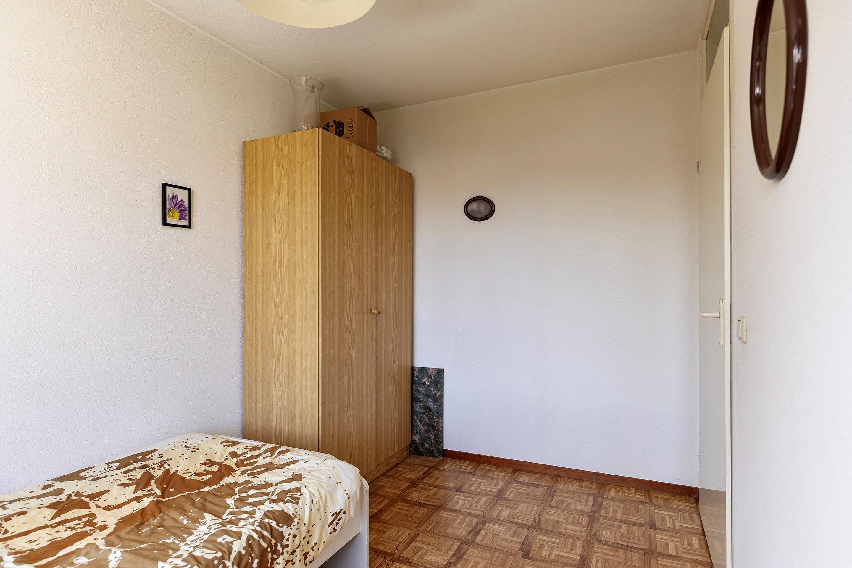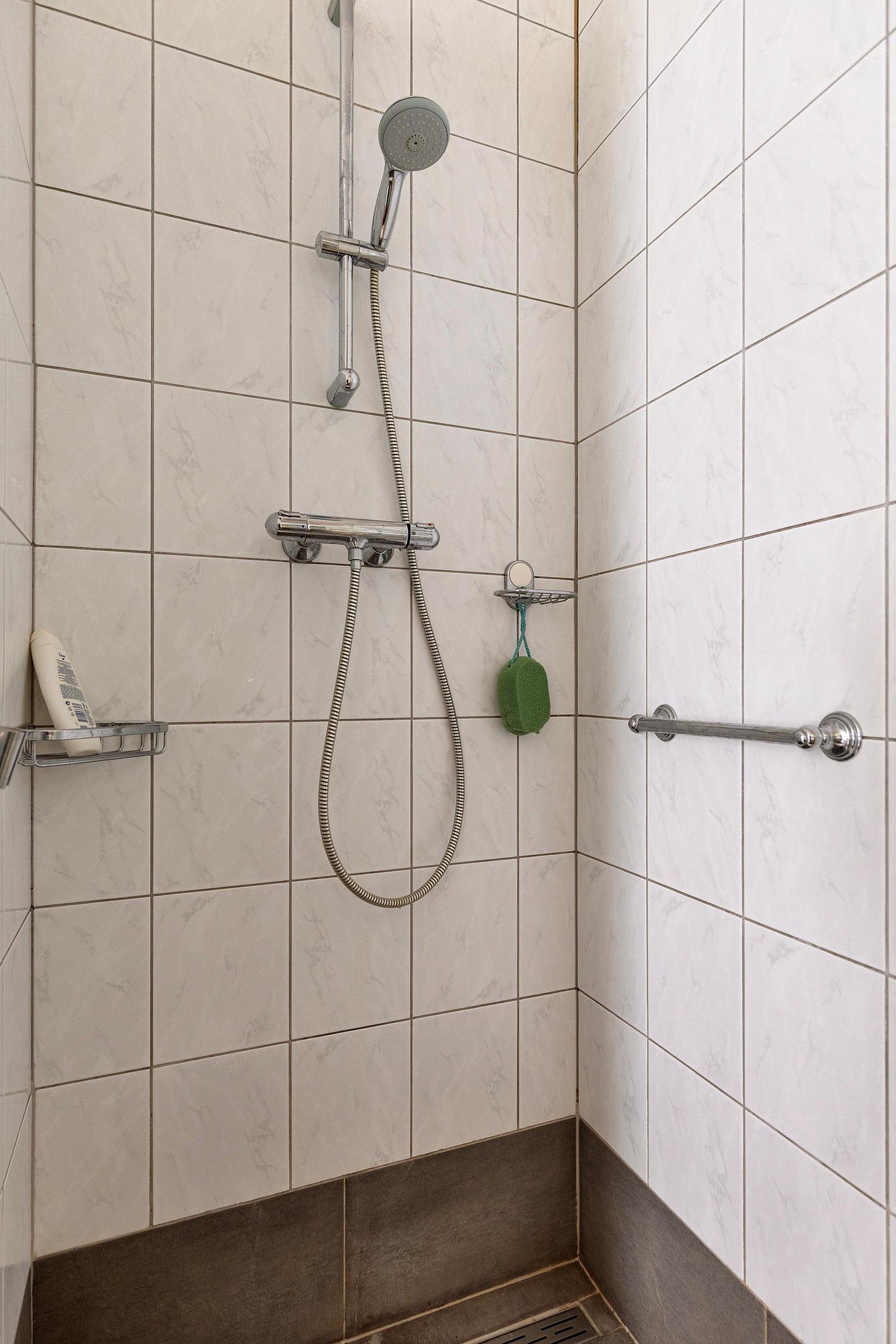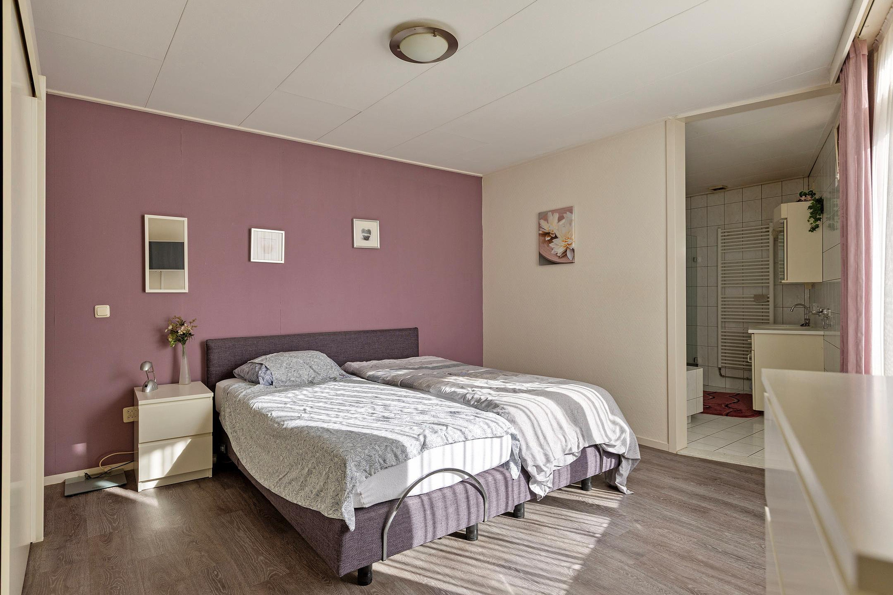 De ruime slaapkamer is rustig gelegen aan de achterzijde van de woning en biedt een prettig uitzicht op de tuin. De kamer is verzorgd afgewerkt met onder andere een pvc-vloer en gestucte wanden, wat zorgt voor een moderne en frisse uitstraling. Vanuit de slaapkamer bereikt u de volledig betegelde badkamer, die compleet is uitgevoerd met een douche, ligbad, wandcloset, wastafelmeubel en een designradiator.
