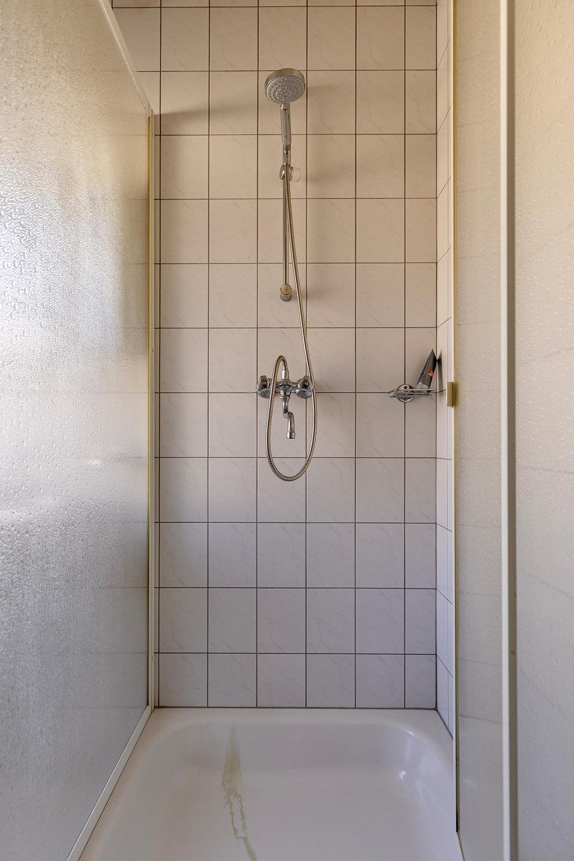 Aansluitend aan de keuken bevindt zich een praktisch tussenportaal met witgoedaansluitingen, een uitstortgootsteen en de opstelling van de cv-combi. Vanuit hier heeft u toegang tot de achtertuin, de berging en de slaapkamer. De berging is netjes afgewerkt, voorzien van de meterkast en beschikt over een loopdeur naar de oprit, wat extra gebruiksgemak biedt.