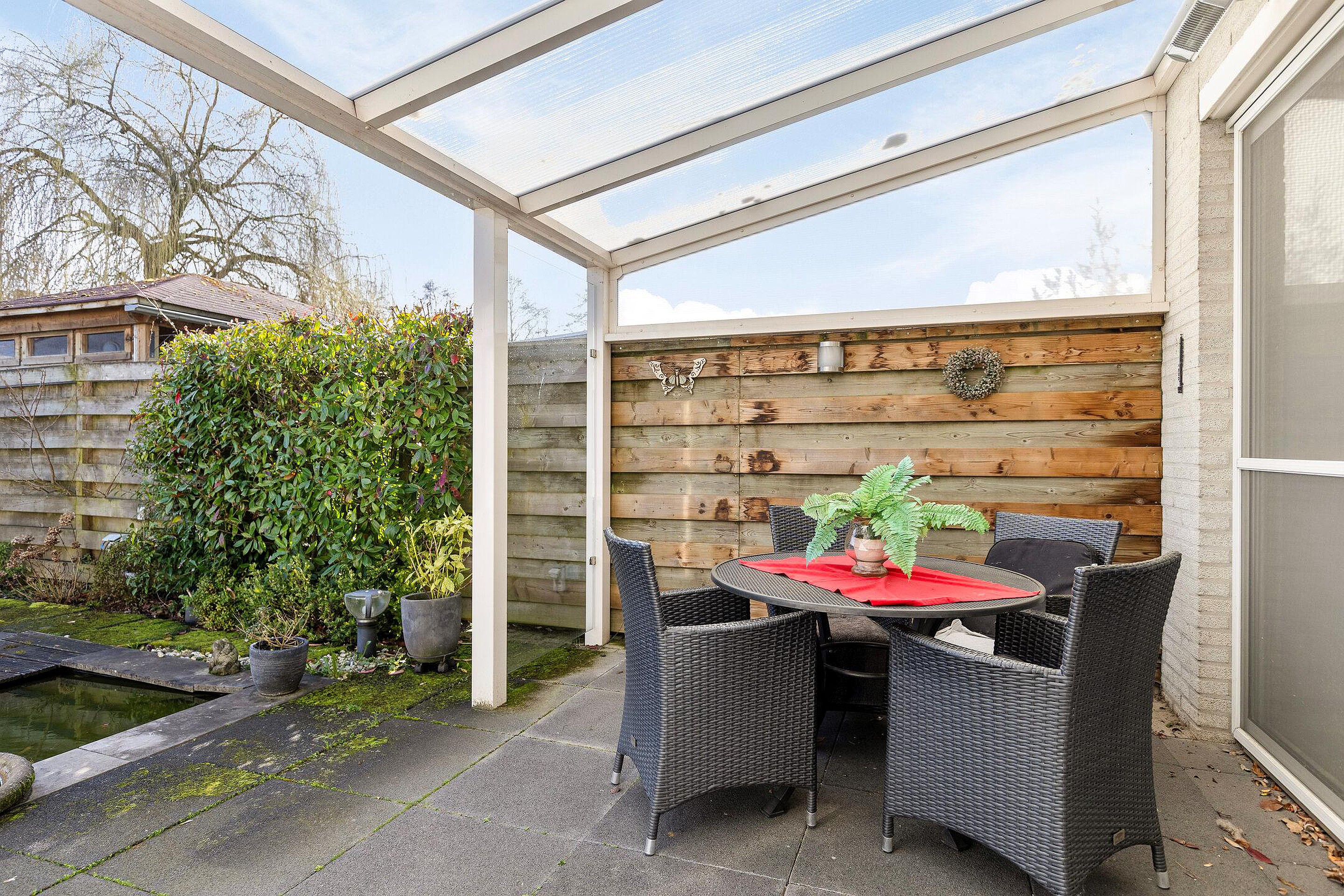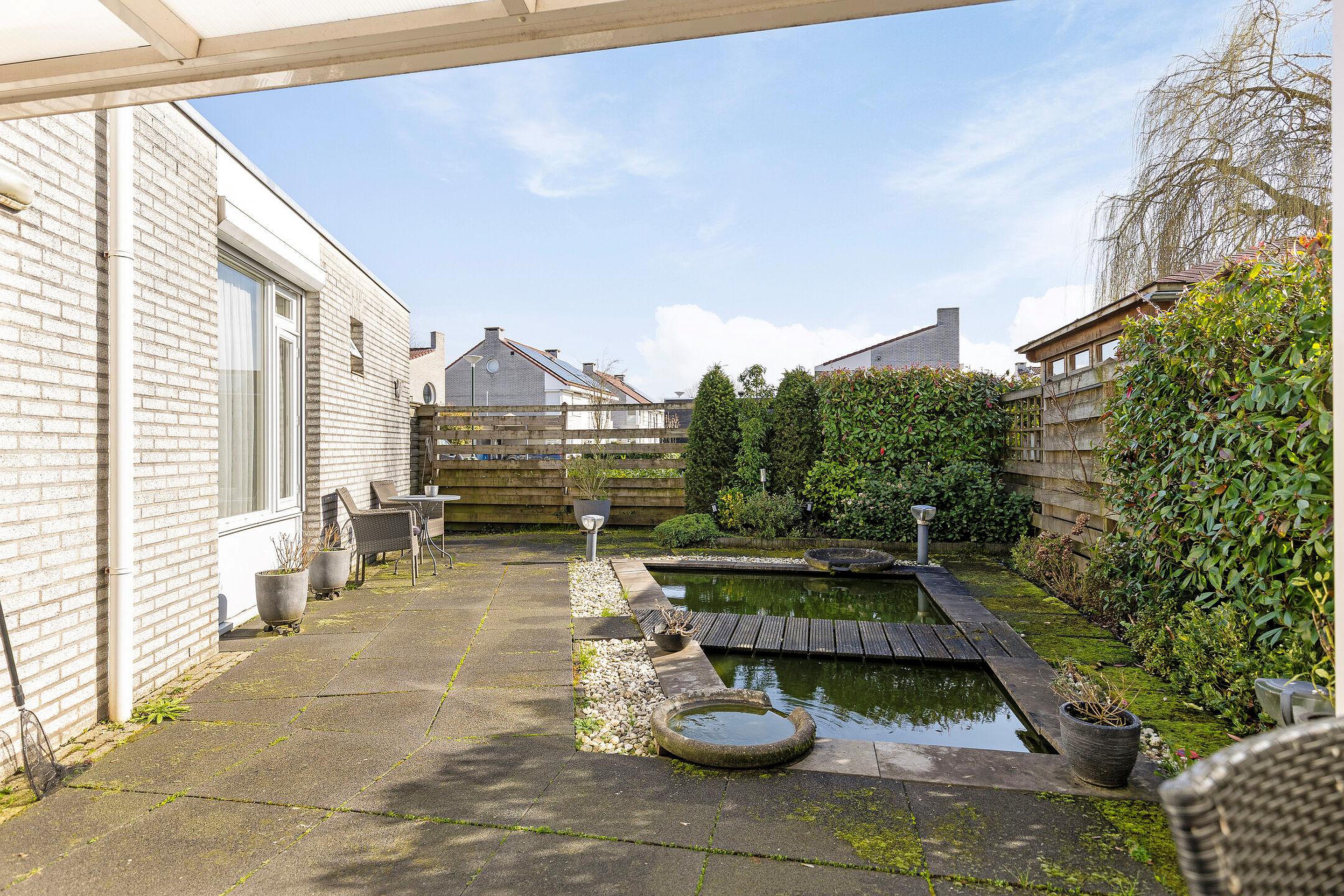 Tuin De voortuin met eigen oprit ligt aan een rustige woonstraat met enkel lokaal bestemmingsverkeer en grenst aan een groenvoorziening met waterpartij. De achtertuin is verzorgd aangelegd met een stenen terras met overkapping, vijver en diverse borders. Daarnaast is er een aluminium, onderhoudsvrije overkapping met licht doorlatende kunststof dakpanelen aanwezig. Doordat de tuin aan de achterzijde vrij ligt, geniet u hier van veel privacy.
