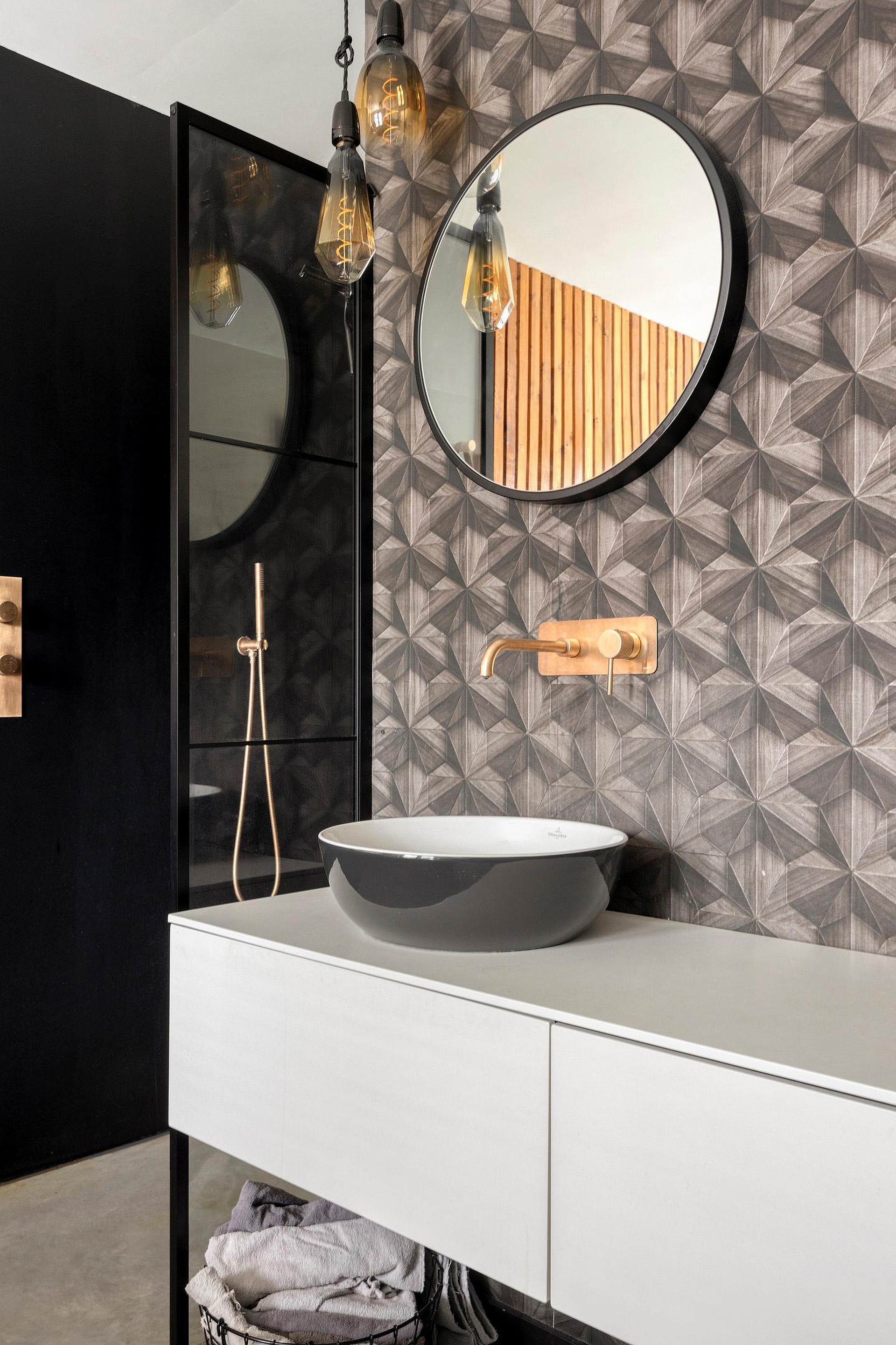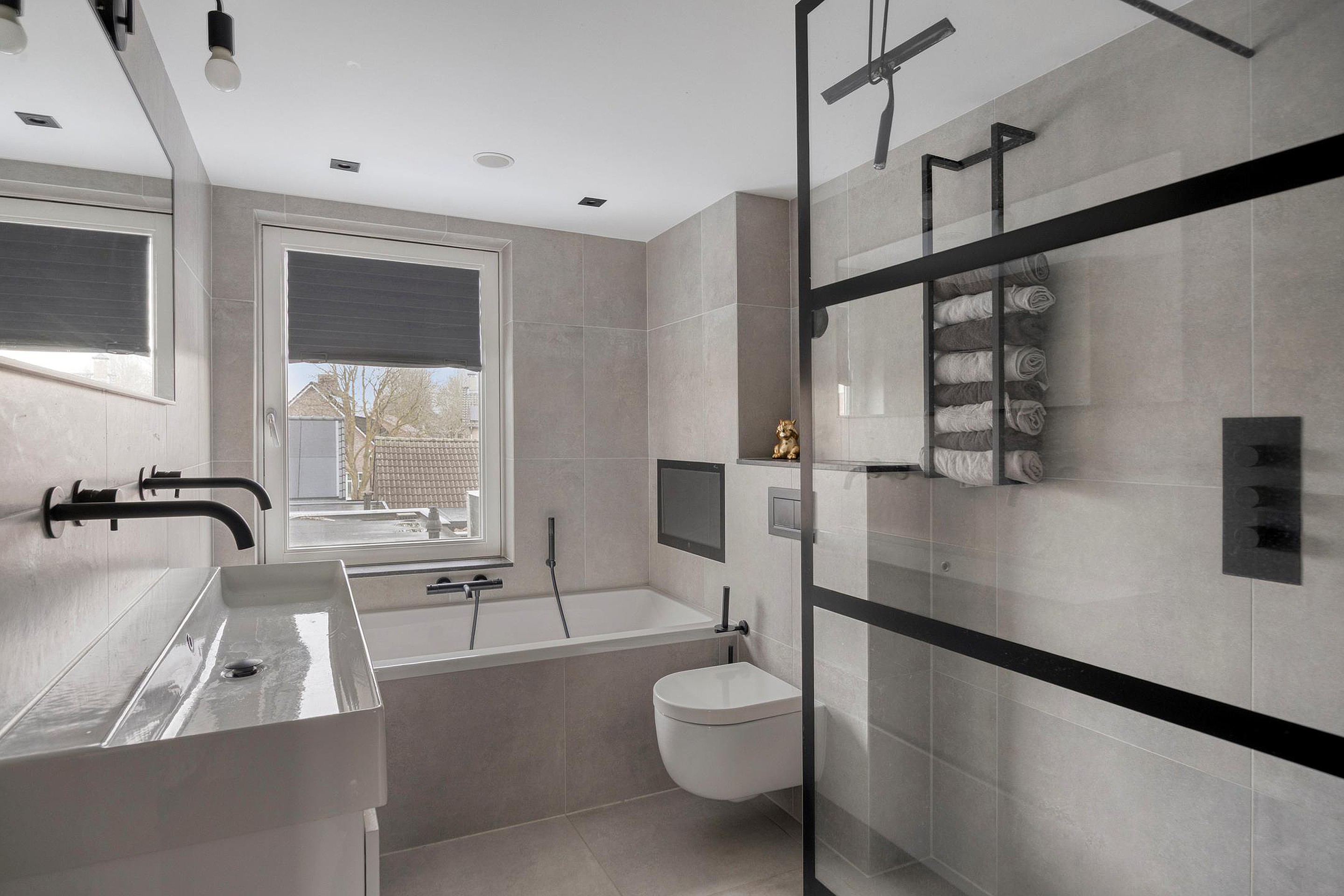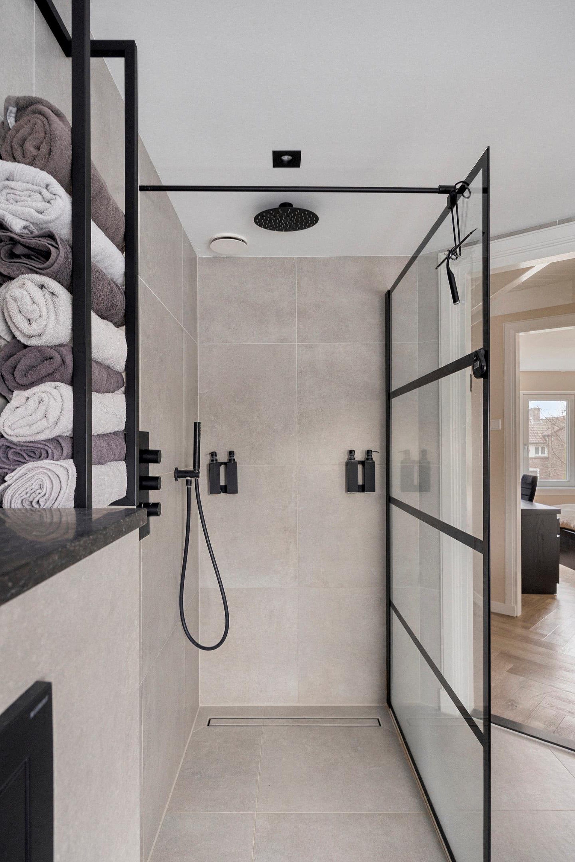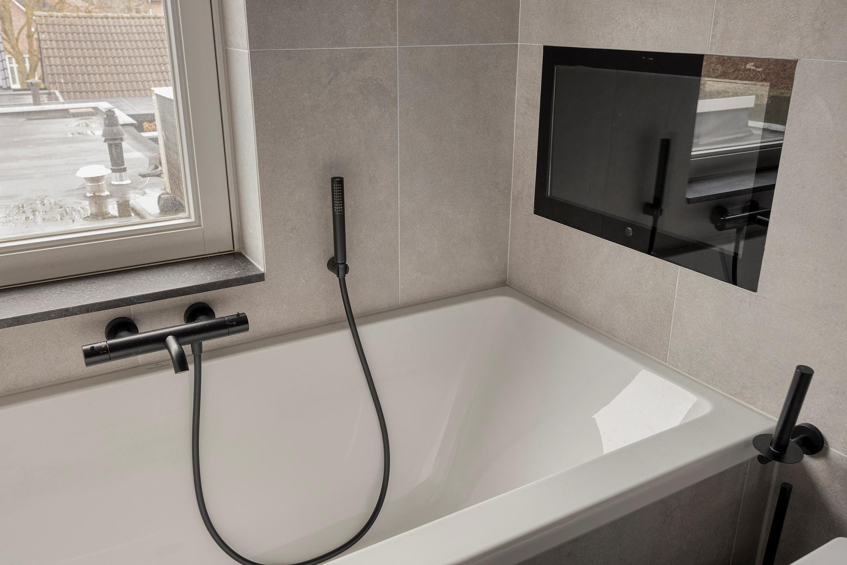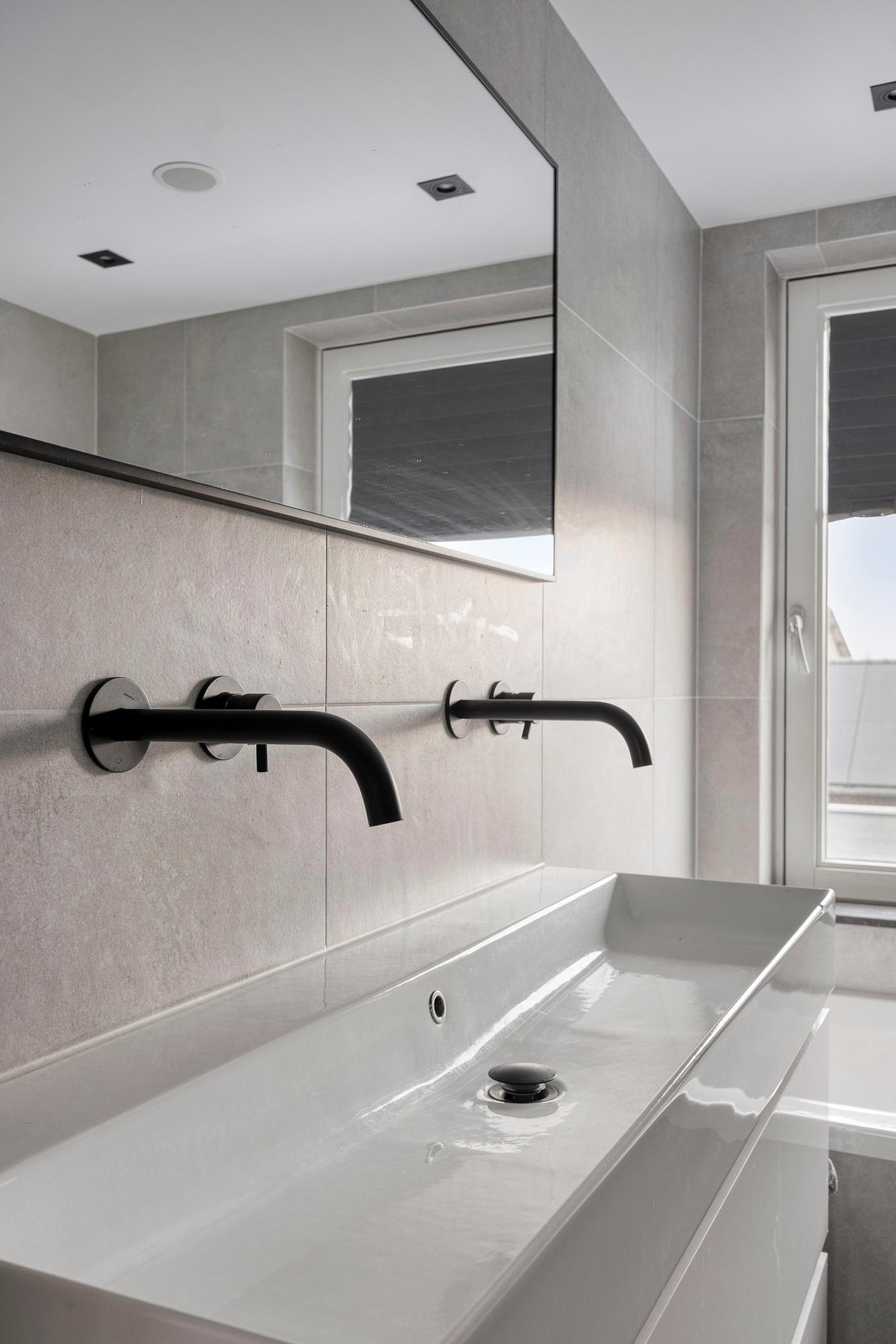 De moderne badkamer is van alle gemakken voorzien en sfeervol uitgevoerd. Hier vindt u een inloopdouche, een ligbad met geïntegreerde tv, een dubbel wastafelmeubel en mechanische afzuiging met vochtsensor. De stijlvolle mat zwarte inbouwkranen geven de ruimte een luxe, eigentijdse uitstraling — een ideale plek om de dag te beginnen of ontspannen af te sluiten.