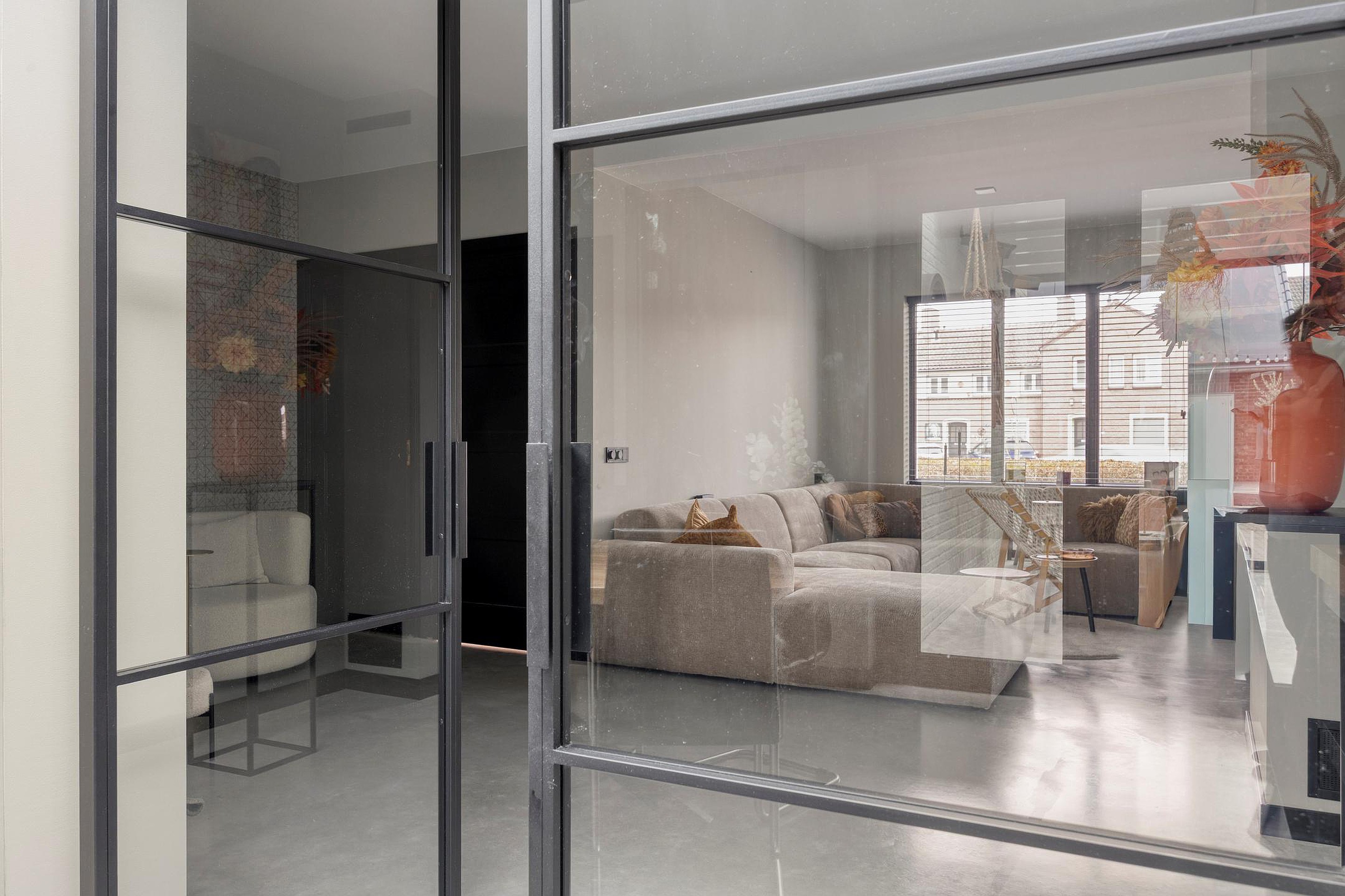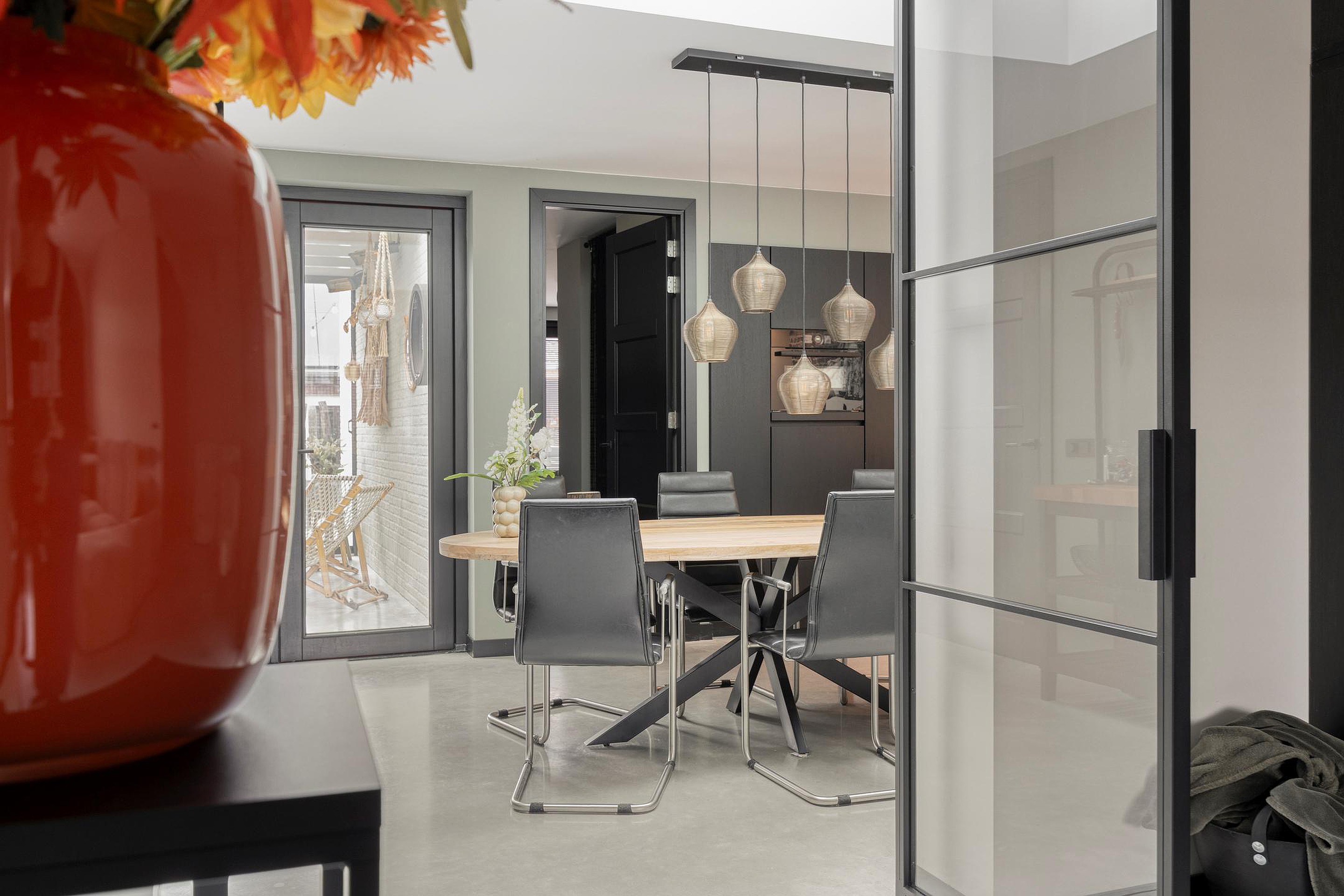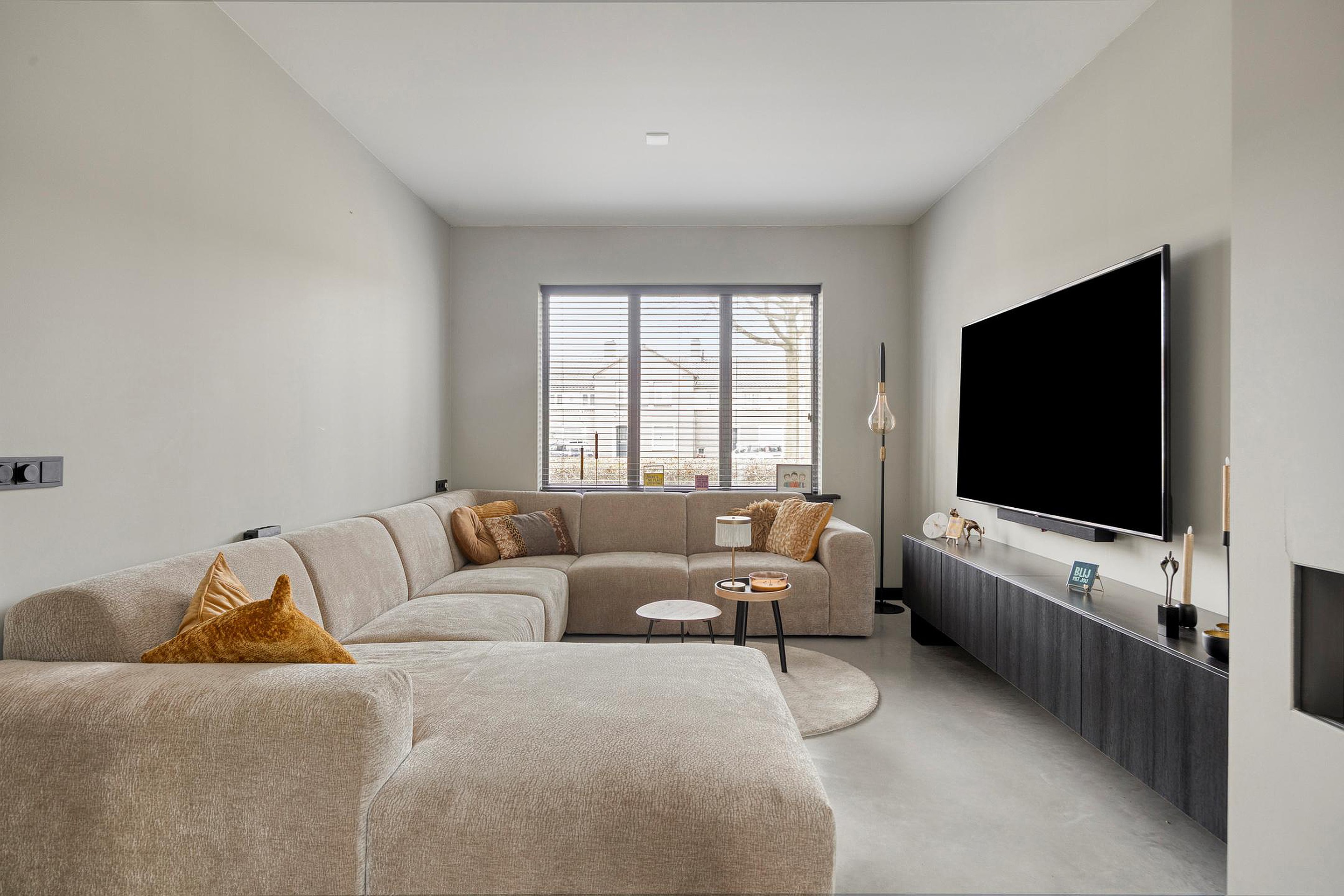 Vanuit de hal bereikt u de L-vormige woonkamer, eveneens afgewerkt met strak stucwerk. De sfeervolle gashaard vormt een warm middelpunt en benadrukt het exclusieve karakter van de ruimte. De woonkamer biedt toegang tot de woonkeuken en de kelder (standplaats water ontharder). Moderne stalen deuren scheiden woonkamer en keuken elegant van elkaar, waardoor openheid en privacy perfect in balans zijn.