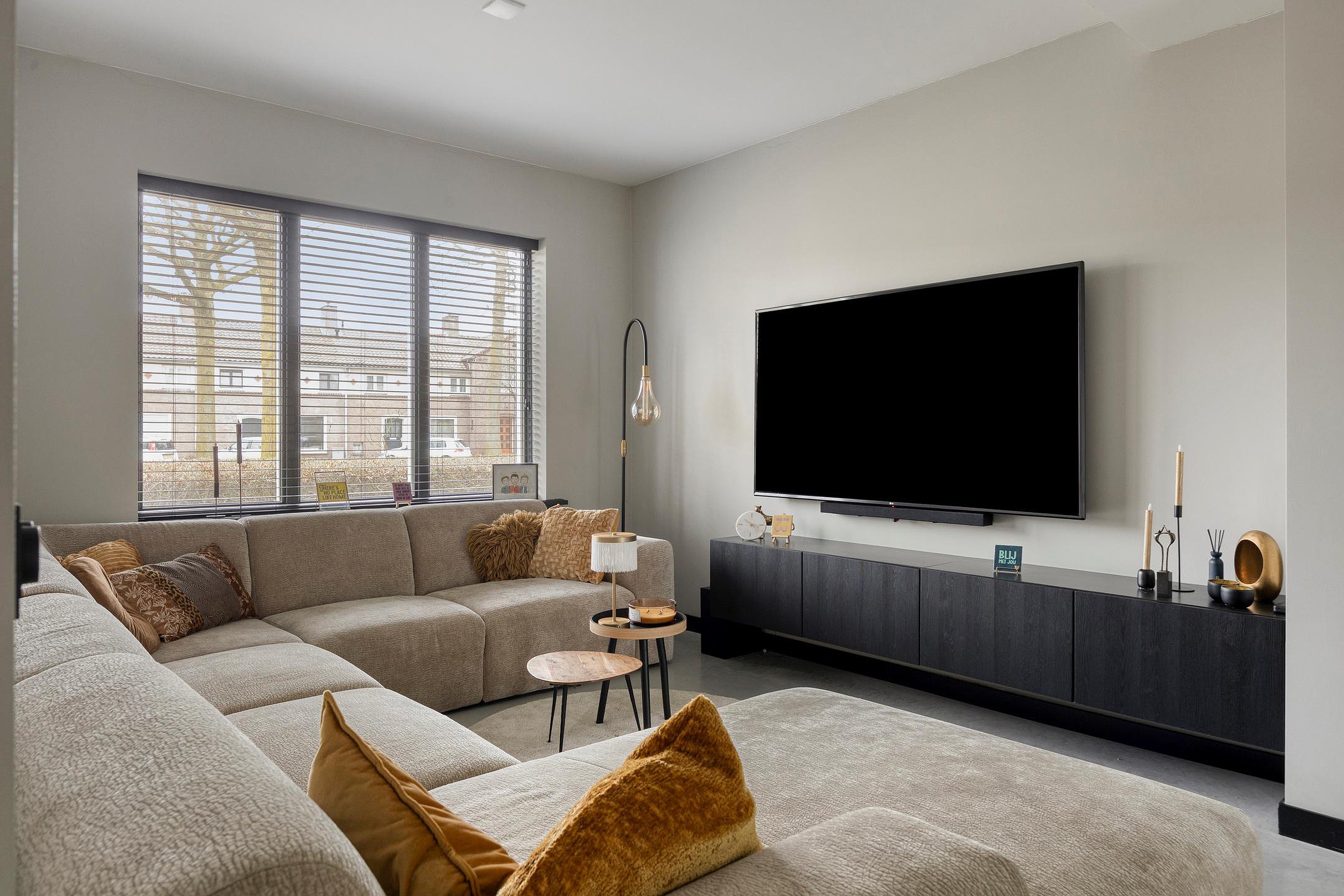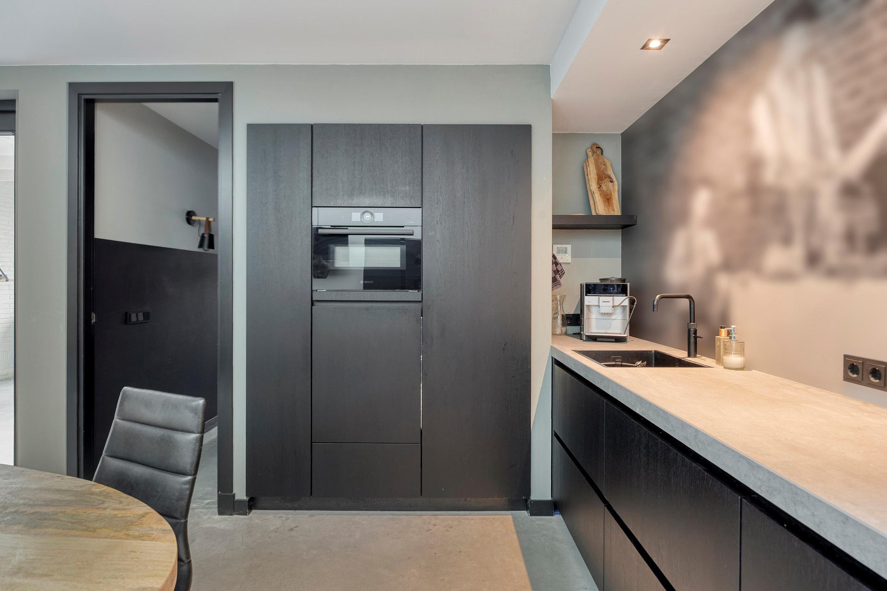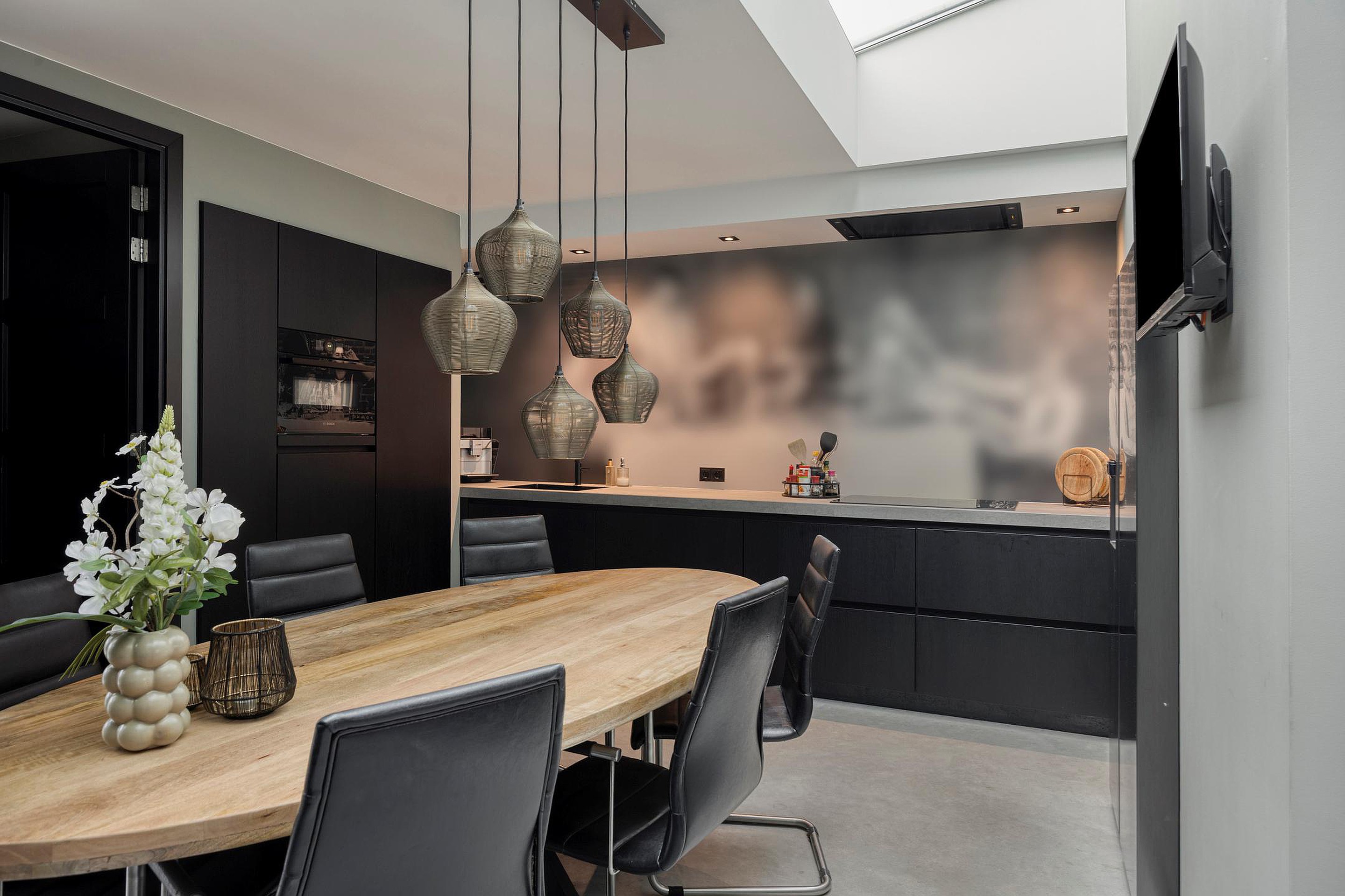 Vanuit de hal bereikt u de L-vormige woonkamer, eveneens afgewerkt met strak stucwerk. De sfeervolle gashaard vormt een warm middelpunt en benadrukt het exclusieve karakter van de ruimte. De woonkamer biedt toegang tot de woonkeuken en de kelder (standplaats water ontharder). Moderne stalen deuren scheiden woonkamer en keuken elegant van elkaar, waardoor openheid en privacy perfect in balans zijn.