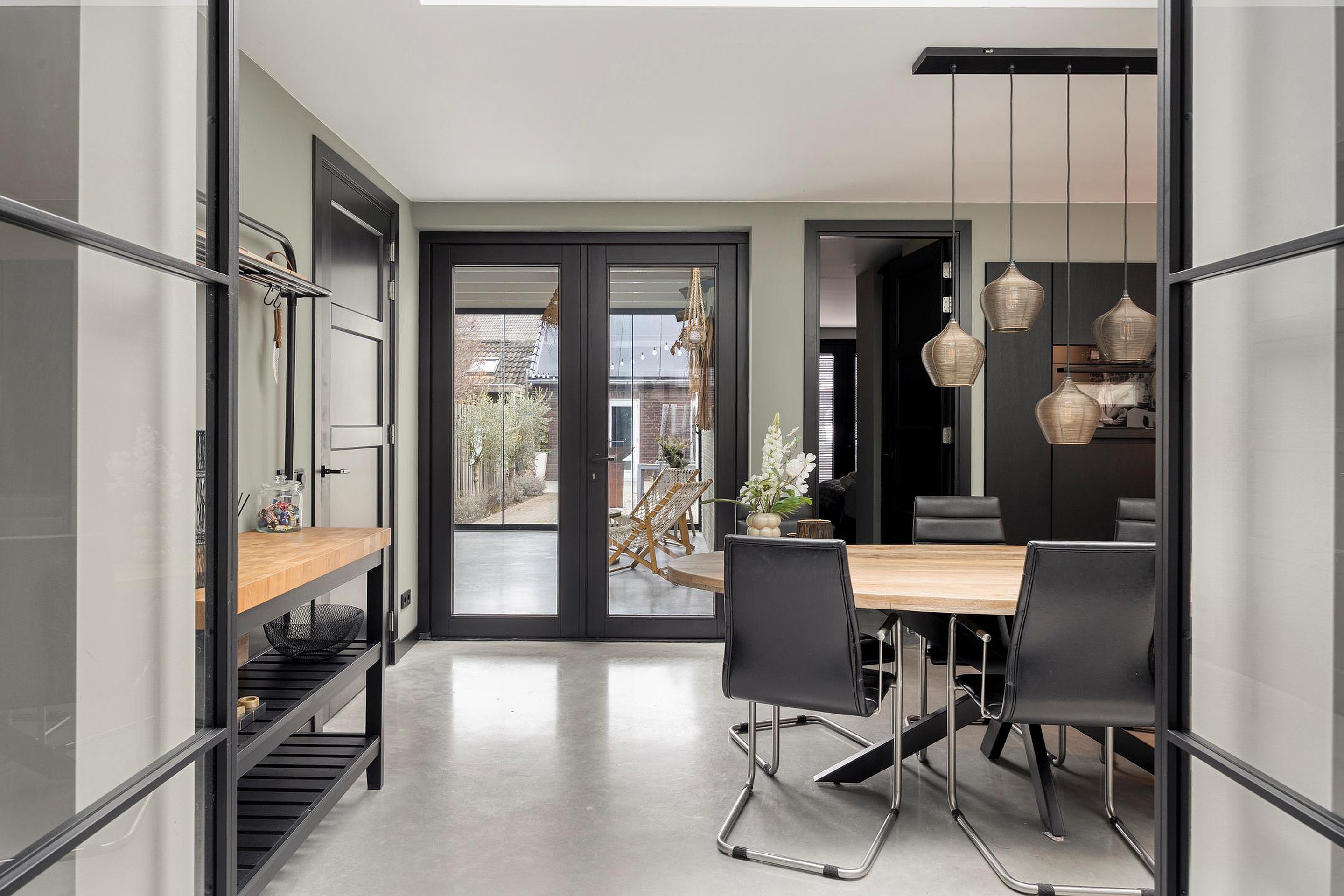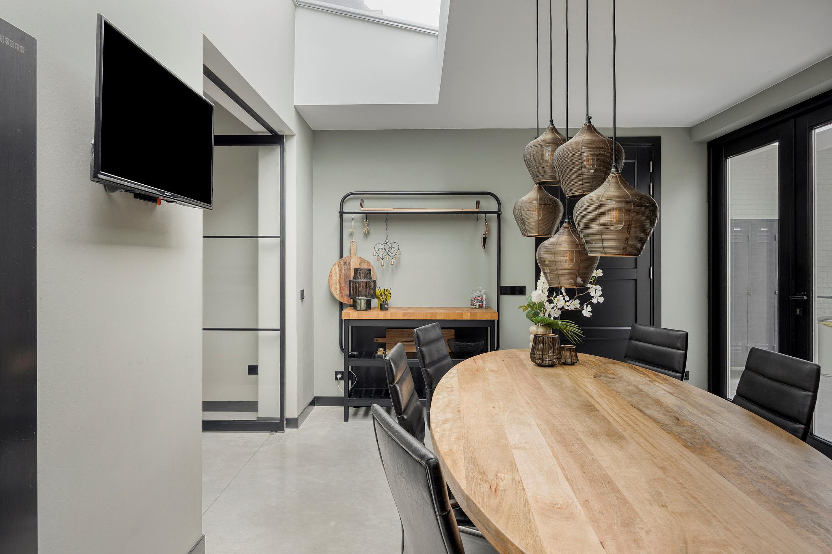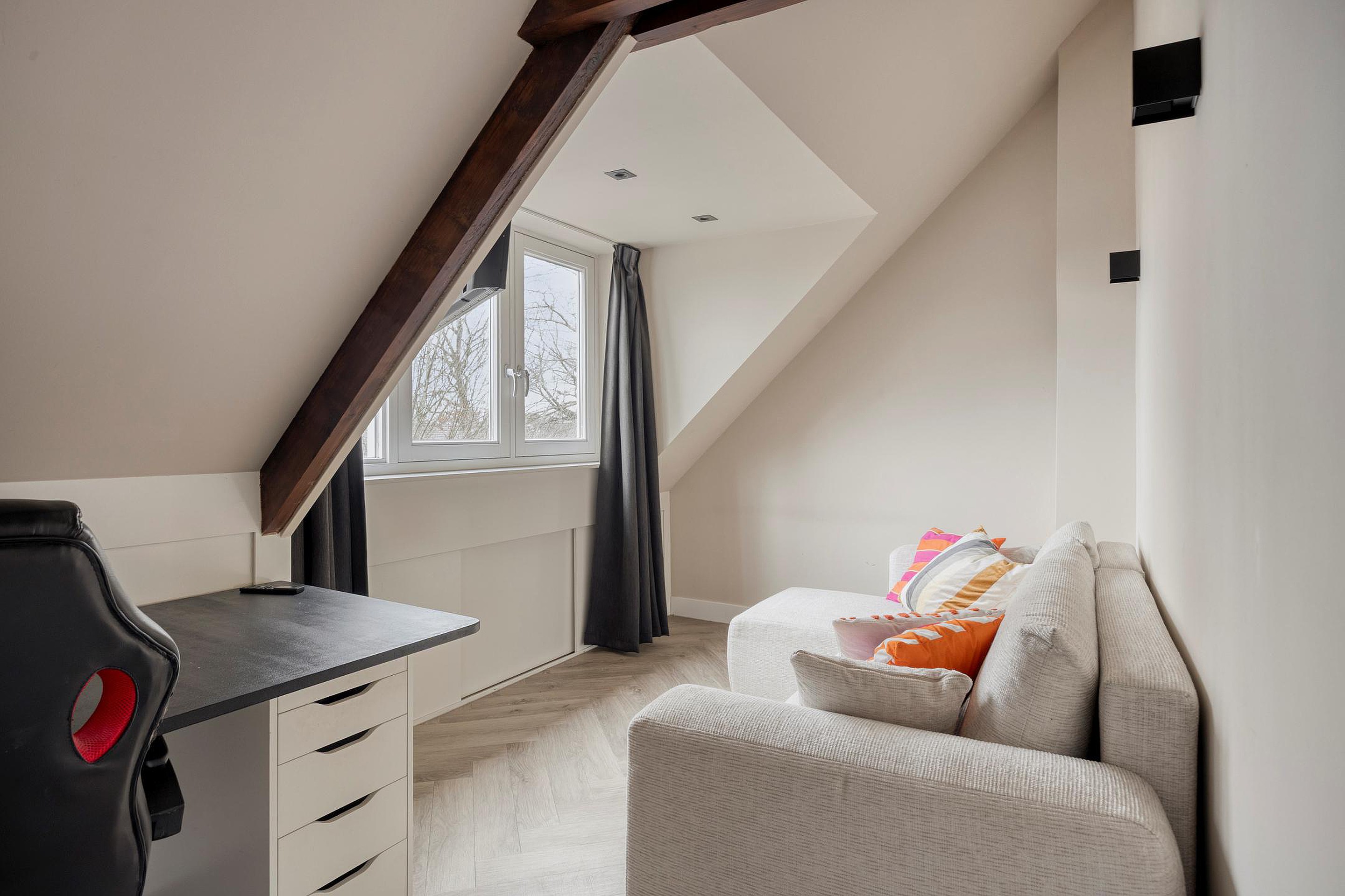 Direct naast de keuken ligt de royale tuinkamer, een lichte leefruimte dankzij de lichtstraat. De kamer is voorzien van een houtkachel, glazen schuifpui en vloerverwarming, waardoor comfort en sfeer het hele jaar door samenkomen.