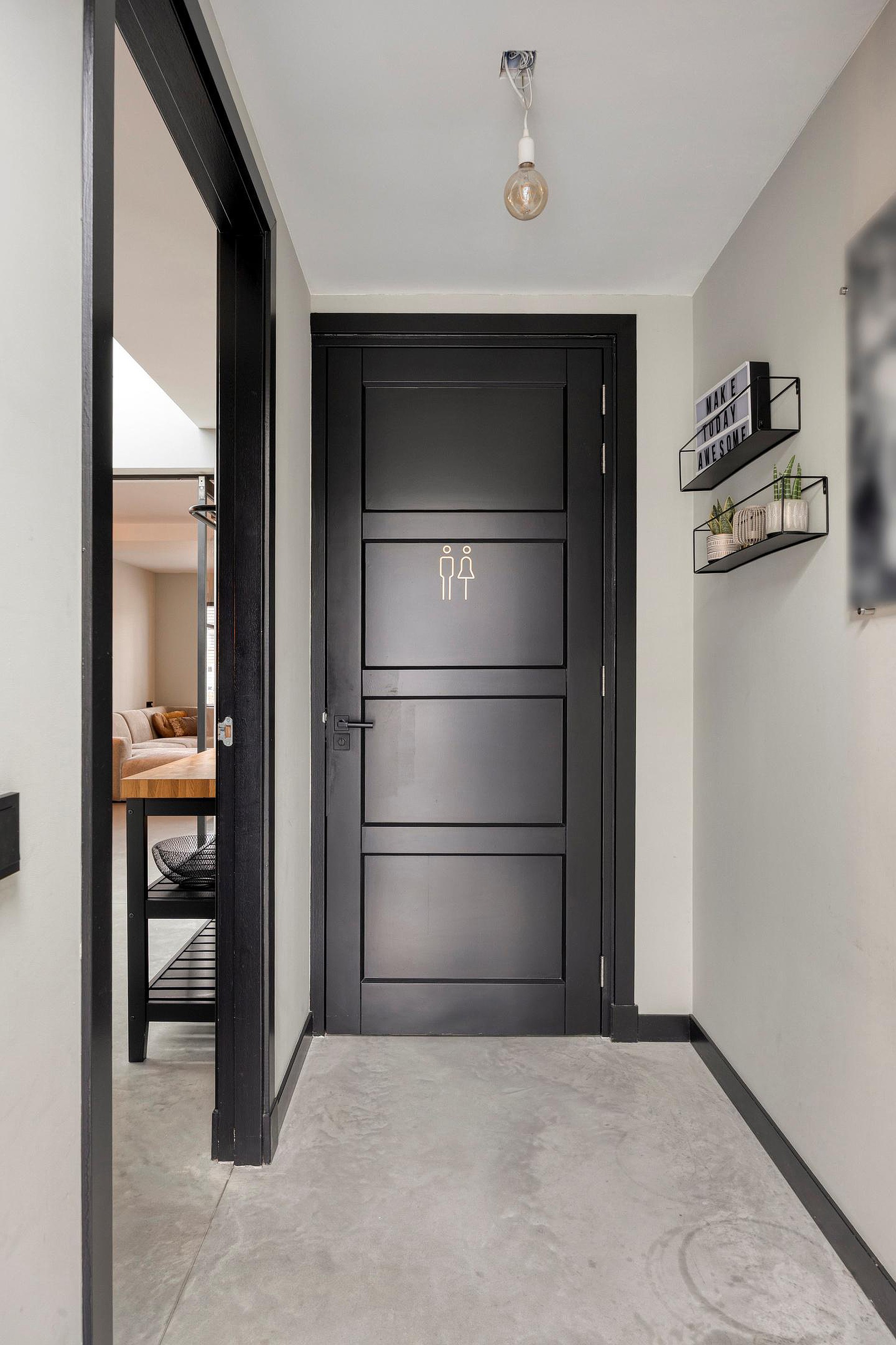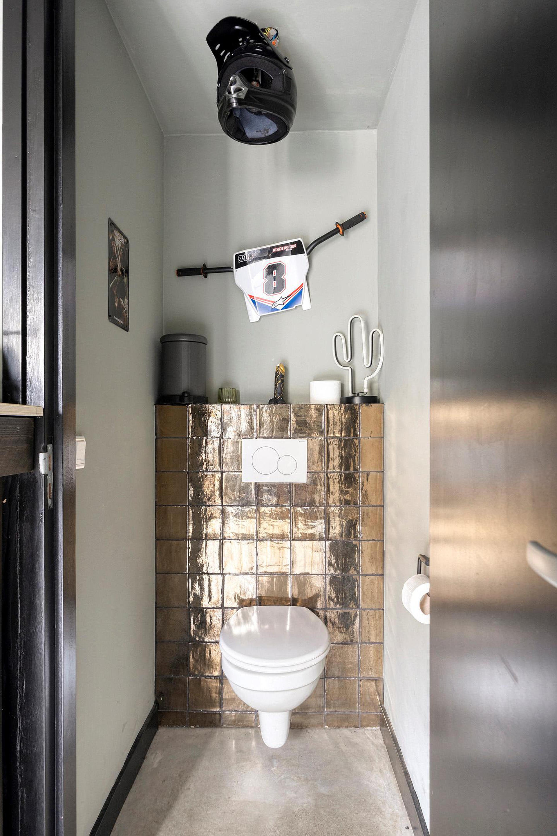 Het tochtportaal biedt toegang tot het moderne toilet, uitgevoerd met wandcloset, urinoir en een wastafel met inbouwkraan in chique rosé goud.