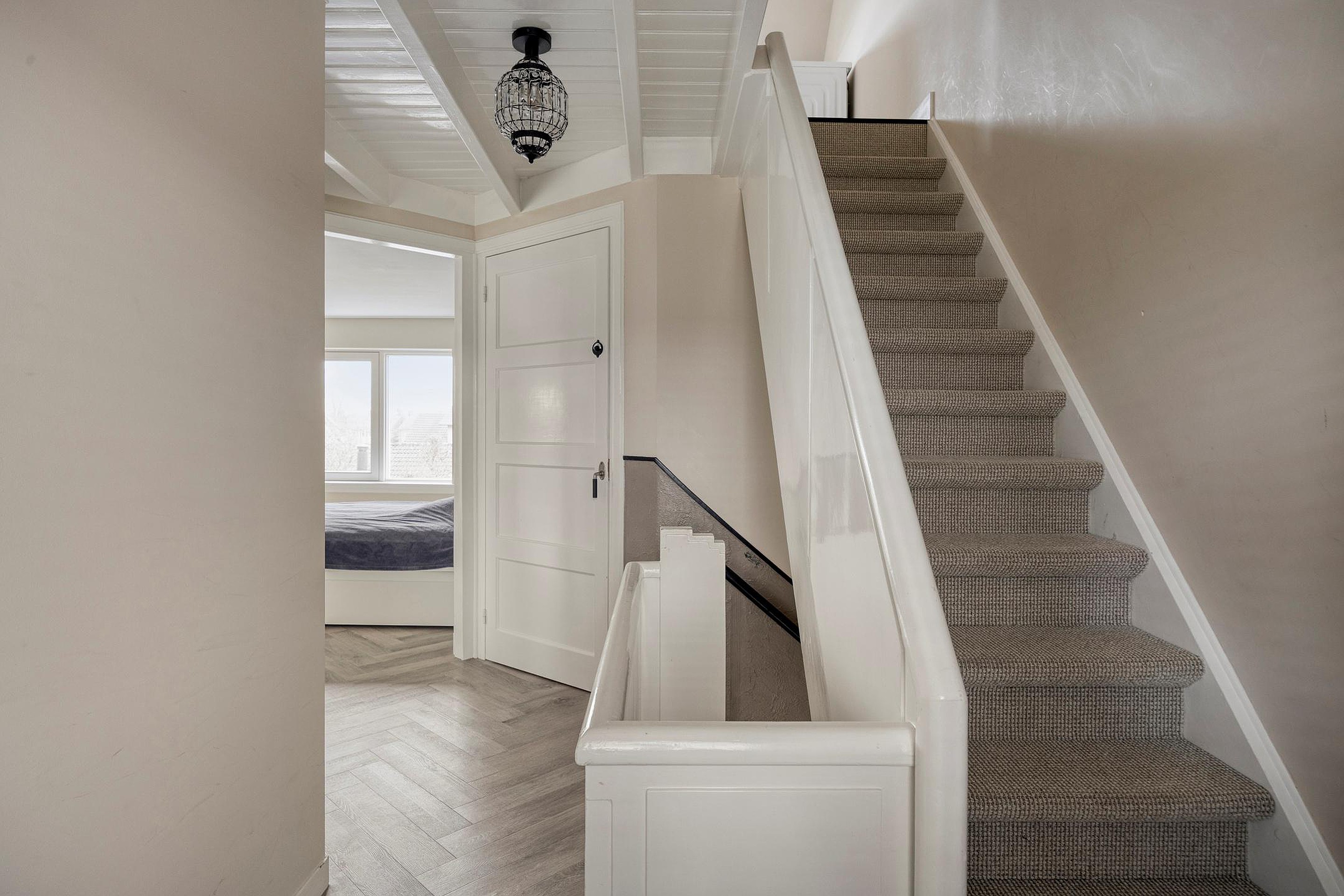 Eerste verdieping De eerste verdieping heeft een comfortabele indeling met vanaf de overloop toegang tot twee ruime slaapkamers en de badkamer. De gehele verdieping is voorzien van vloerverwarming en -koeling, wat zorgt voor een prettig binnenklimaat in elk seizoen. Beide slaapkamers zijn hoogwaardig afgewerkt met een PVC-vloer in visgraatmotief, strak gestucte wanden en plafonds.
