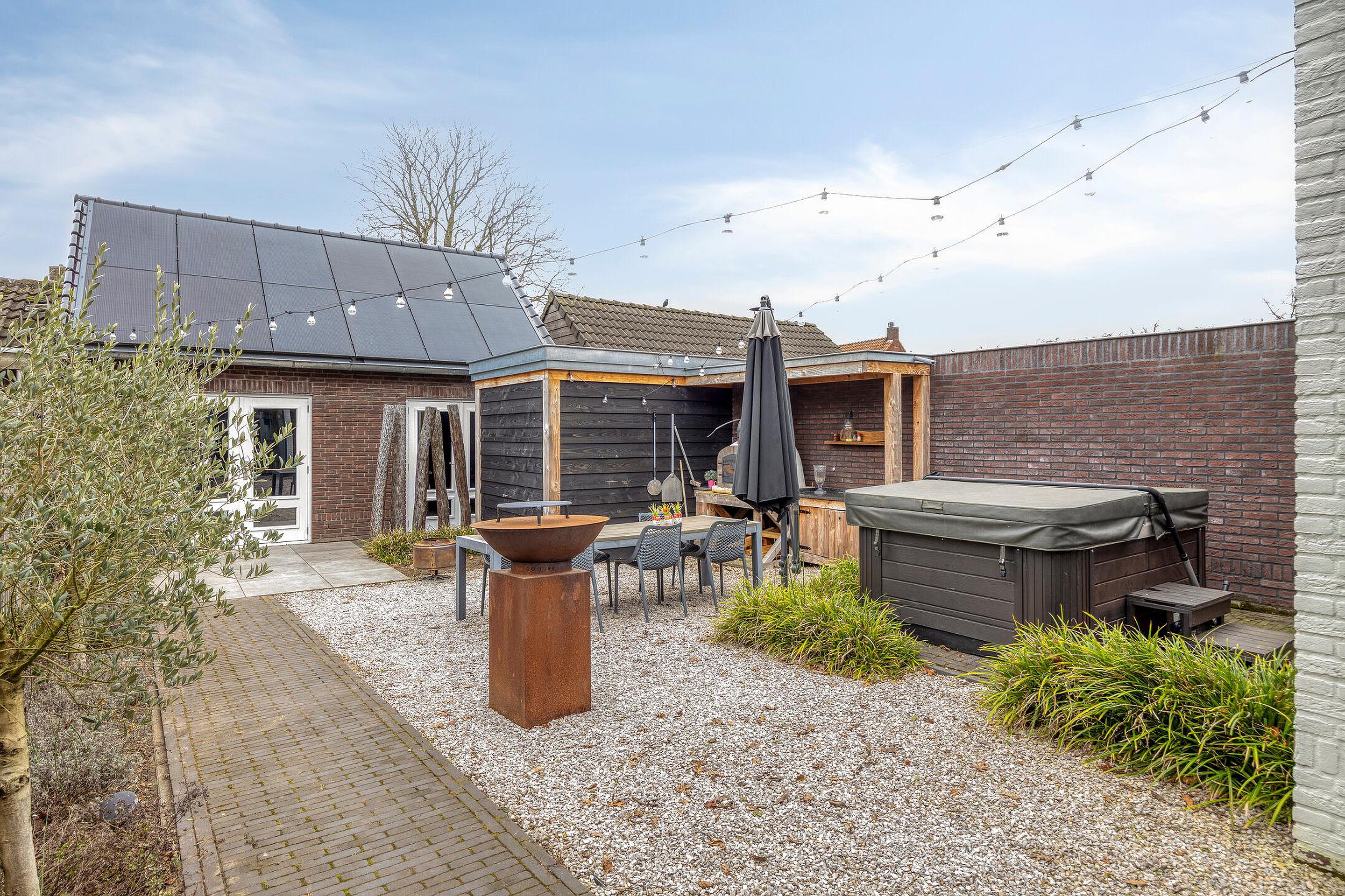 Een echte blikvanger is de buitenkeuken, compleet met pizzaoven — ideaal voor gezellige avonden met familie en vrienden. De tuin biedt directe toegang tot de garage en beschikt tevens over een praktische achterom. Een stijlvolle en veelzijdige buitenruimte waar het hele jaar door van het buitenleven genoten kan worden.
