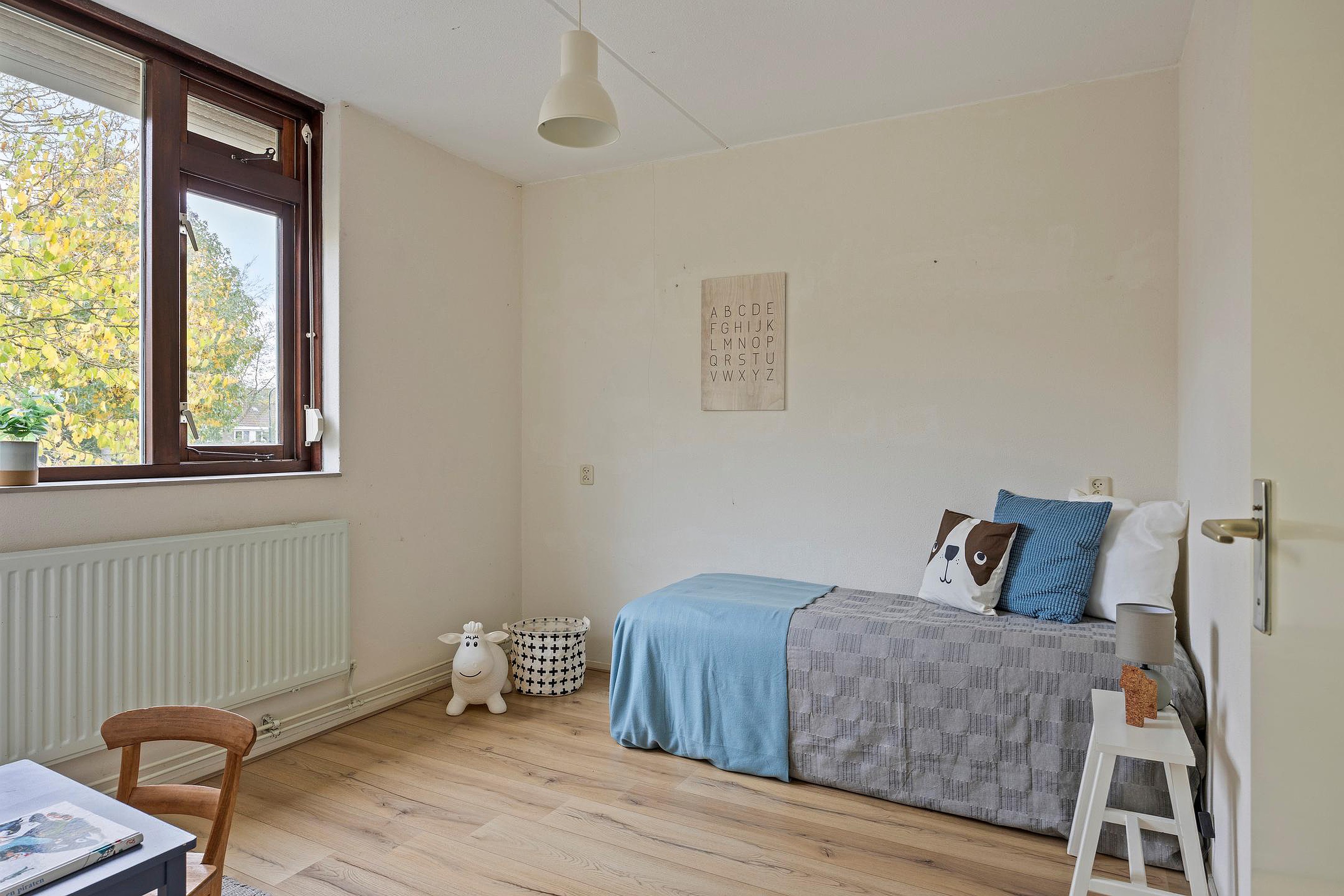 Aan de voorzijde de derde ruime slaapkamer, eveneens voorzien van groot raam en handbediend rolluik.