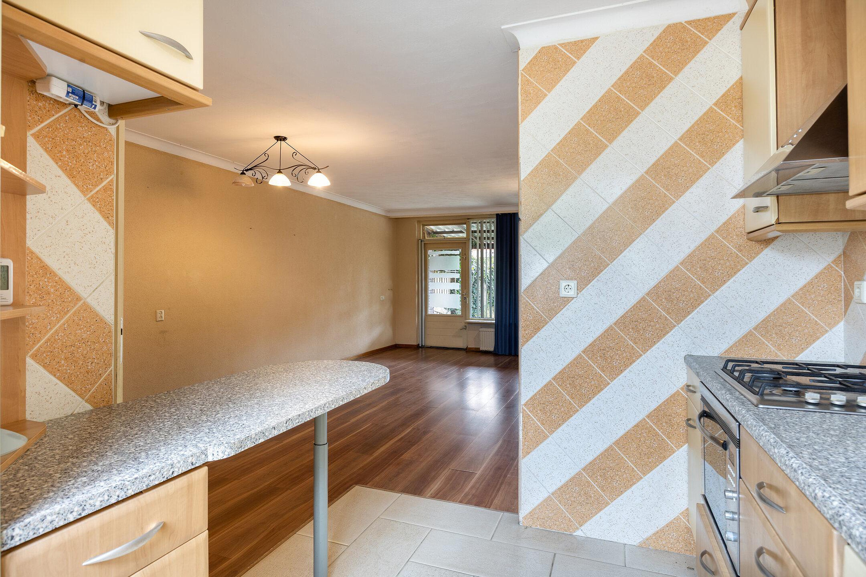 Begane grond U betreedt de woning via de hal met meterkast, praktische bergkast en een deels betegeld toilet met fonteintje en te openen raam. Vanuit hier heeft u toegang tot de inpandige berging en de woonkamer. De berging, voorzien van elektra en ook bereikbaar via de oprit, is ideaal voor het stallen van fietsen of extra opslag. De tuingerichte woonkamer is heerlijk licht dankzij de grote raampartijen en biedt toegang tot het terras in de achtertuin. De ruimte is afgewerkt met een laminaatvloer en strak stucwerk op wanden en plafonds. De halfopen keuken in lengterichting is praktisch ingedeeld en uitgerust met diverse kasten, een kunststof werkblad, 4-pits gaskookstel, afzuigkap, combi-oven, koelkast en vaatwasser.