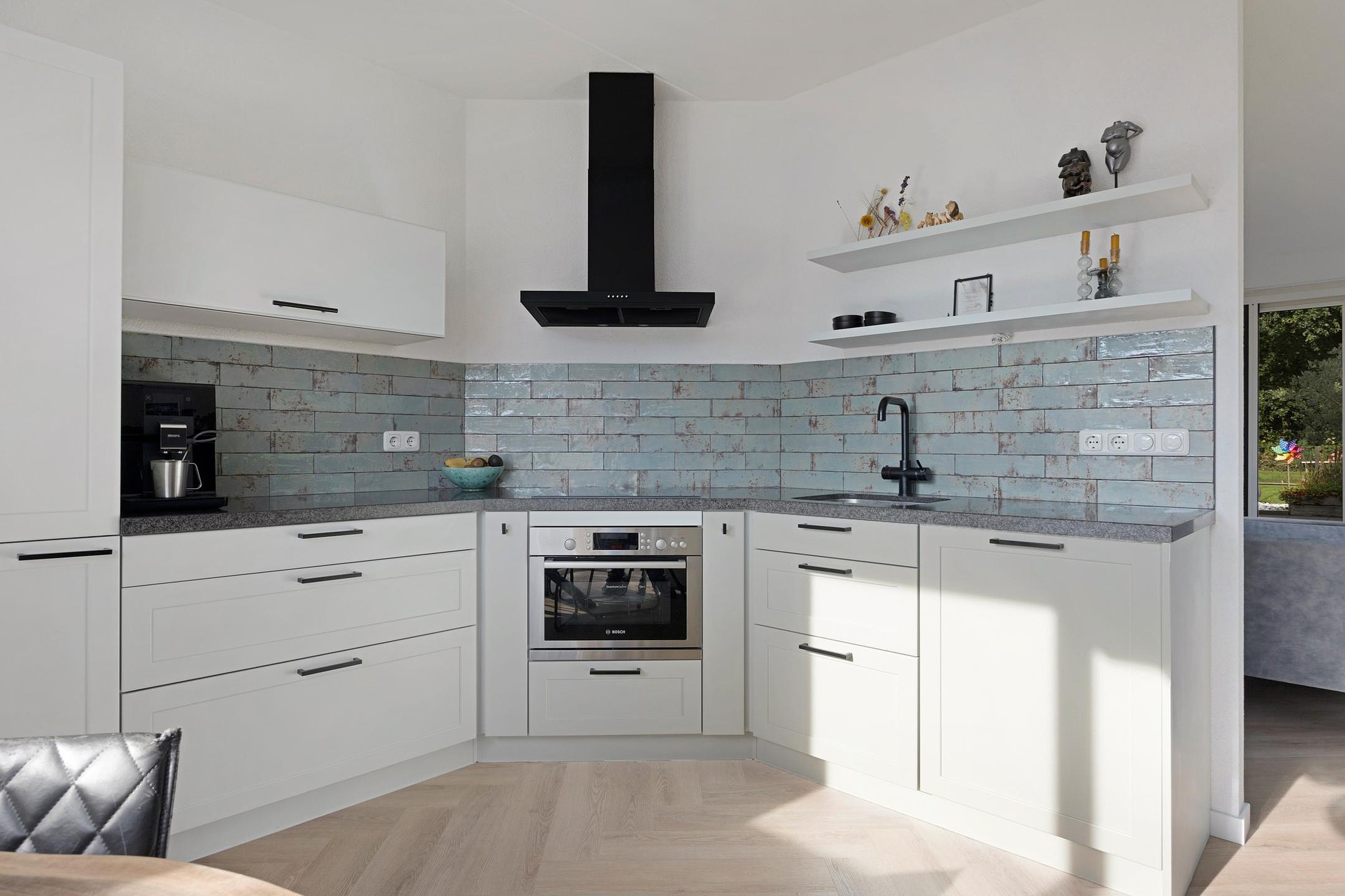 Aan de voorkant vind je de moderne open keuken. Koken wordt een feestje met onder meer een inductiekookplaat, afzuiging, koel-/vriescombinatie, vaatwasser, combimagnetron en – voor de liefhebber – een superhandige kokend waterkraan. Je hebt het allemaal bij de hand!