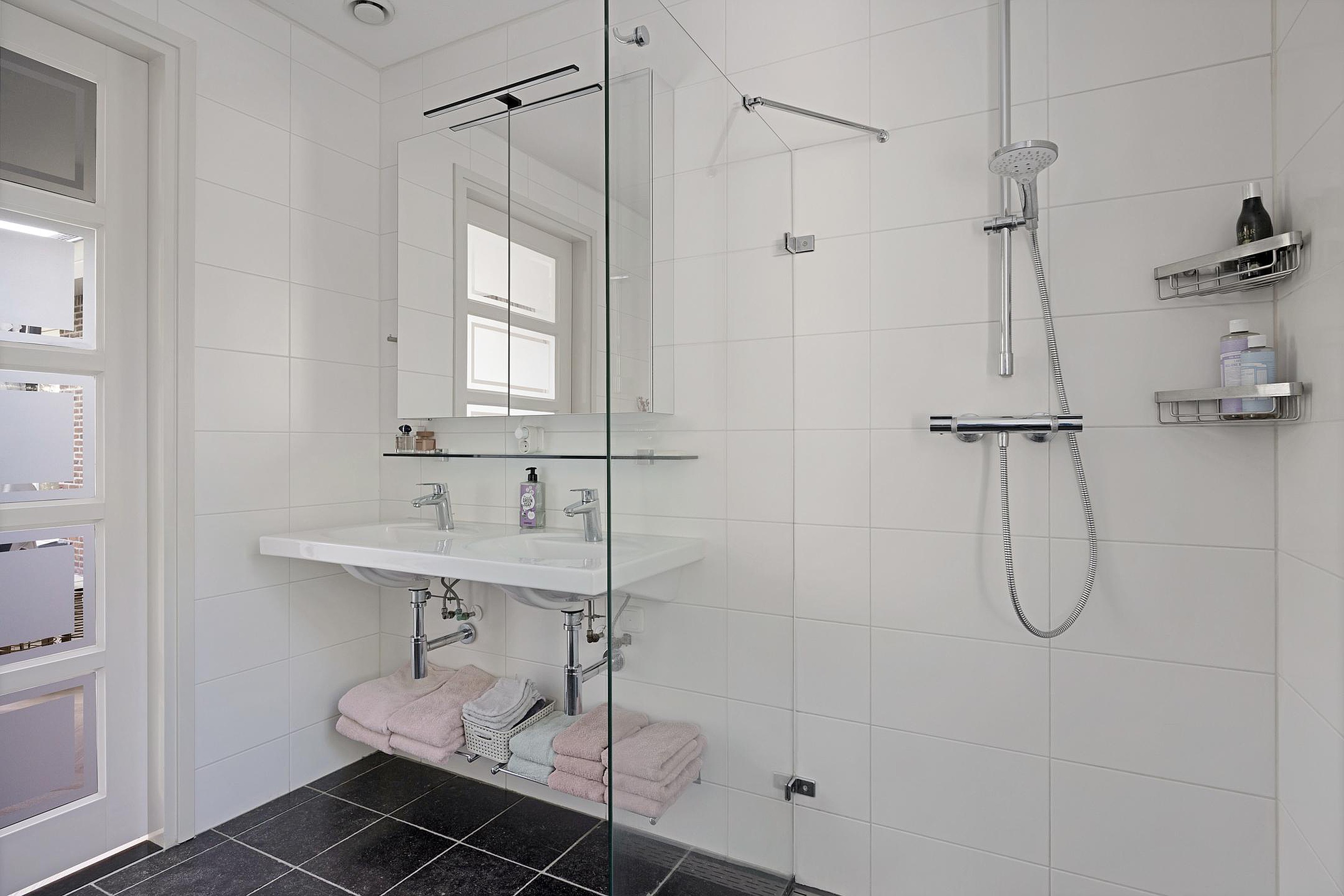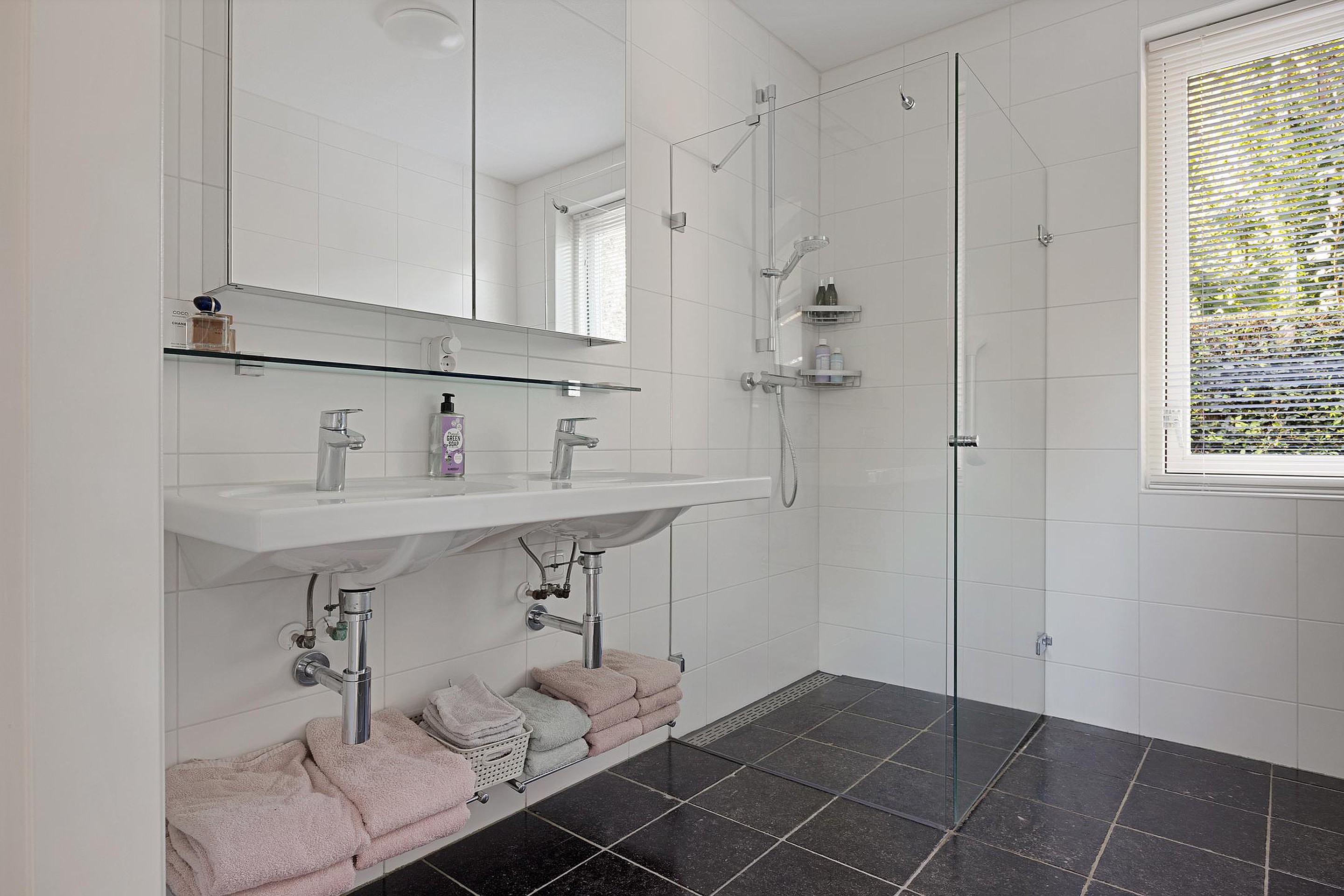 Nog verder op de begane grond ontdek je een gang met toegang tot twéé ruime slaapkamers én een complete, luxe badkamer. Je vindt er een heerlijke inloopdouche, fraaie wastafel, tweede wandcloset, een modern wandmeubel en een designradiator. Hier kun je je dag pas echt fijn beginnen of juist ontspannen afsluiten na een lange dag.