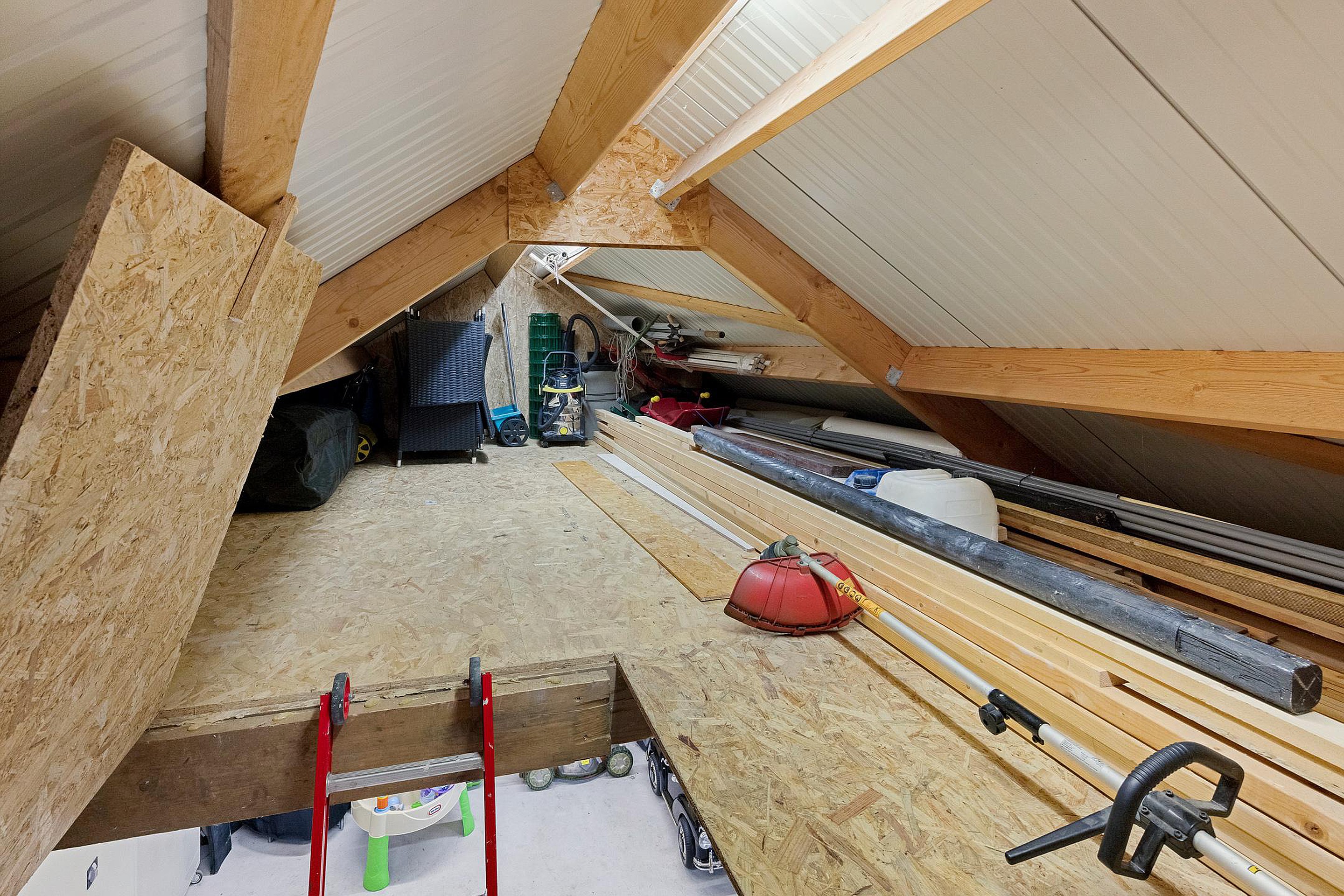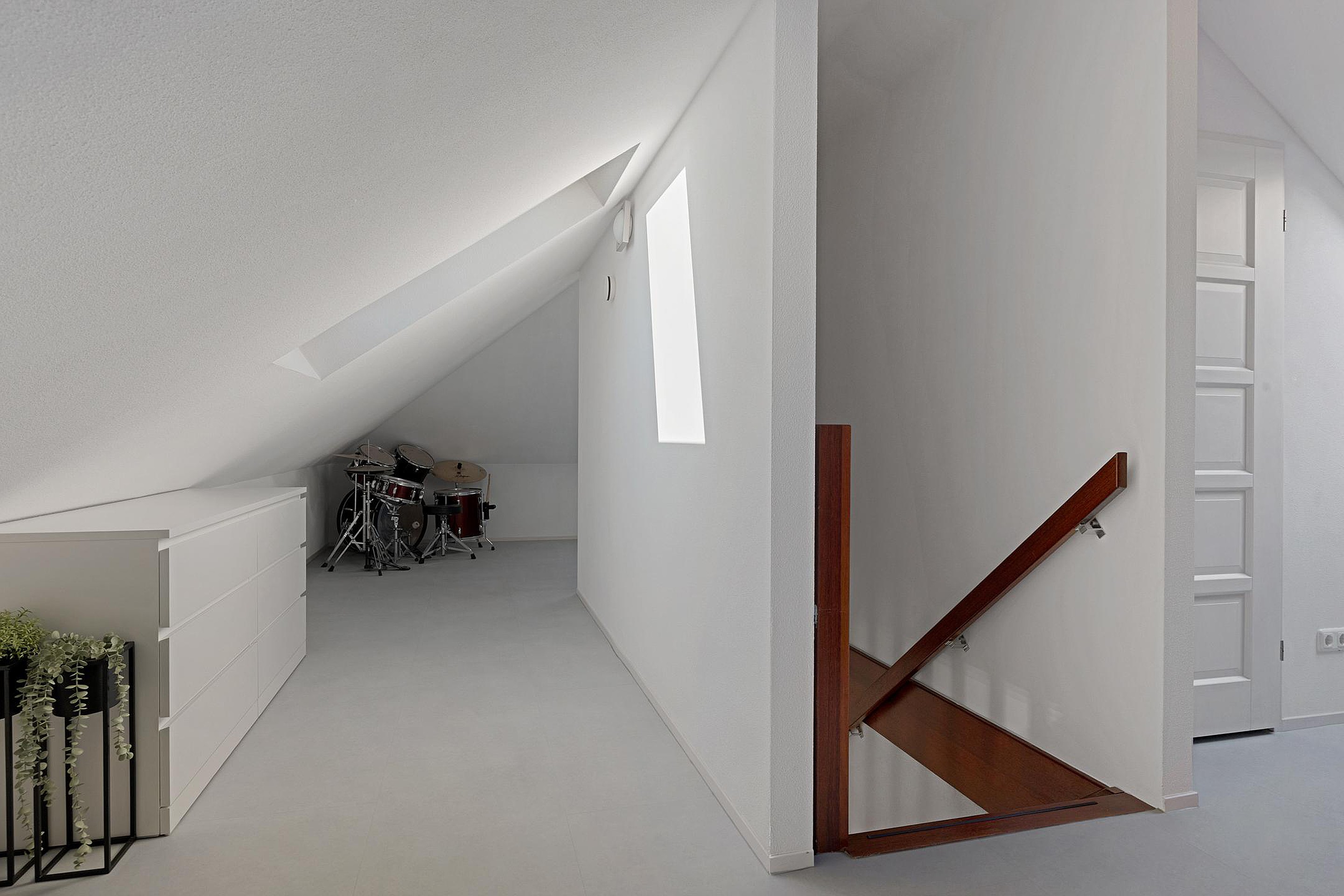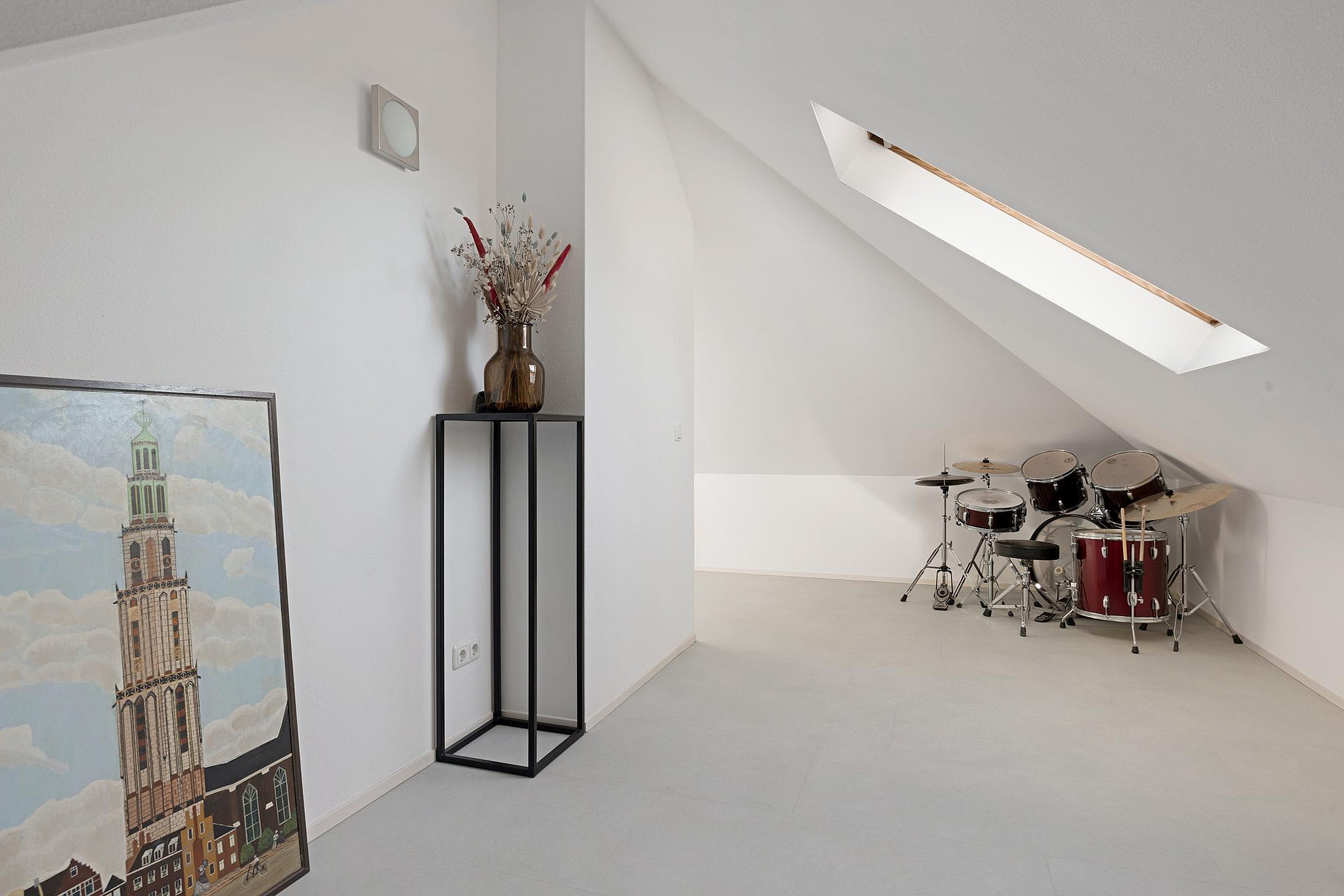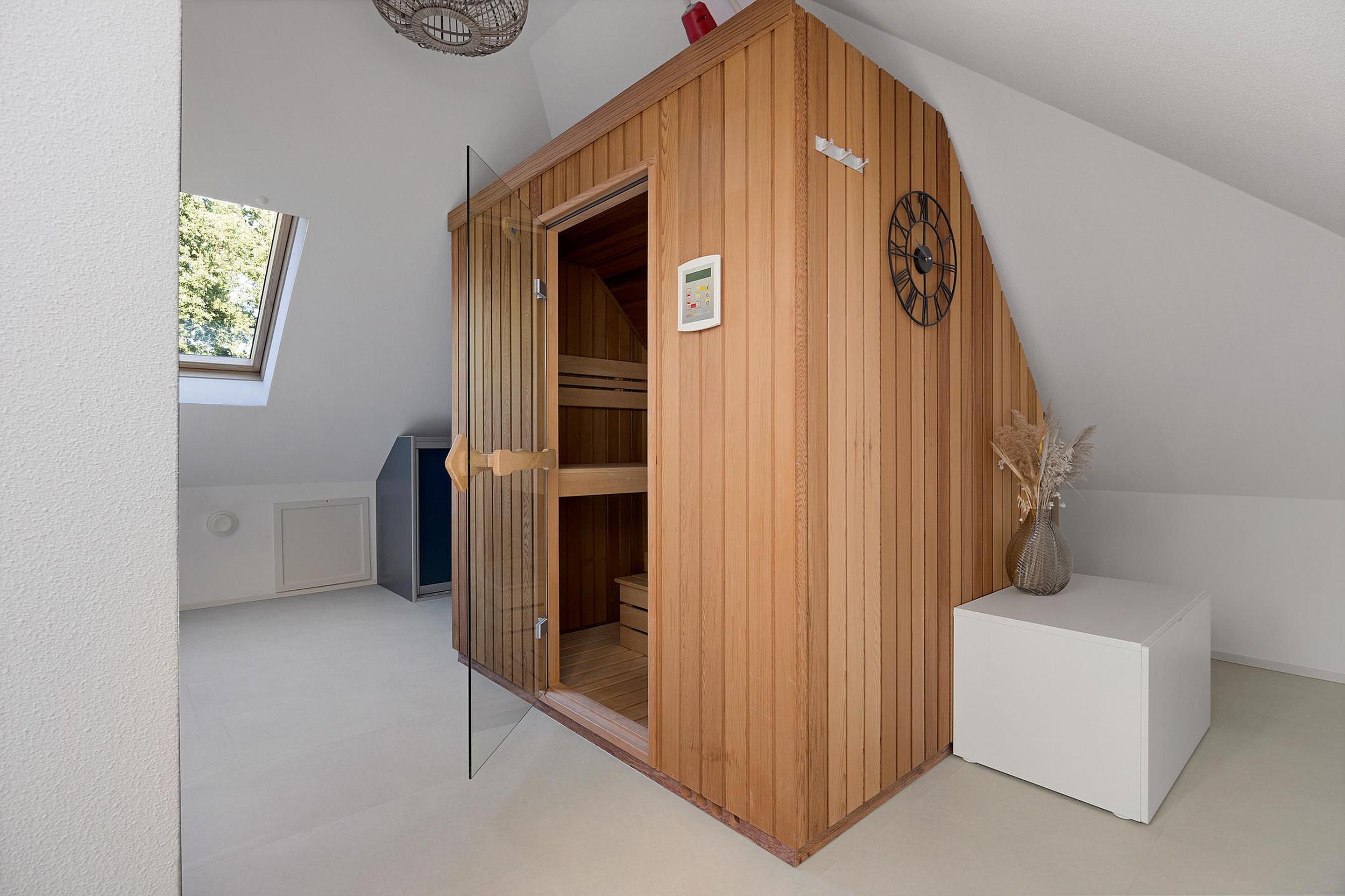Eerste verdieping En dan is er nog de verdieping. Via de trapopgang bereik je de overloop met een sauna en een tweede badkamer – zó praktisch als je logés of (grotere) kinderen hebt. Deze badkamer heeft een eigen douchecabine en wastafel, zodat iedereen z’n eigen plekje heeft. Daarnaast vind je nog een derde ruime slaapkamer, ideaal als ouderslaapkamer, werkkamer of hobbyruimte – aan jou de keuze. Aansluitend de zolderberging voor de spullen die je toch eigenlijk niet weg wil doen.